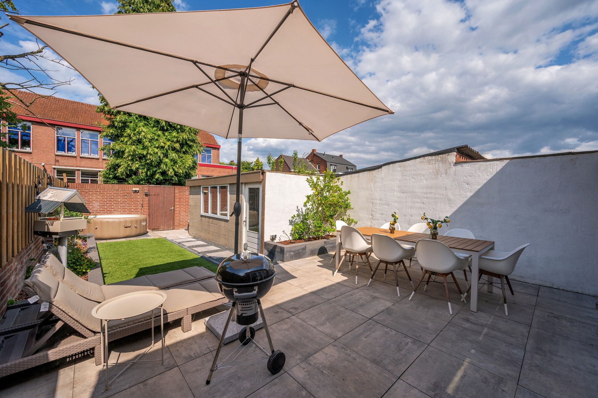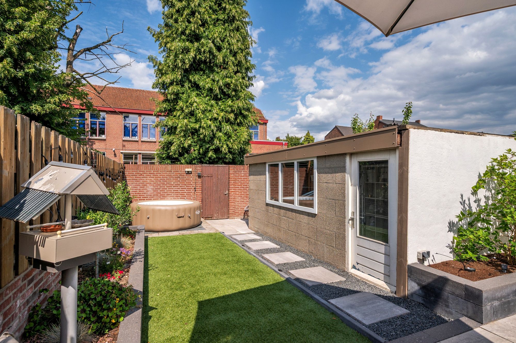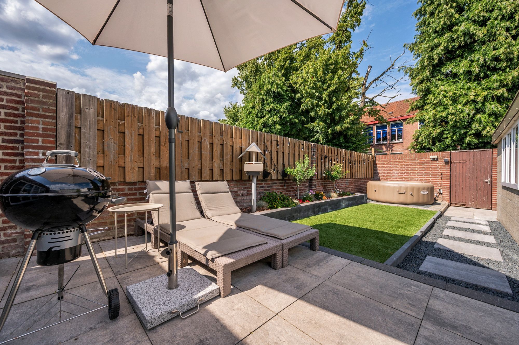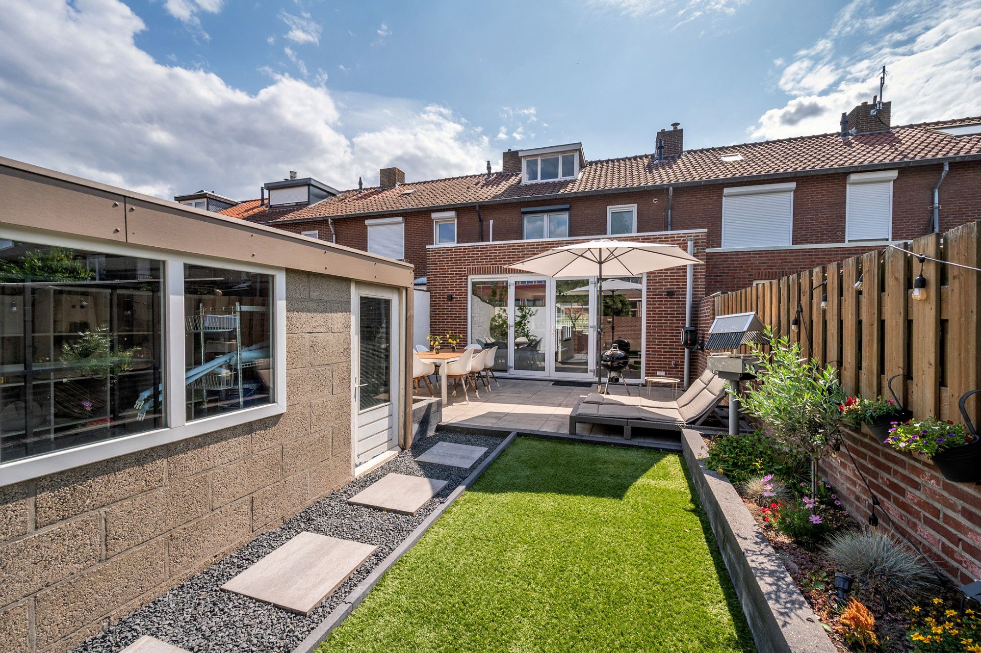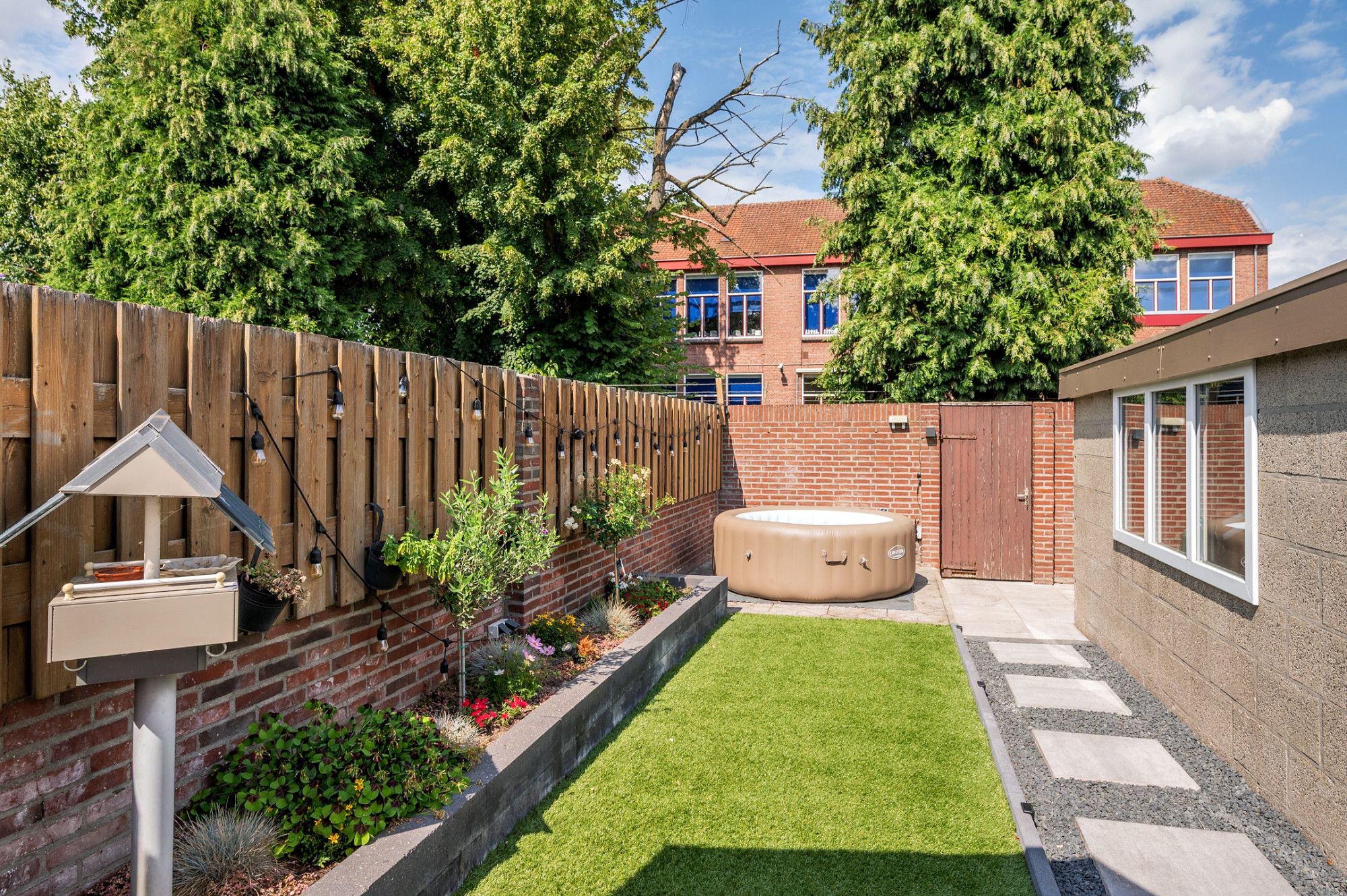 De onderhoudsvriendelijke tuin is op het noordoosten gelegen en beschikt over een eigen achterom De achtertuin is voorzien van een groot terras met natuurstenen tegels, aan de achterzijde kunstgras, met beplanting, een stenen berging en een 2e terras.