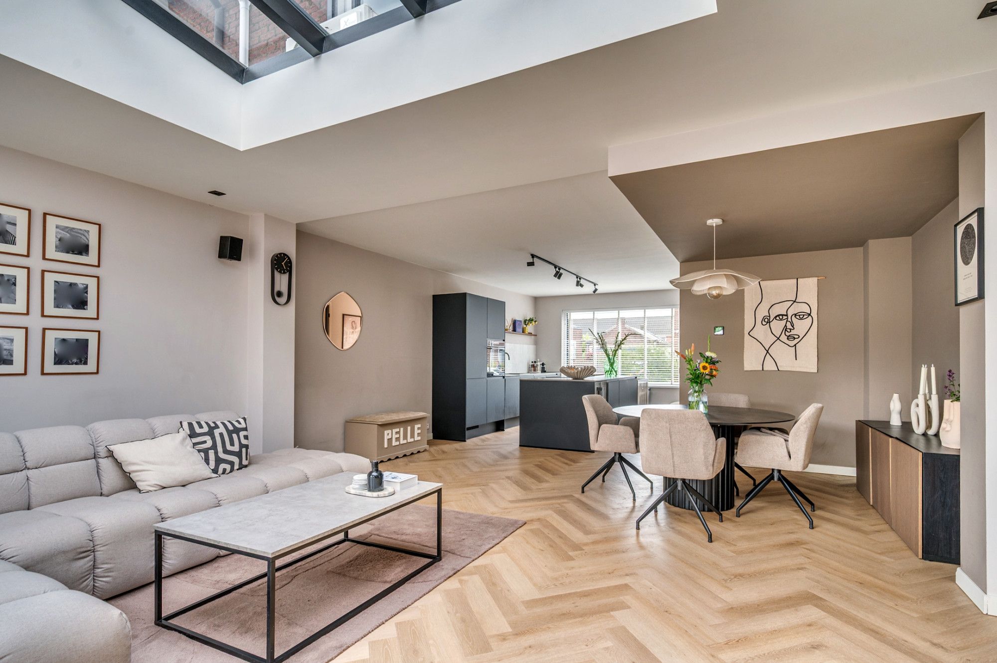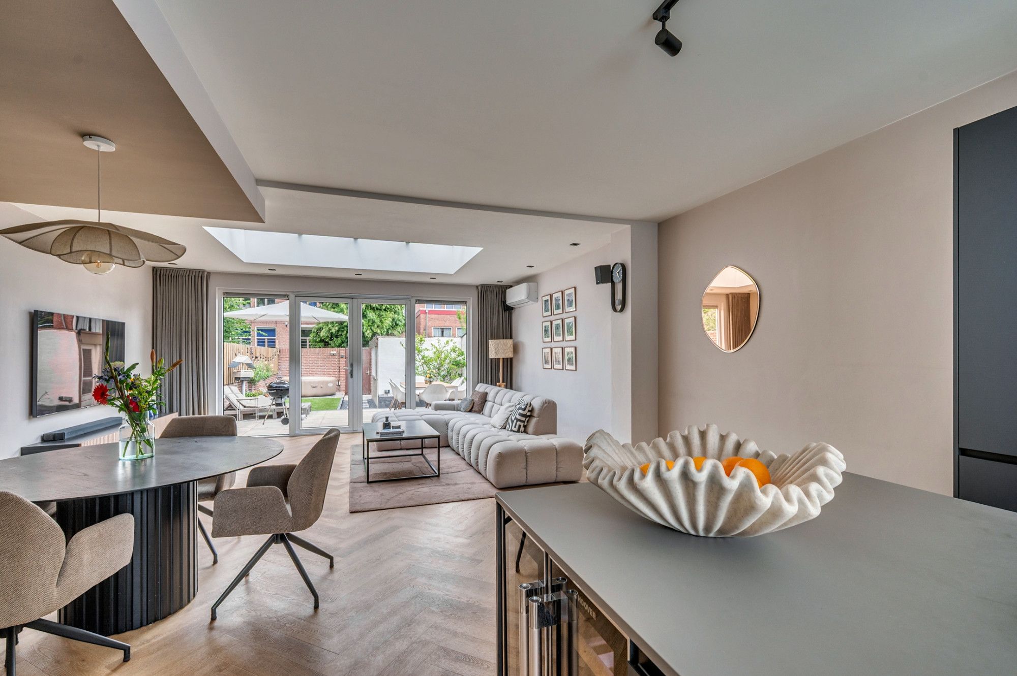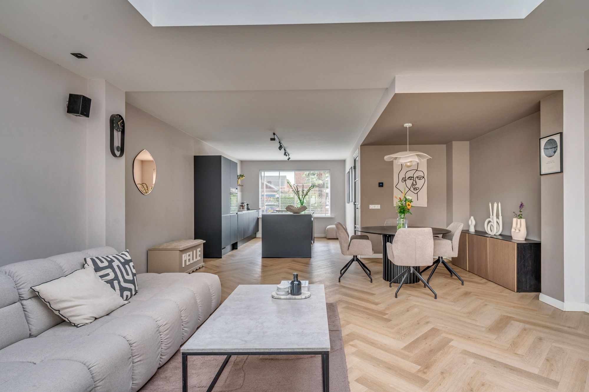 Middels een betegeld pad is de entree te betreden. De ontvangsthal met garderobe geeft toegang tot de toiletruimte, meterkast, trapopgang naar de verdieping, trapgang naar de kelder en woonkamer. De separate toiletruimte is deels betegeld en voorzien van een zwevend toilet, fonteintje en buitenraam. De zeer ruime doorzonwoonkamer is voorzien van vloerverwarming, open keuken en loopdeur naar de tuin. De moderne keuken is aan de voorzijde gelegen en is voorzien van een kookeiland, inductiekookplaat met interne afzuiging, combi oven/ magnetron, vaatwasmachine, koelkast, diepvries, wijnkoelkast (inbouw) en ontzettend veel opbergruimte. De zithoek is aan de achterzijde gelegen. Hier is in de aanbouw een lichtstraat gerealiseerd wat voor zeer veel natuurlijk lichtinval zorgt. Verder heeft de woonkamer de beschikking over een airco. De gehele begane grond is voorzien van een visgraad pvc vloer.