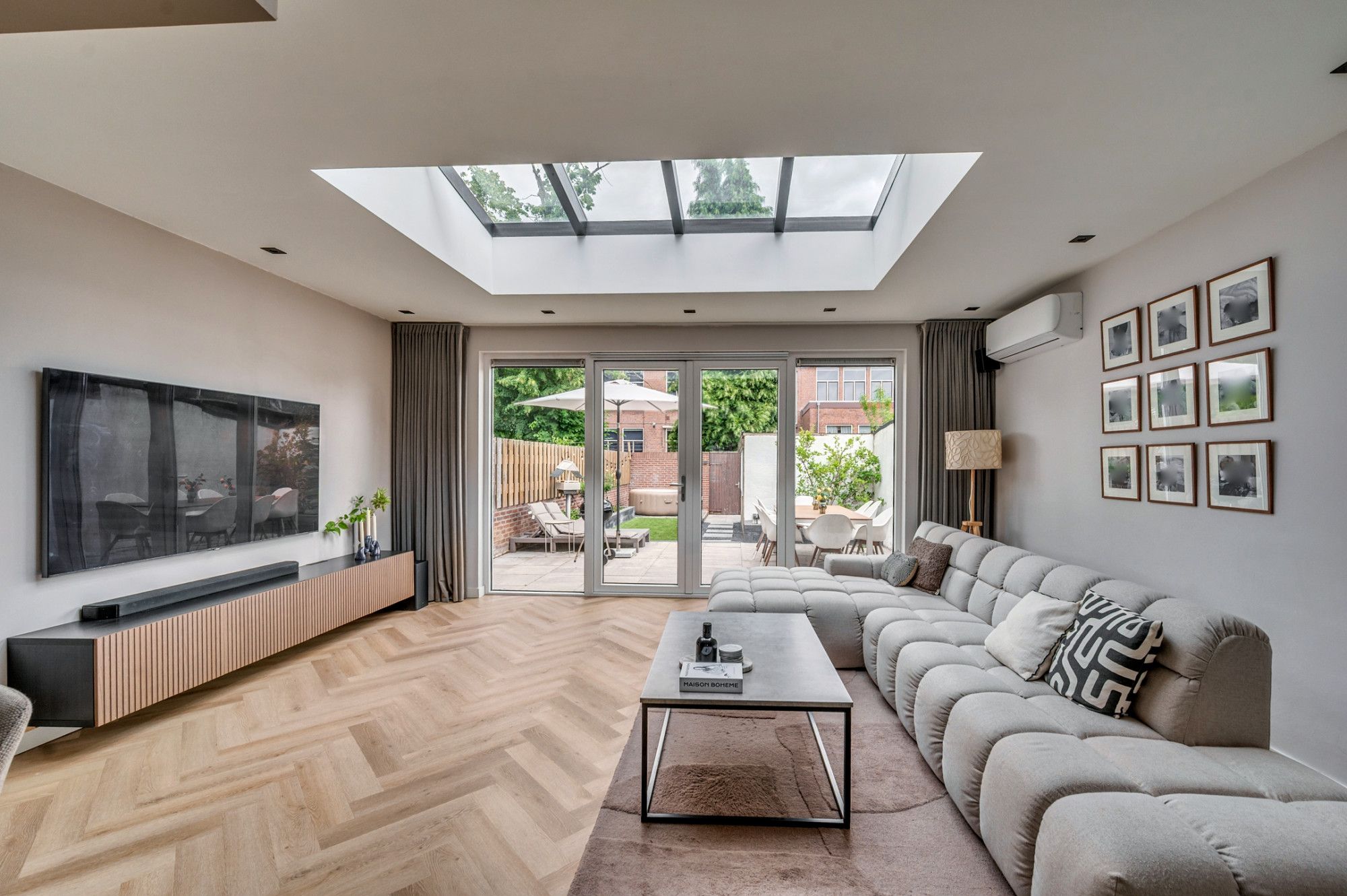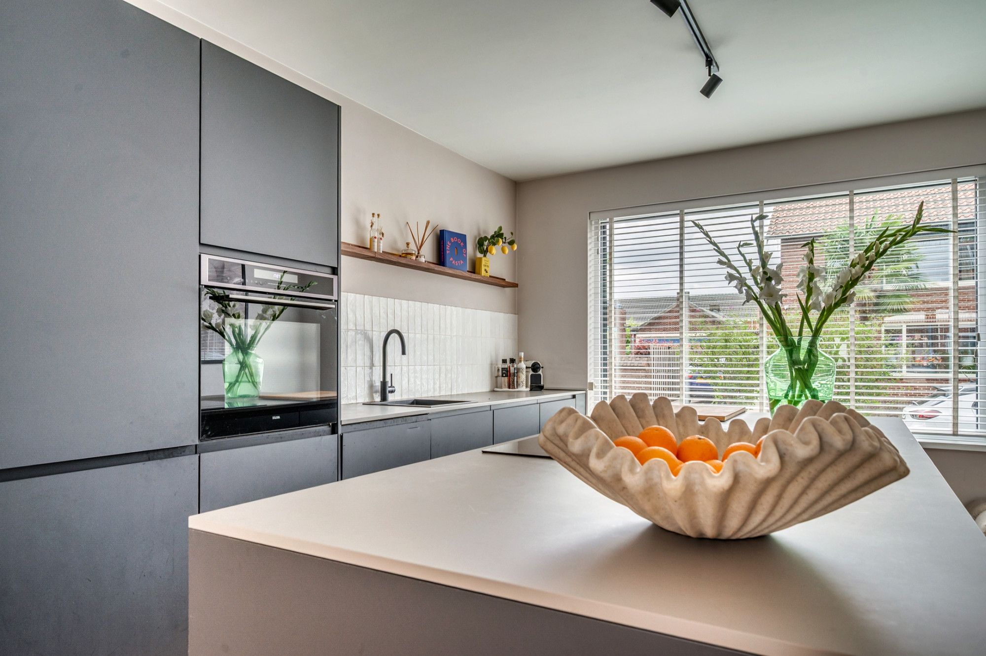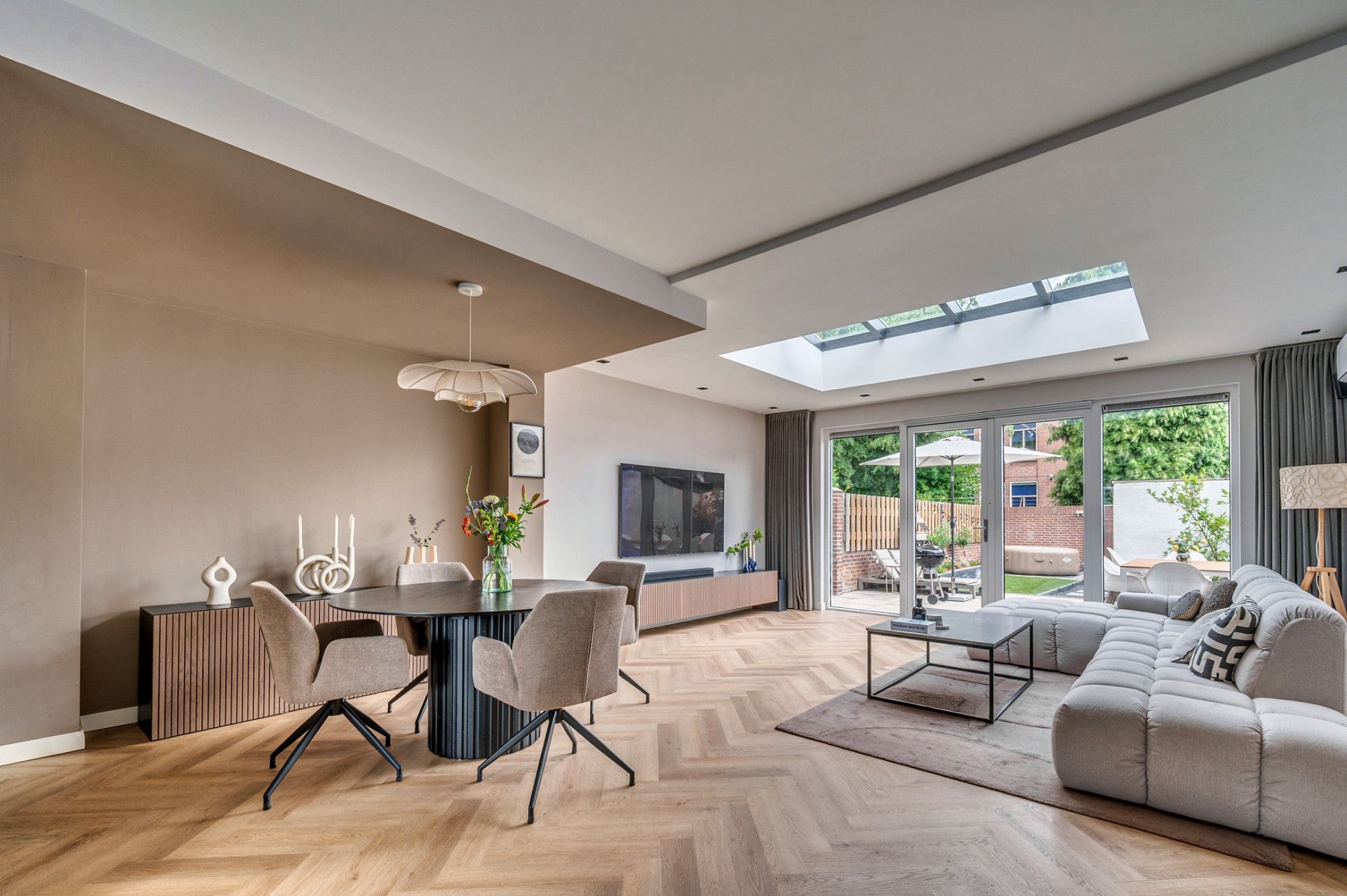 Middels een betegeld pad is de entree te betreden. De ontvangsthal met garderobe geeft toegang tot de toiletruimte, meterkast, trapopgang naar de verdieping, trapgang naar de kelder en woonkamer. De separate toiletruimte is deels betegeld en voorzien van een zwevend toilet, fonteintje en buitenraam. De zeer ruime doorzonwoonkamer is voorzien van vloerverwarming, open keuken en loopdeur naar de tuin. De moderne keuken is aan de voorzijde gelegen en is voorzien van een kookeiland, inductiekookplaat met interne afzuiging, combi oven/ magnetron, vaatwasmachine, koelkast, diepvries, wijnkoelkast (inbouw) en ontzettend veel opbergruimte. De zithoek is aan de achterzijde gelegen. Hier is in de aanbouw een lichtstraat gerealiseerd wat voor zeer veel natuurlijk lichtinval zorgt. Verder heeft de woonkamer de beschikking over een airco. De gehele begane grond is voorzien van een visgraad pvc vloer.