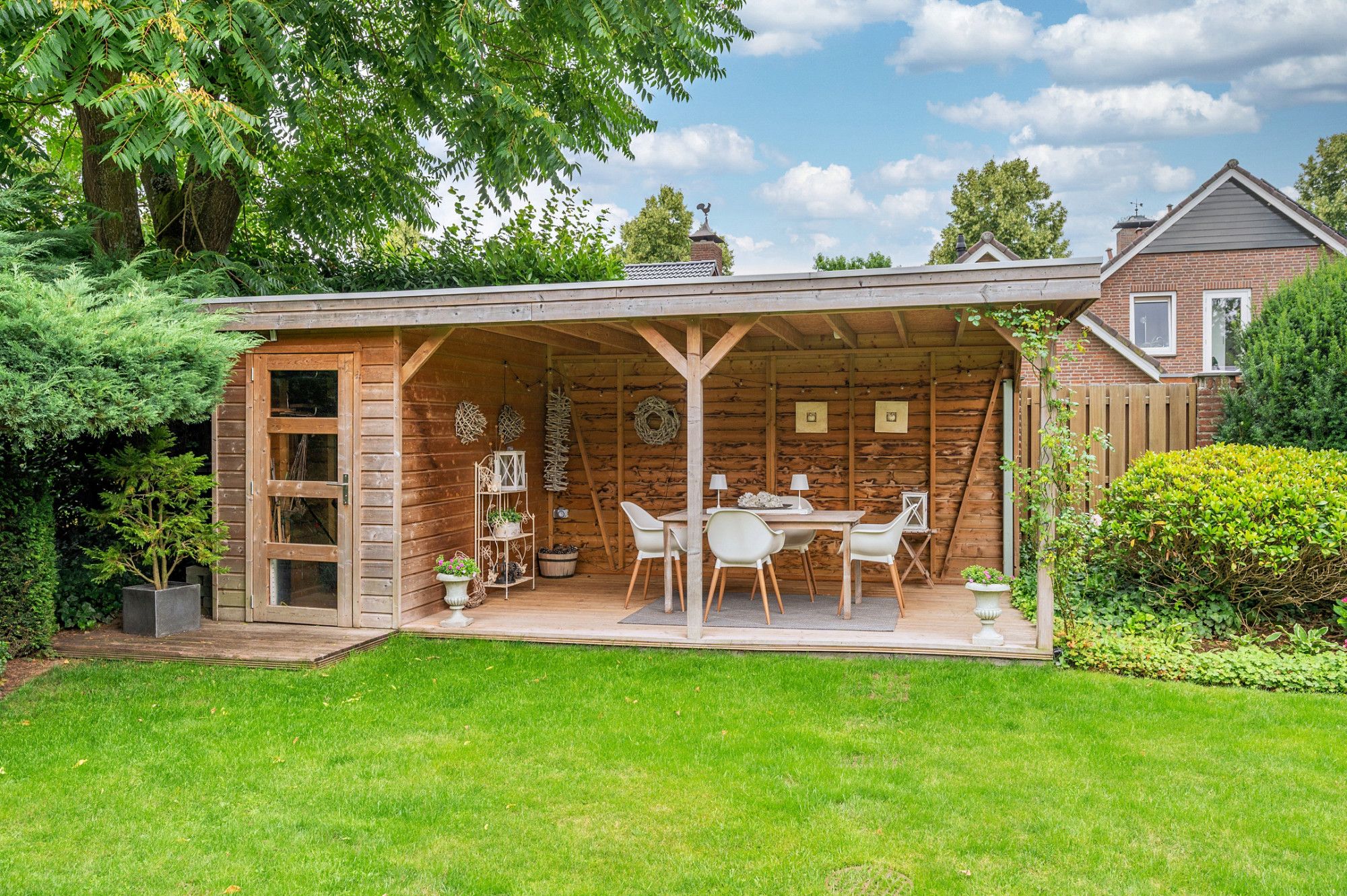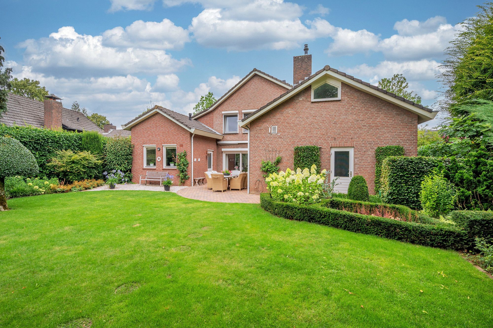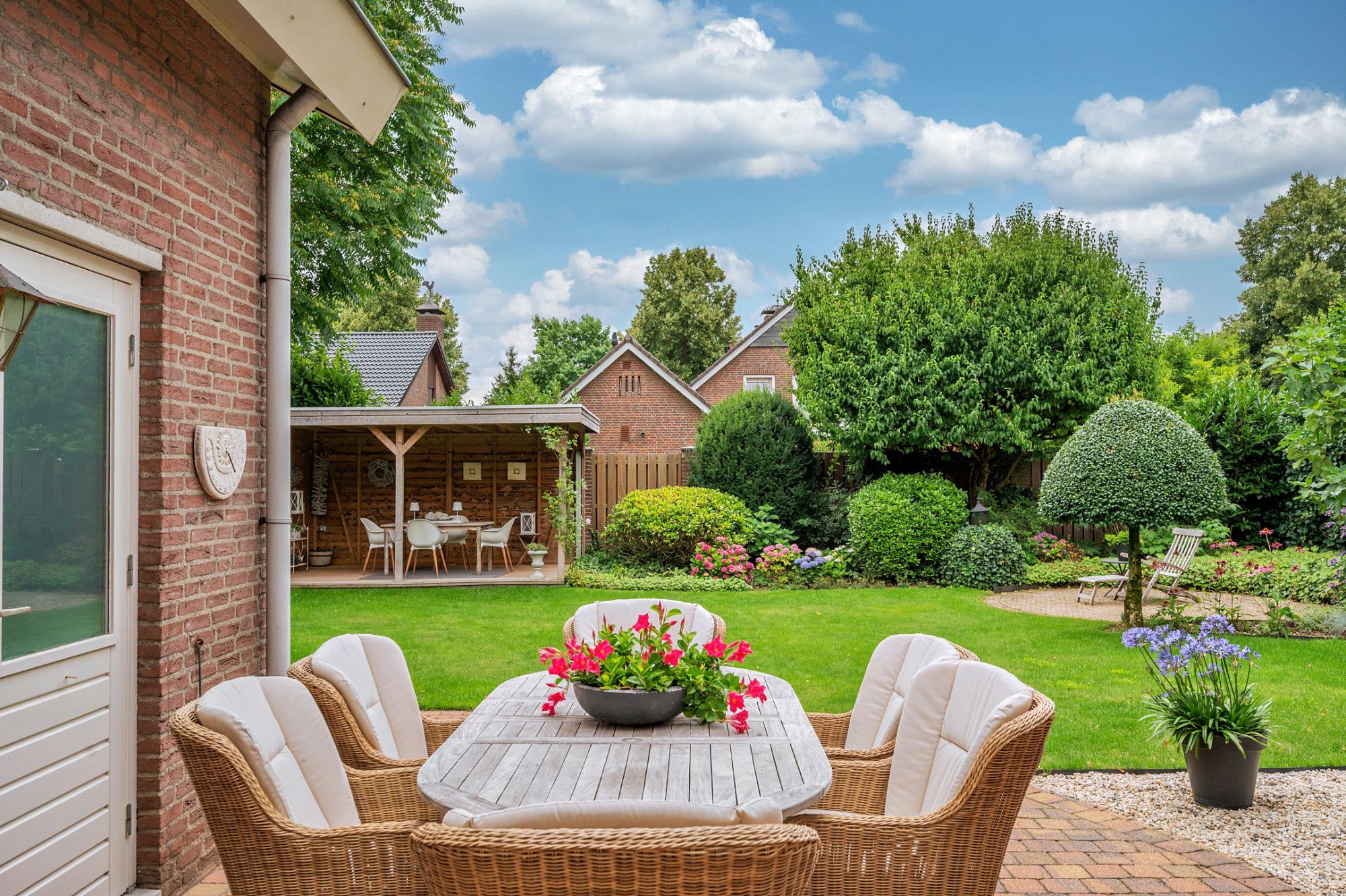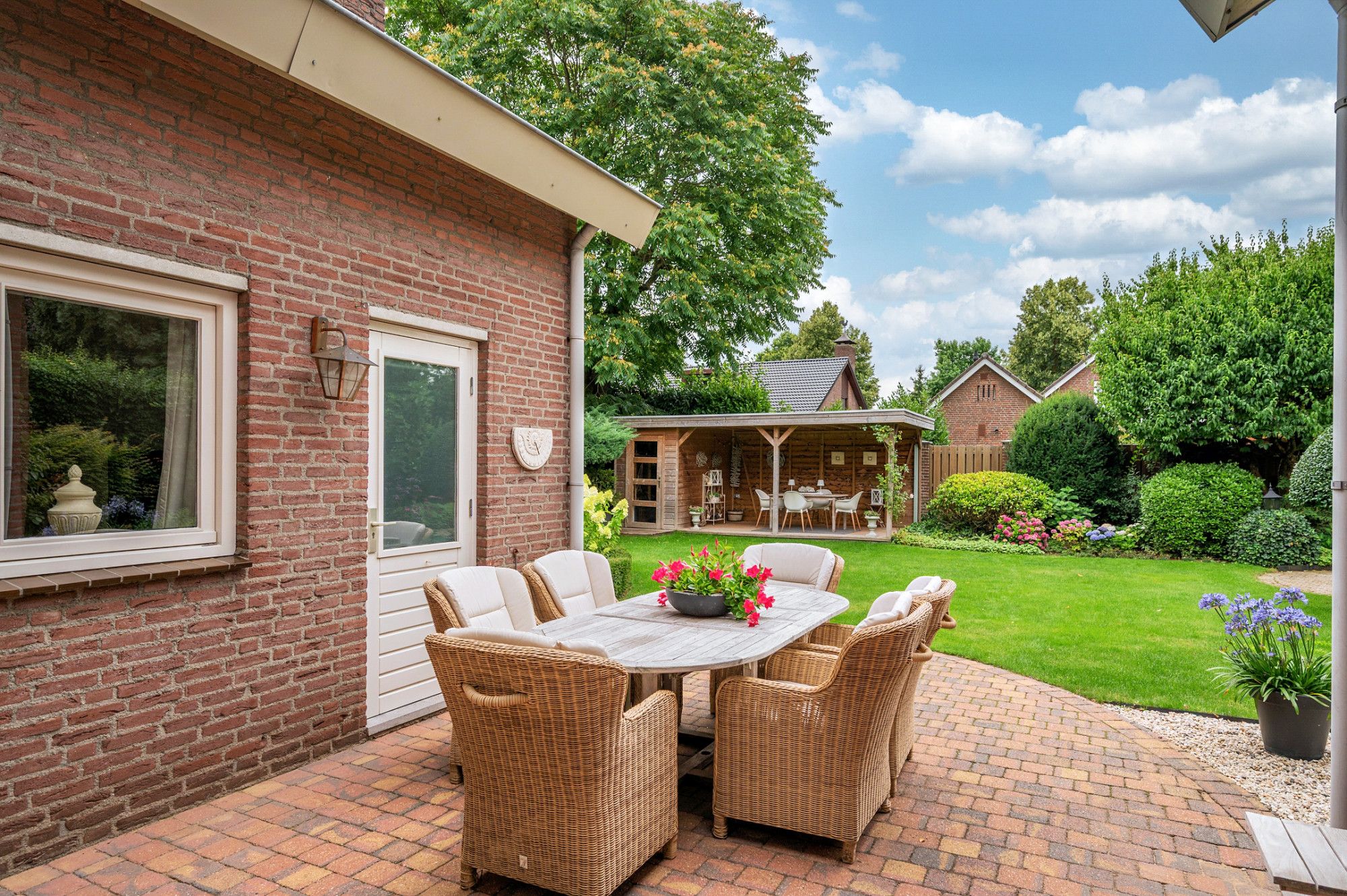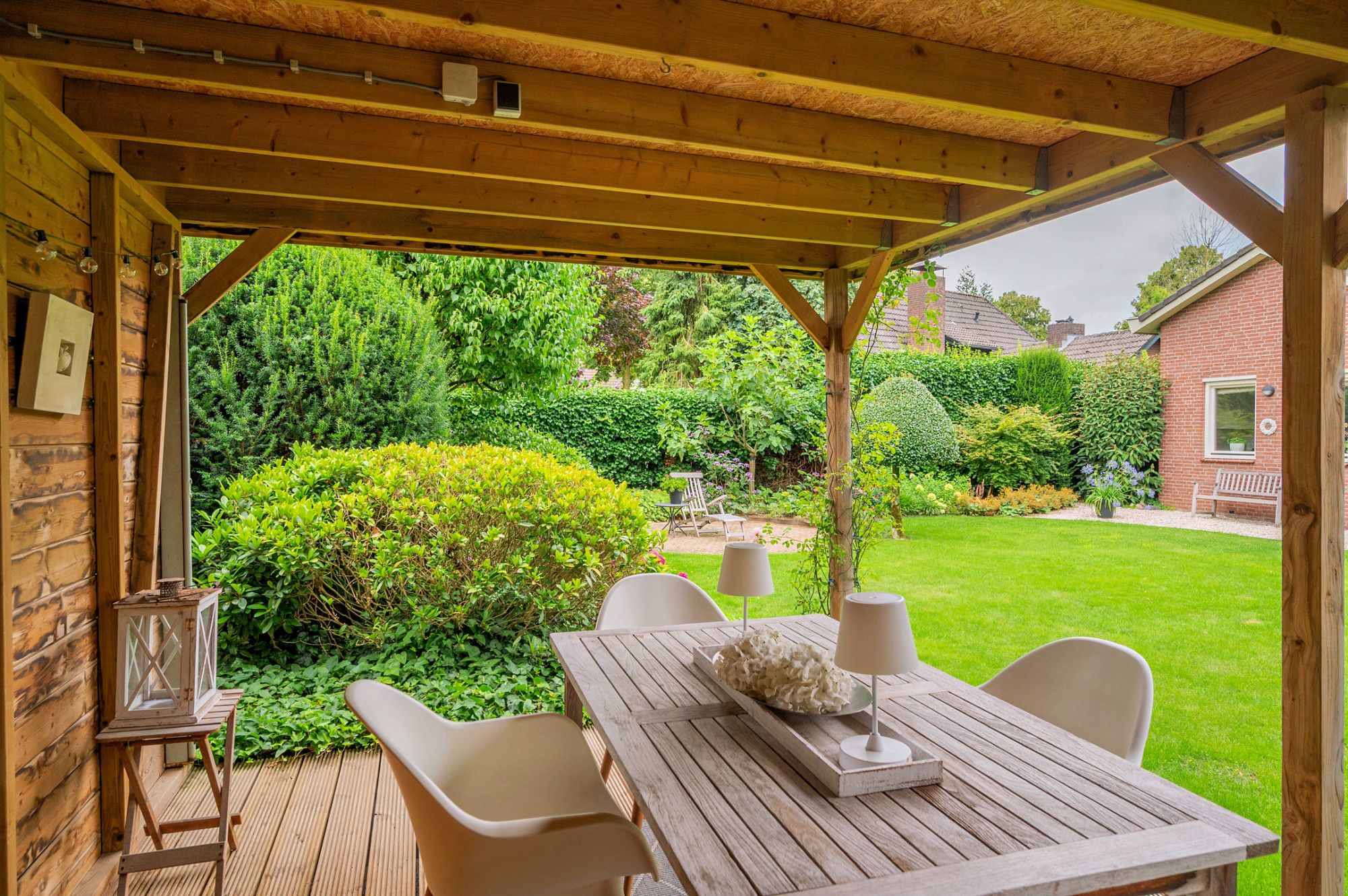 De achtertuin biedt veel privacy en heeft diverse terrassen, een groot gazon en tuinhuis. De tuin is gelegen op het zuidoosten en is te bereiken middels een vrije achterom. De garage (ca. 26m²) geeft de beschikking tot het plaatsen van een auto.