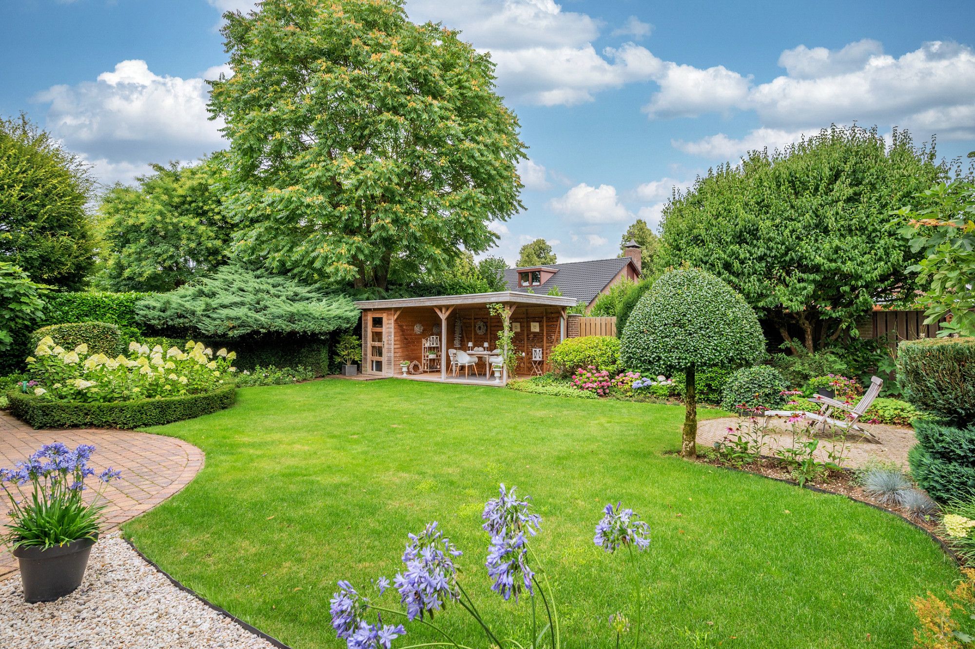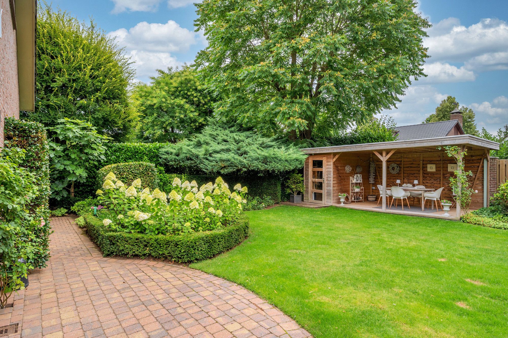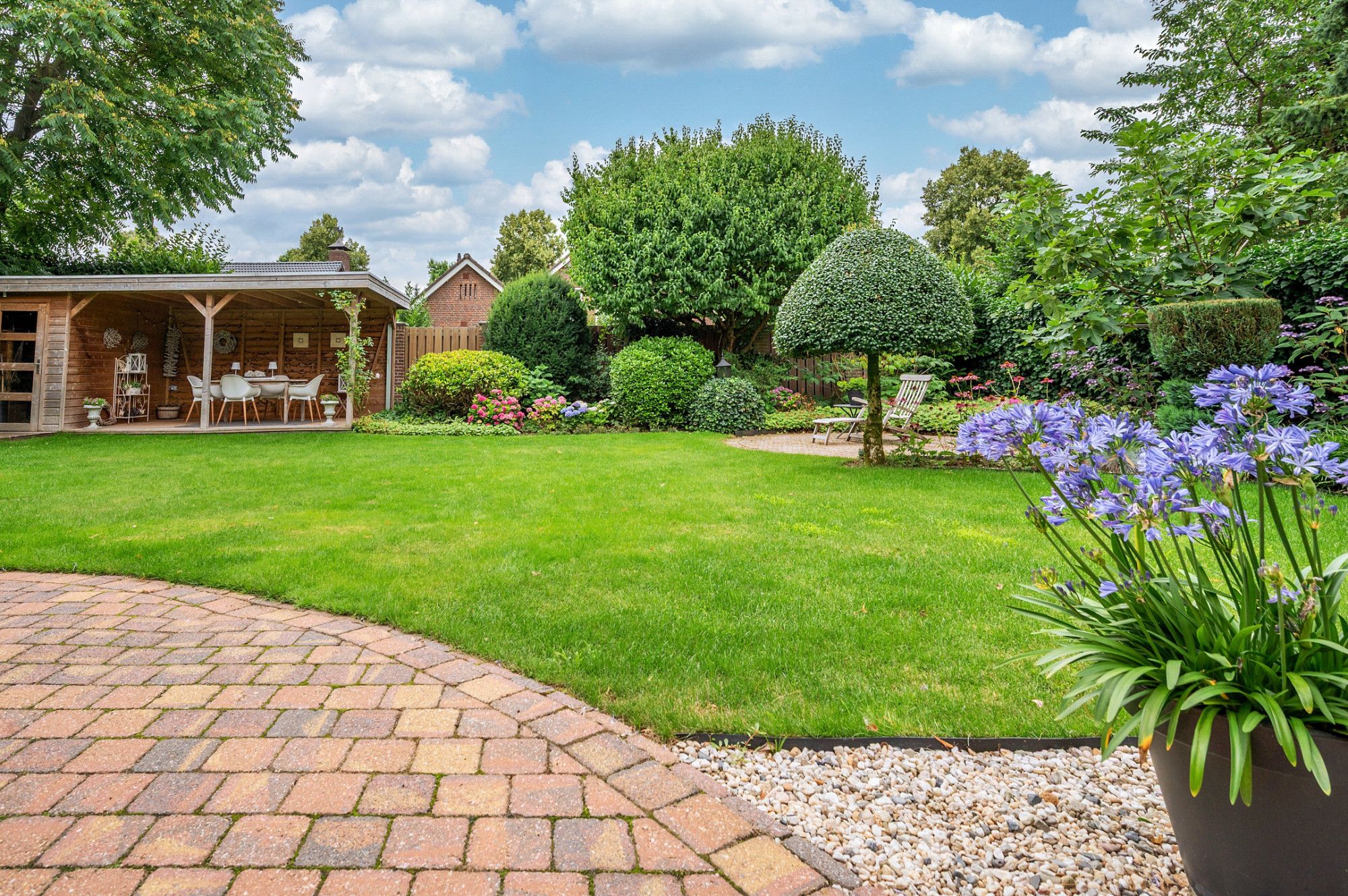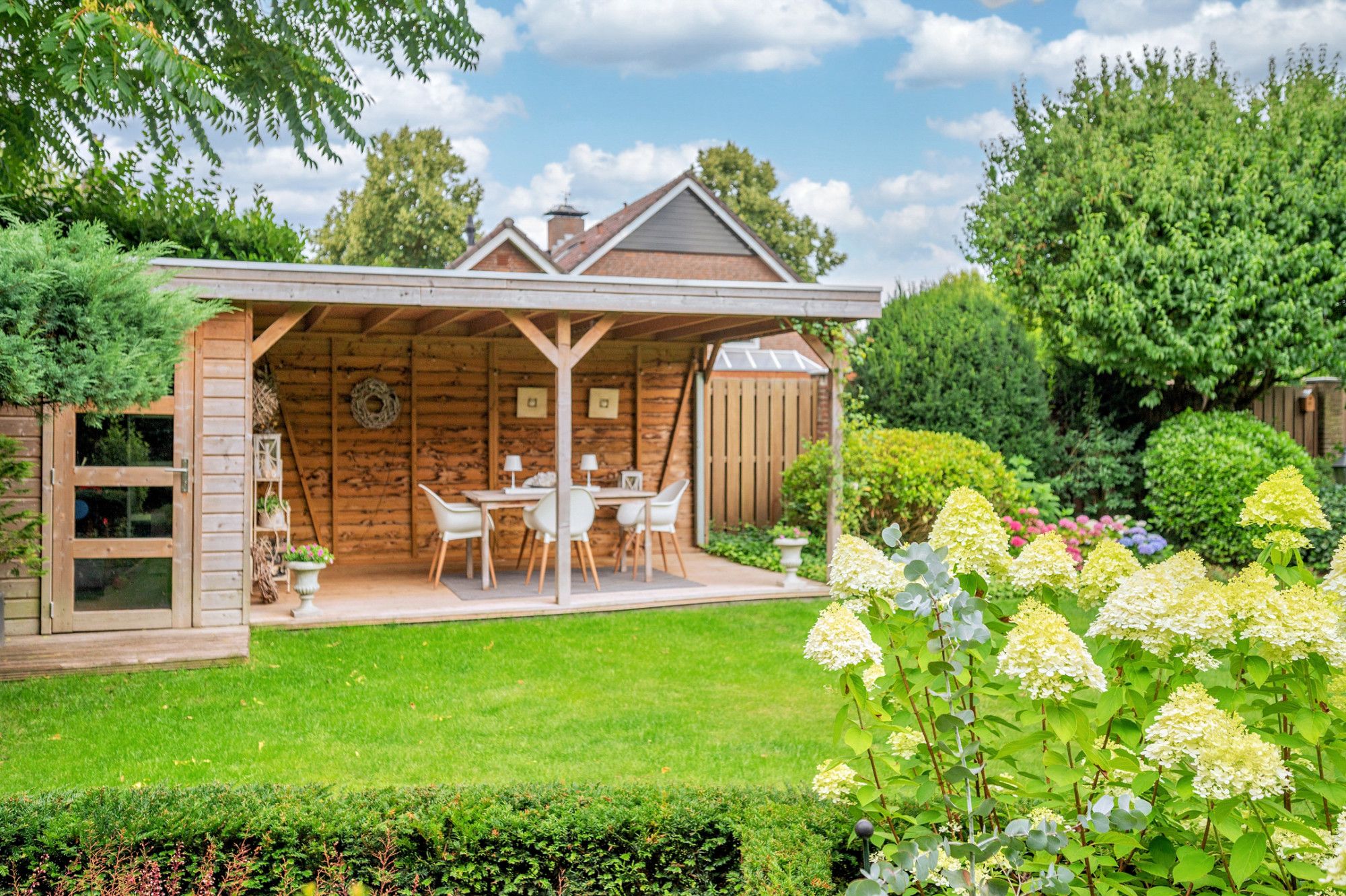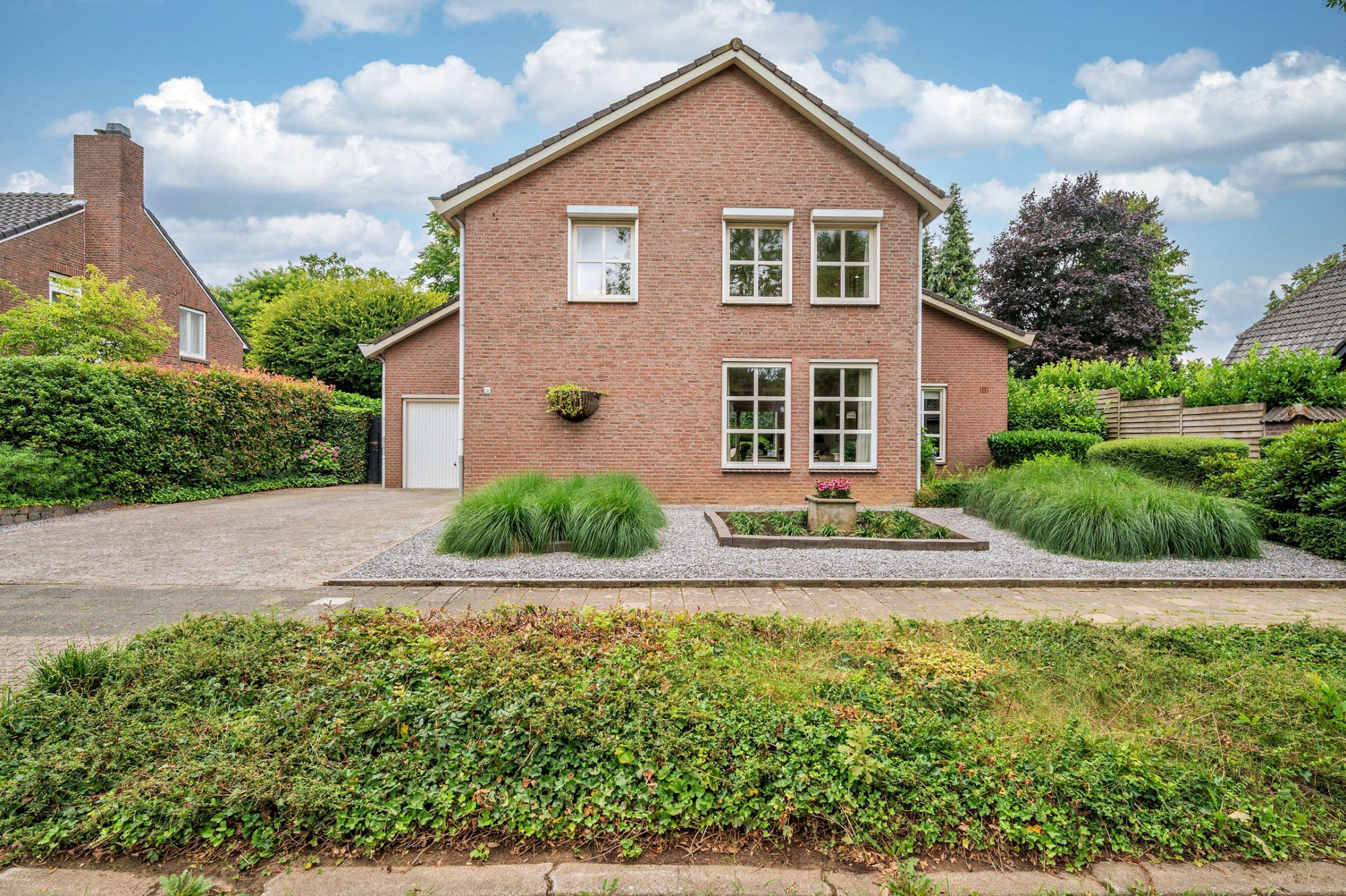 De achtertuin biedt veel privacy en heeft diverse terrassen, een groot gazon en tuinhuis. De tuin is gelegen op het zuidoosten en is te bereiken middels een vrije achterom. De garage (ca. 26m²) geeft de beschikking tot het plaatsen van een auto.