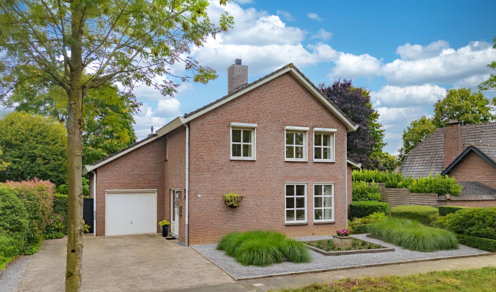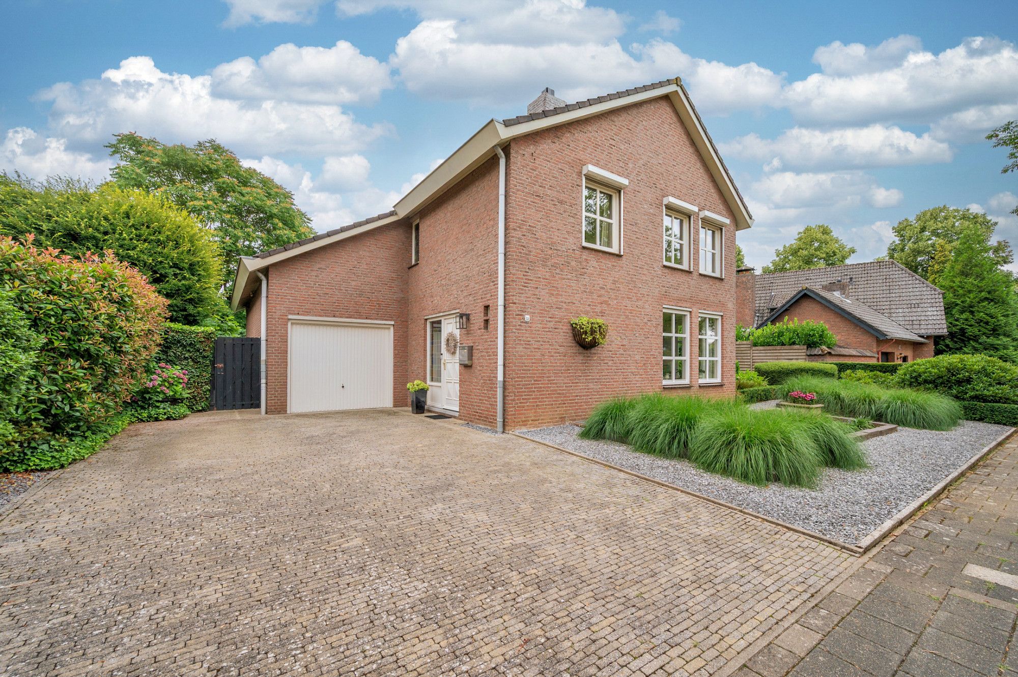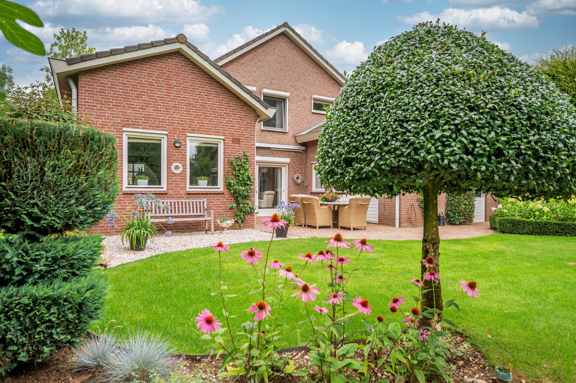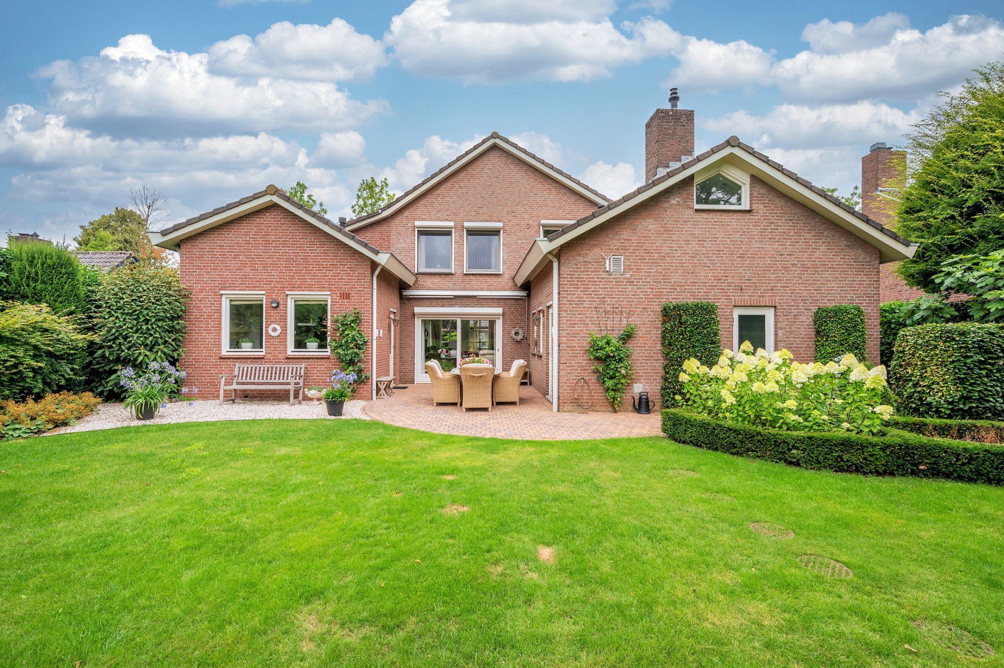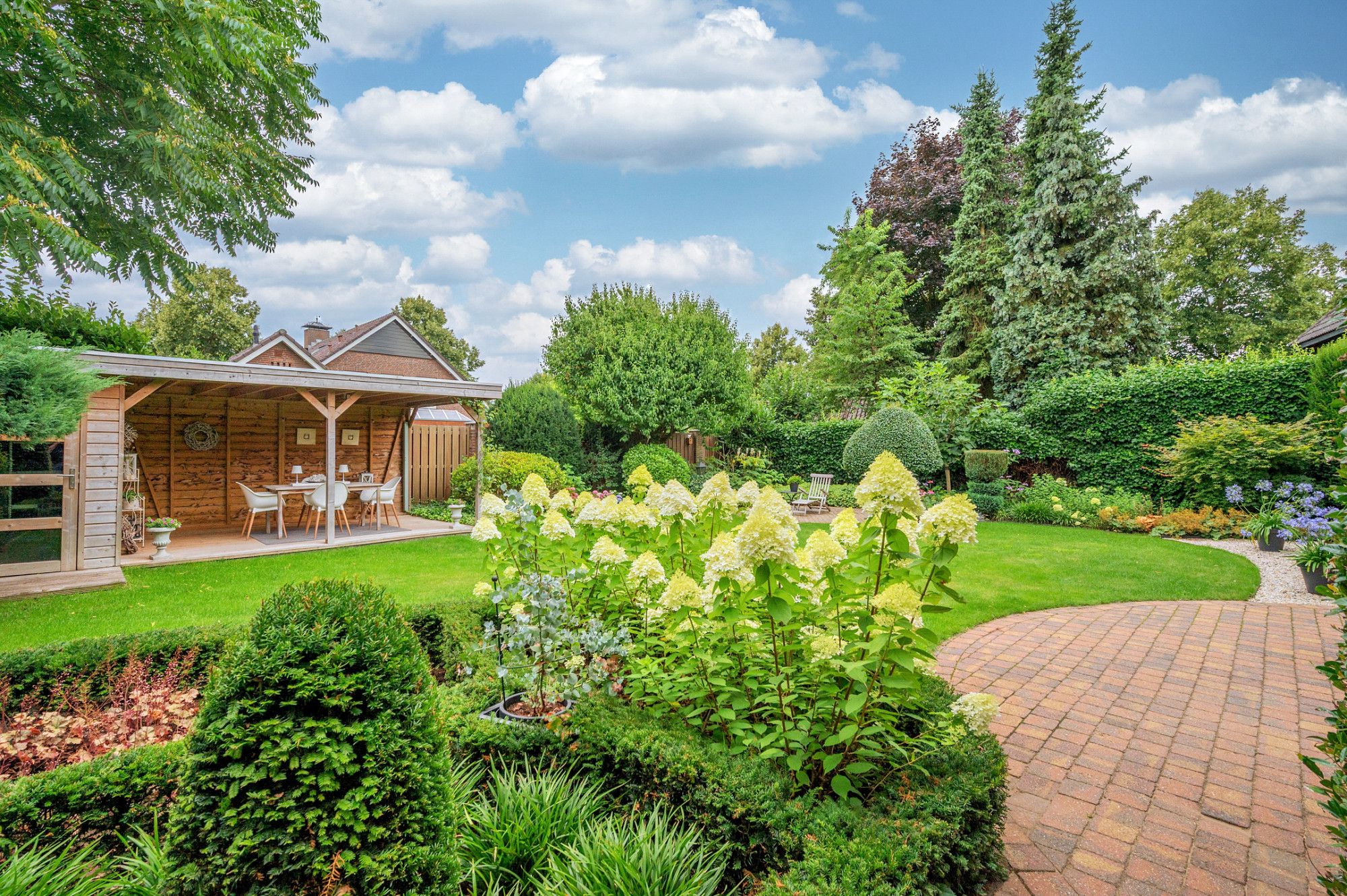 De achtertuin biedt veel privacy en heeft diverse terrassen, een groot gazon en tuinhuis. De tuin is gelegen op het zuidoosten en is te bereiken middels een vrije achterom. De garage (ca. 26m²) geeft de beschikking tot het plaatsen van een auto.