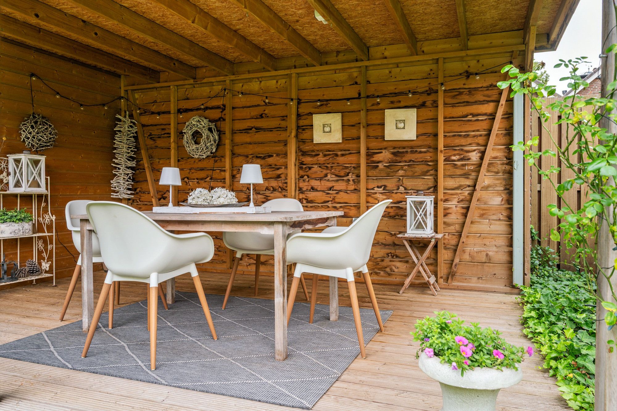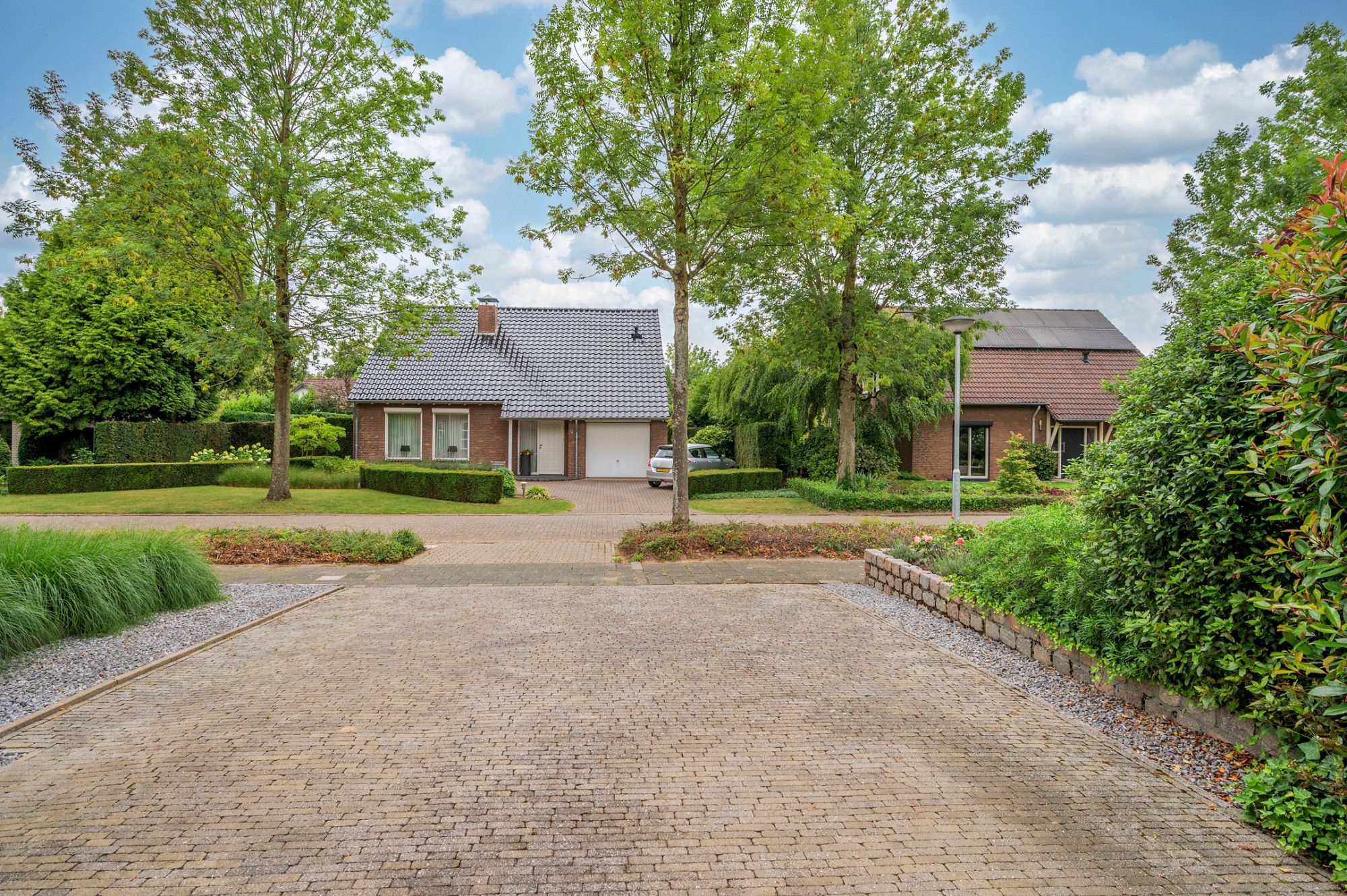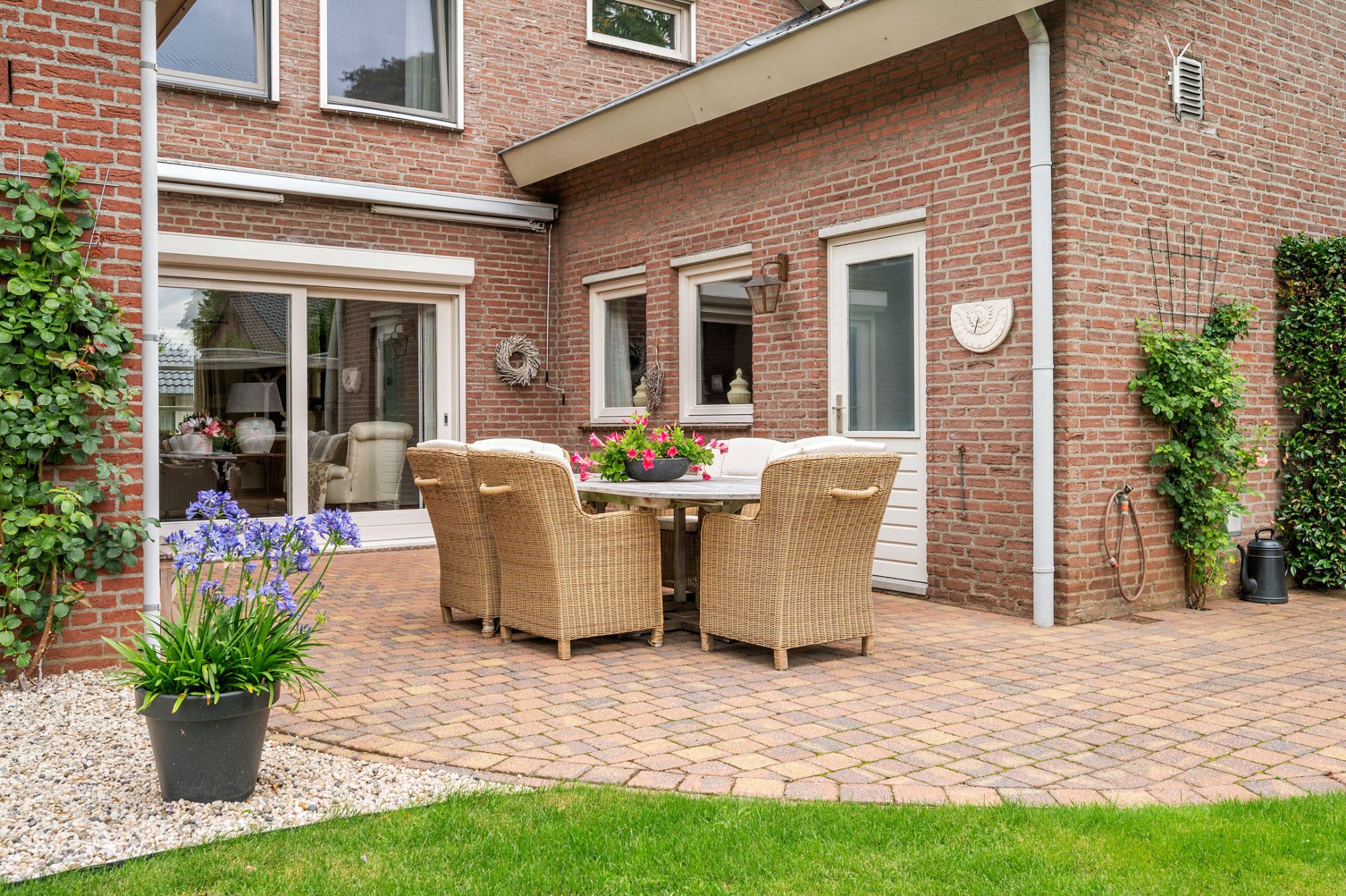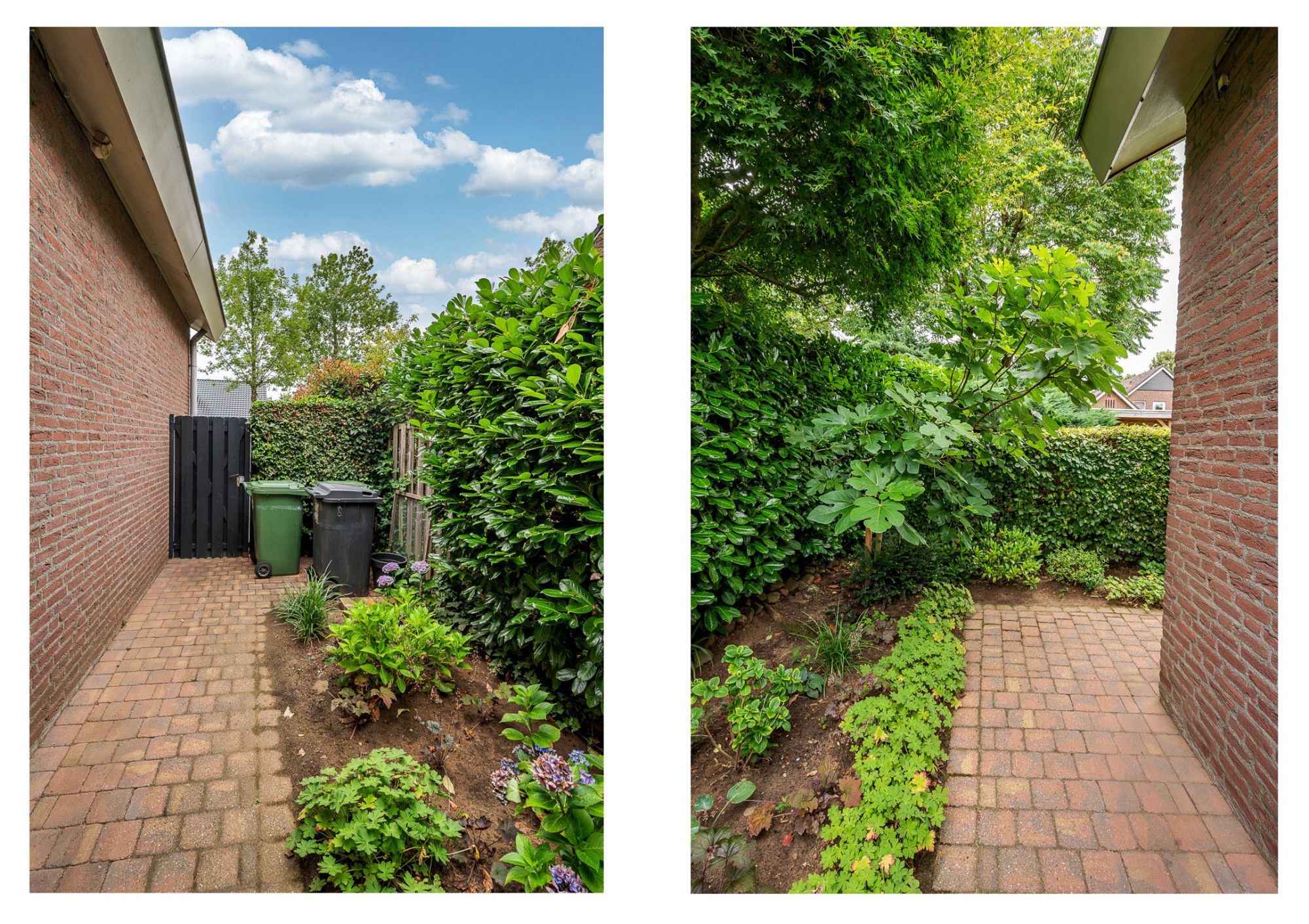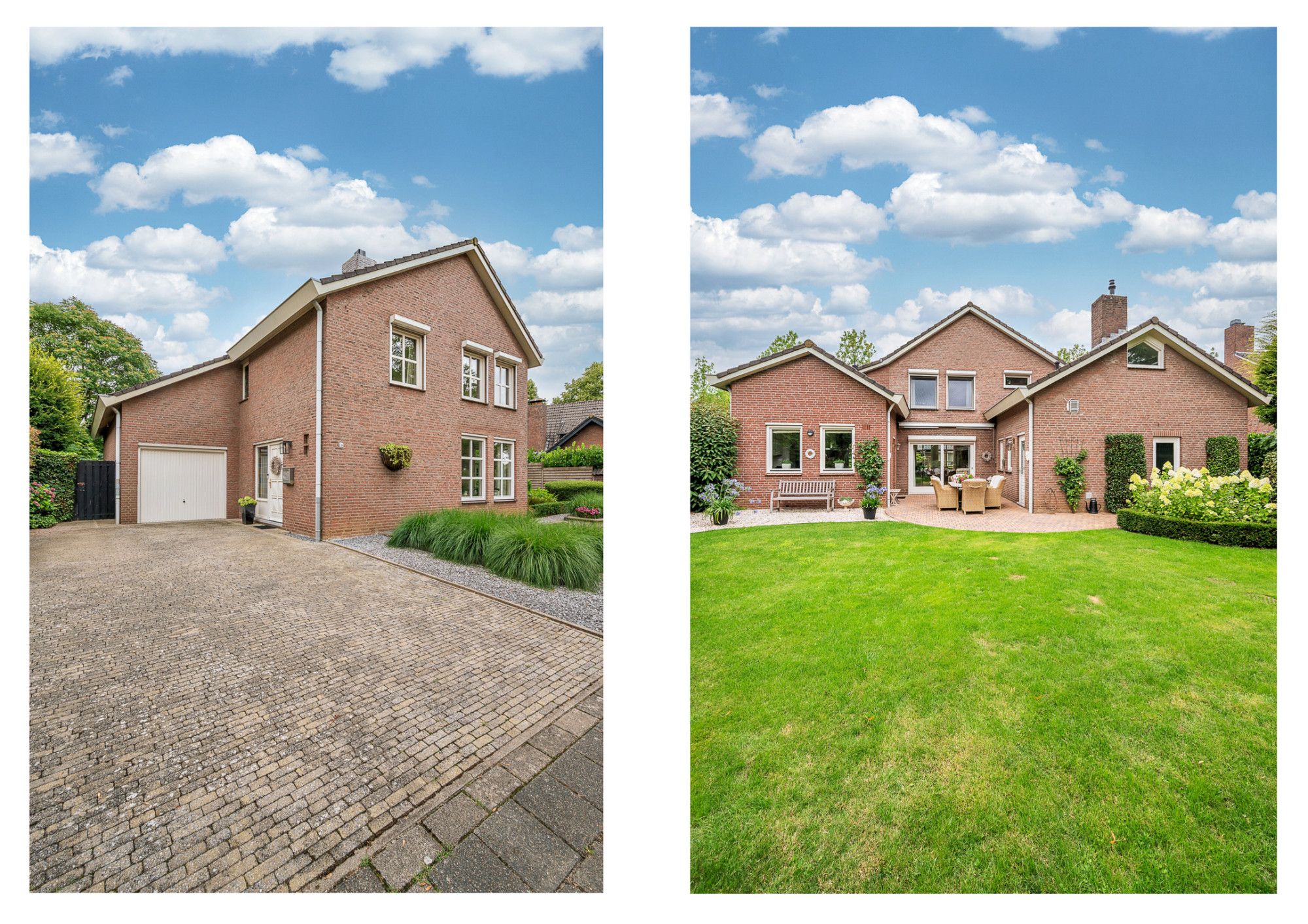 De achtertuin biedt veel privacy en heeft diverse terrassen, een groot gazon en tuinhuis. De tuin is gelegen op het zuidoosten en is te bereiken middels een vrije achterom. De garage (ca. 26m²) geeft de beschikking tot het plaatsen van een auto.