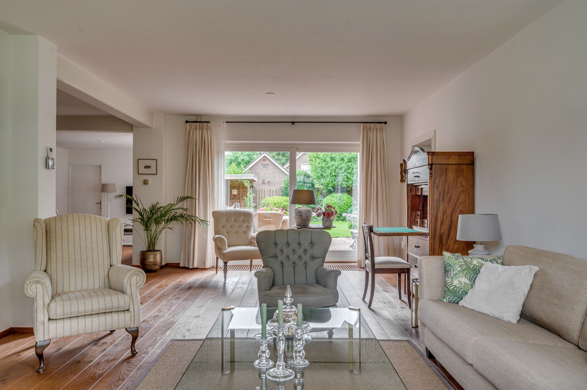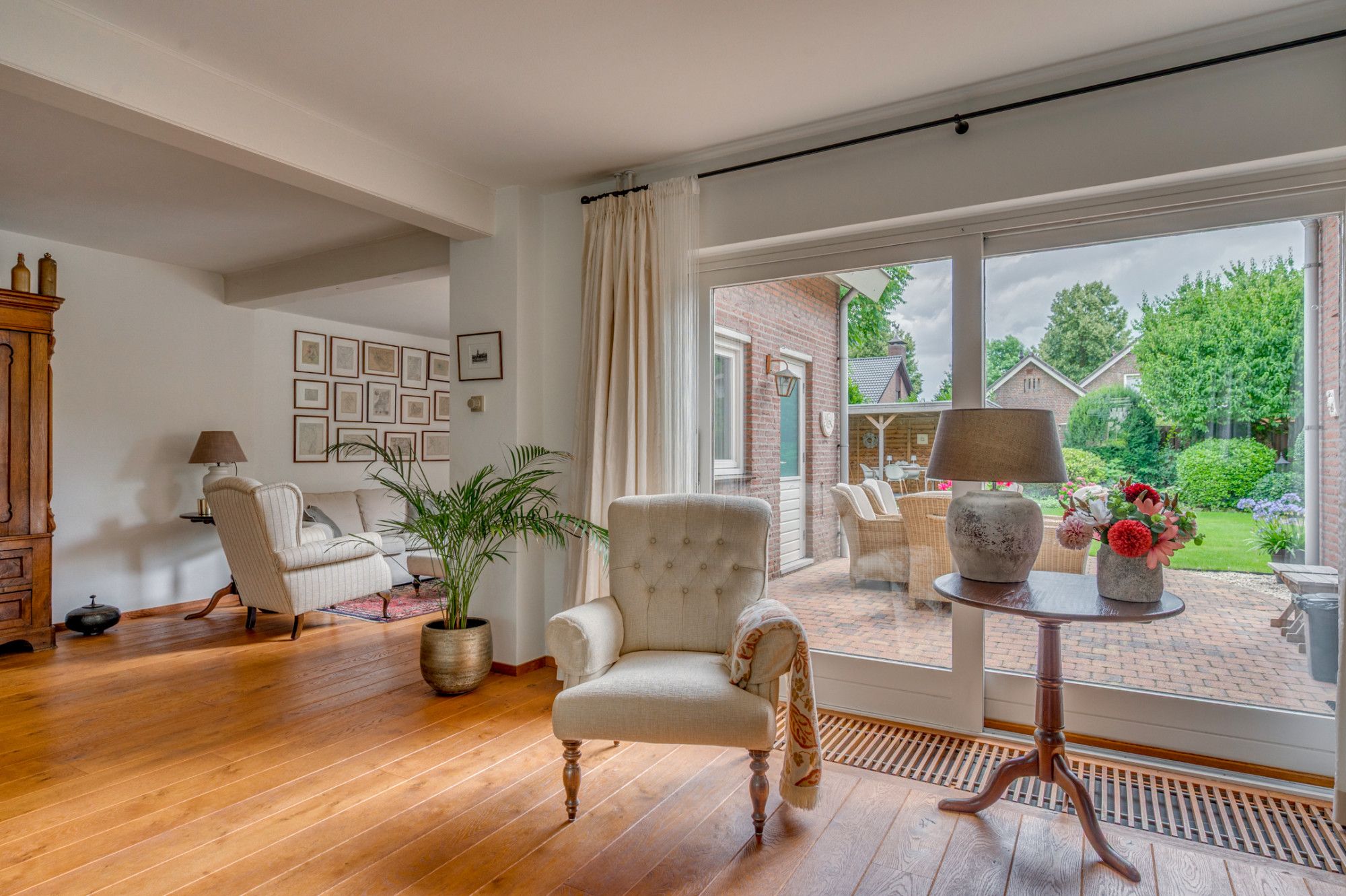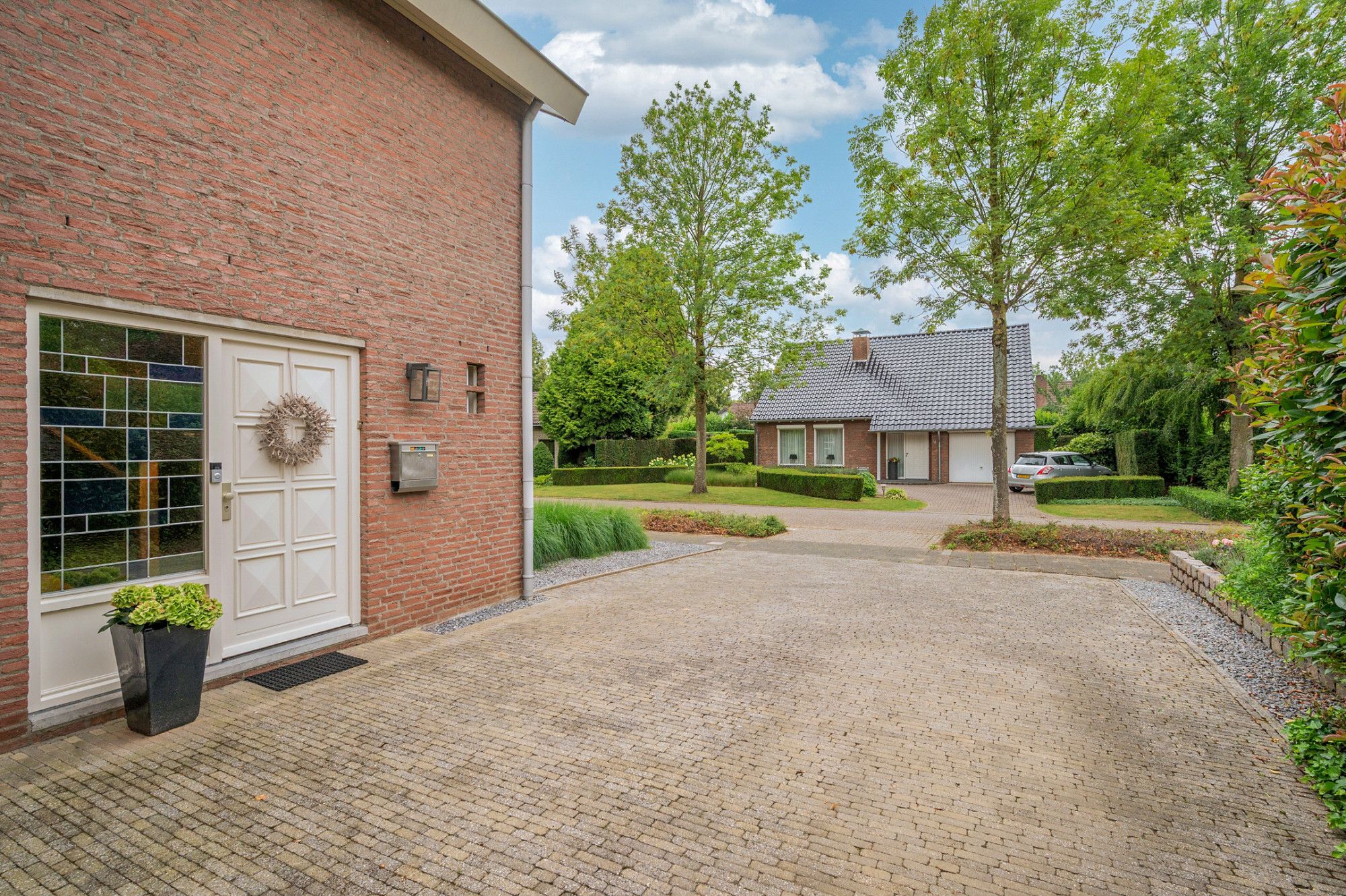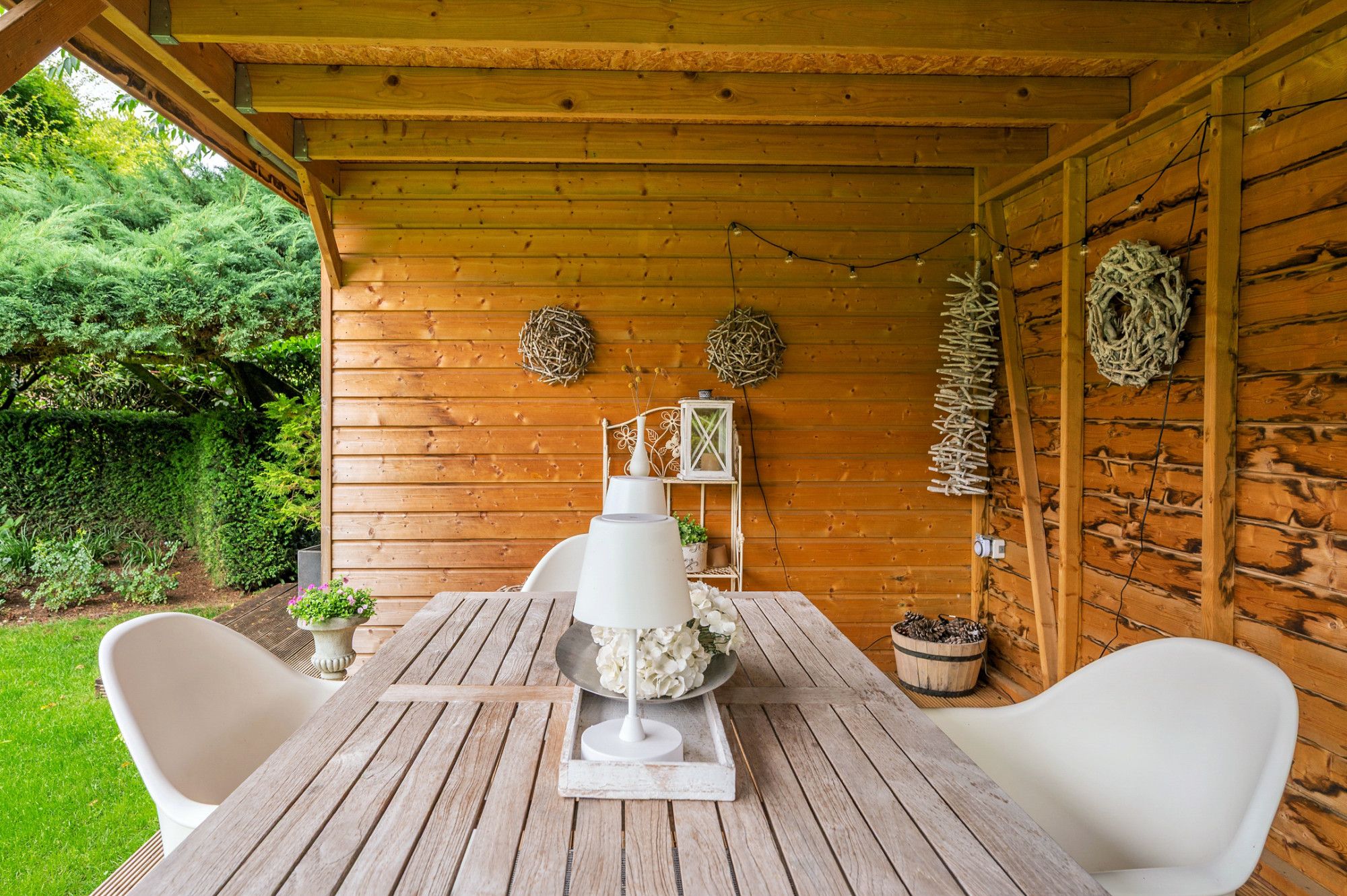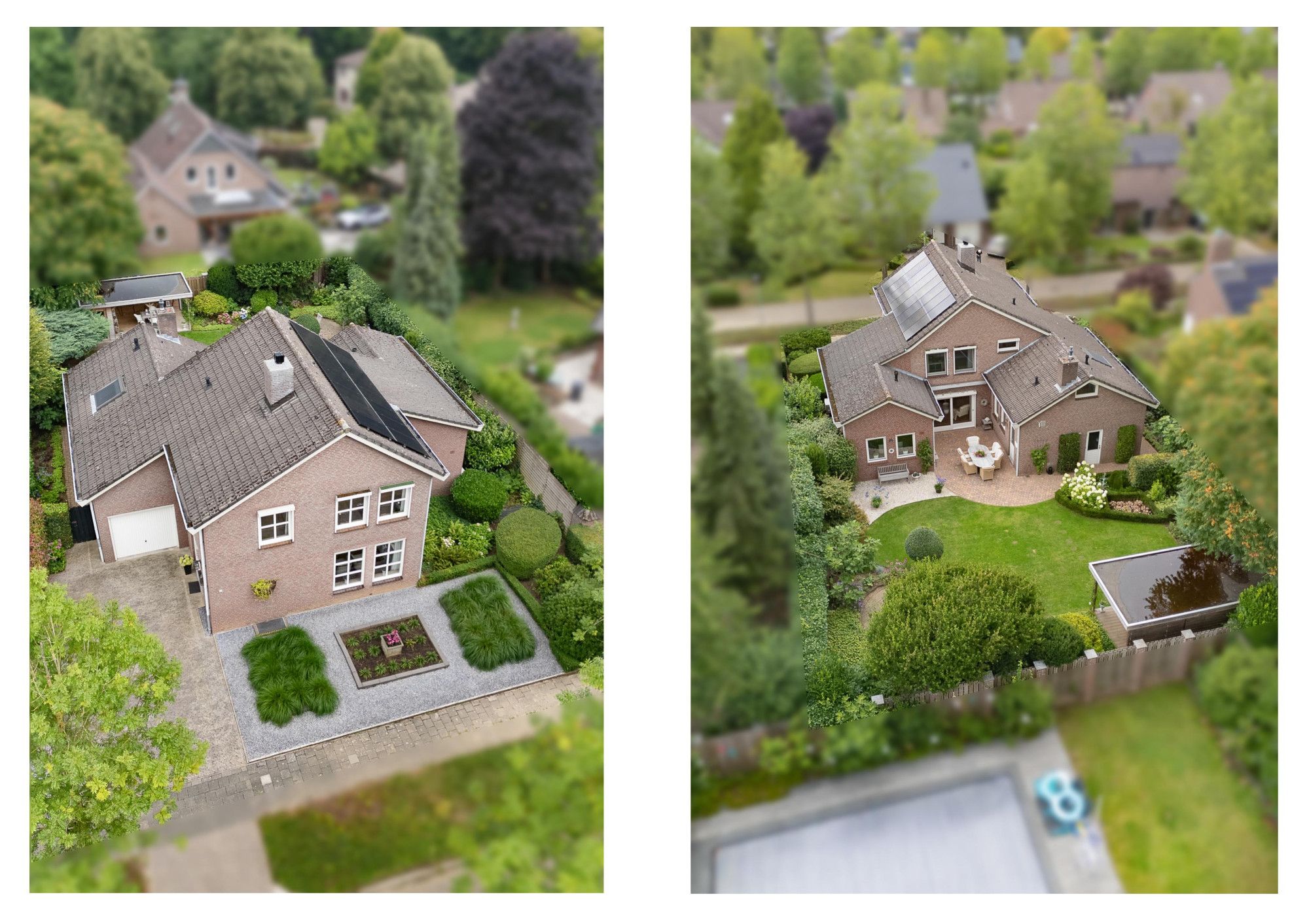 De achtertuin biedt veel privacy en heeft diverse terrassen, een groot gazon en tuinhuis. De tuin is gelegen op het zuidoosten en is te bereiken middels een vrije achterom. De garage (ca. 26m²) geeft de beschikking tot het plaatsen van een auto.