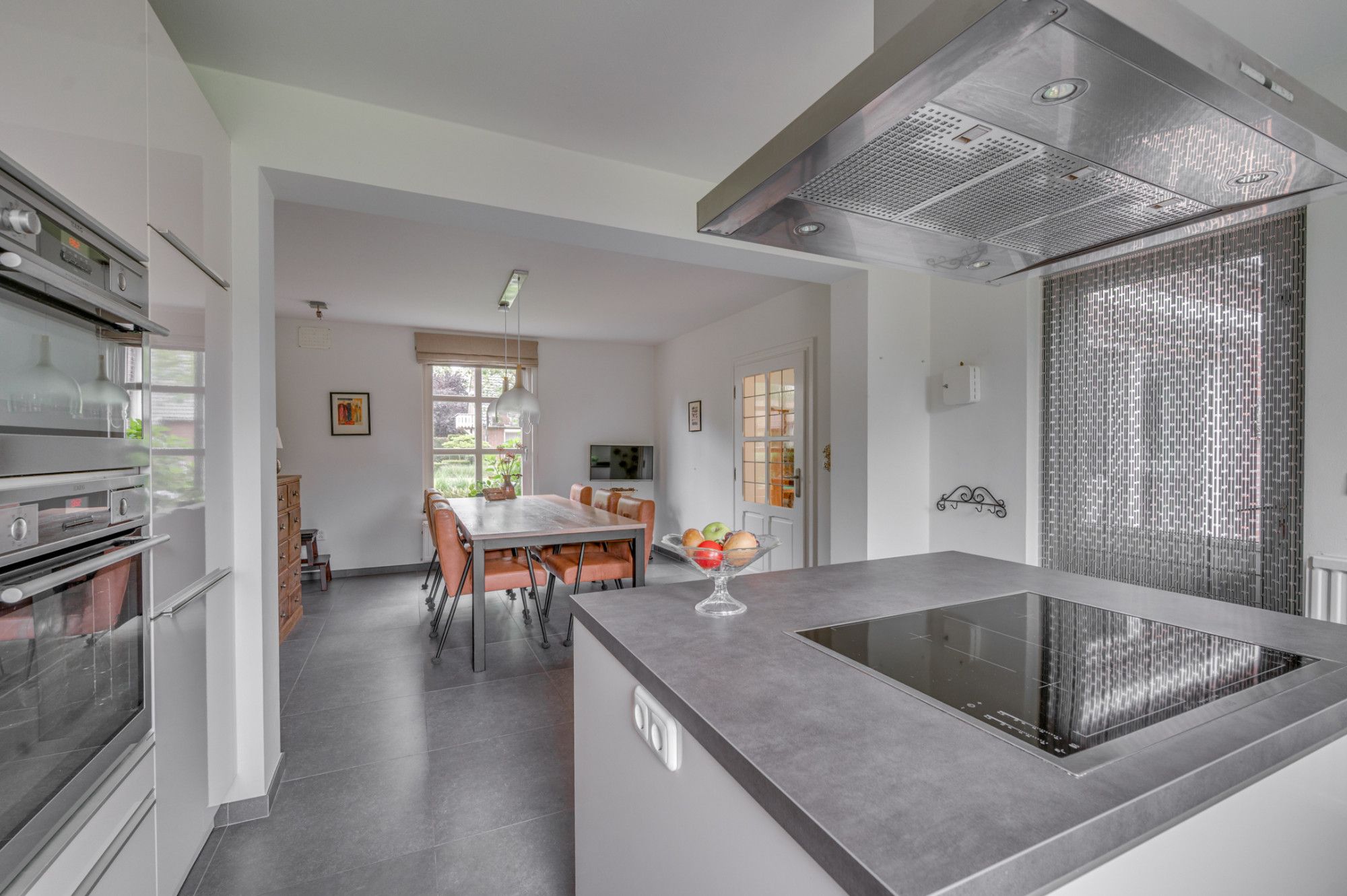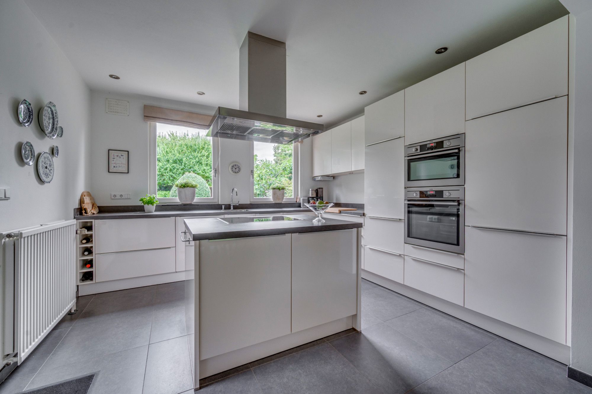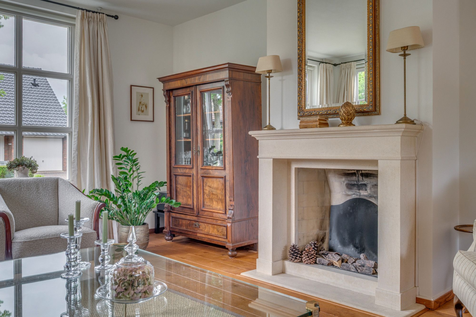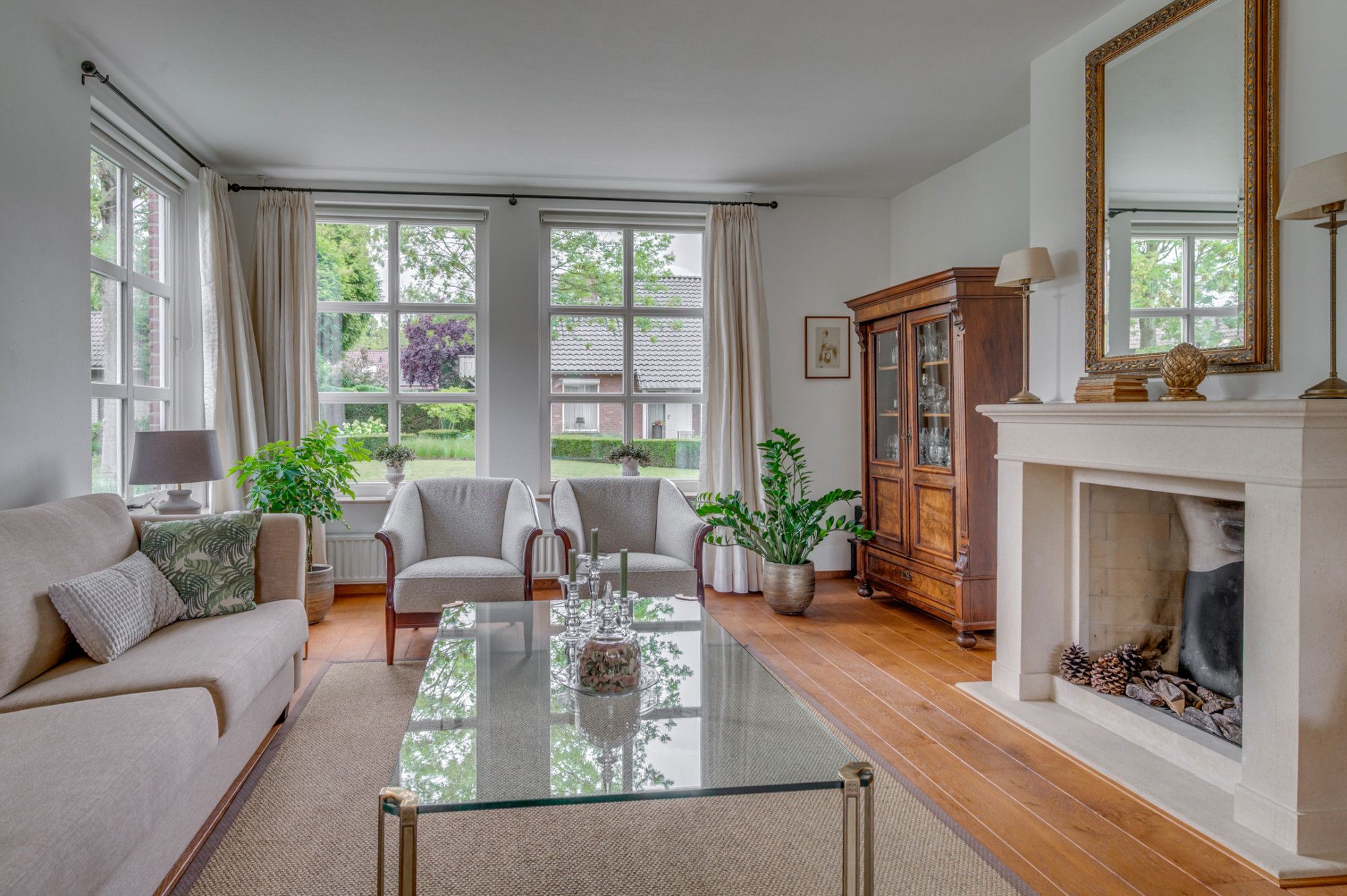 Vanuit de royale beklinkerde eigen oprit is de garage en de entree tot de woning te bereiken. De entree hal geeft toegang tot de trapopgang naar de verdieping, trapgang naar de kelder, separate toiletruimte, meterkast en loopdeur naar de woonkamer. De geheel betegelde toiletruimte is voorzien van een zwevend toilet, fonteintje, verwarming en buitenraam. De ruime woonkamer is voorzien van veel lichtinval door de grote raampartijen en ca. 56m² groot. De woonkamer is ingedeeld in een zitgedeelte aan de voorzijde met gashaard, en een zitgedeelte aan de achterzijde. Middels een schuifpui is er toegang tot de achtertuin. Verder is de woonkamer voorzien van een eikenhouten plankenvloer. De achterzijde van de woonkamer geeft middels een loopdeur toegang tot de wasruimte/ berging. Deze ruimte is voorzien van de witgoedaansluitingen, warm en koud water kraan en een loopdeur naar de tuin. De zeer ruime keuken met aansluitende eetkamer is gezamenlijk ca. 27m² groot. De ruimte is voorzien van een antracieten tegelvloer. De keuken beschikt over een ruim kookeiland met een 4-pits inductiekookplaat, afzuigkap en veel opbergruimte. Verder is de keuken voorzien van een koelkast, combi-magnetron, oven, vaatwasmachine, zeer veel opbergruimte en een loopdeur naar de tuin.
