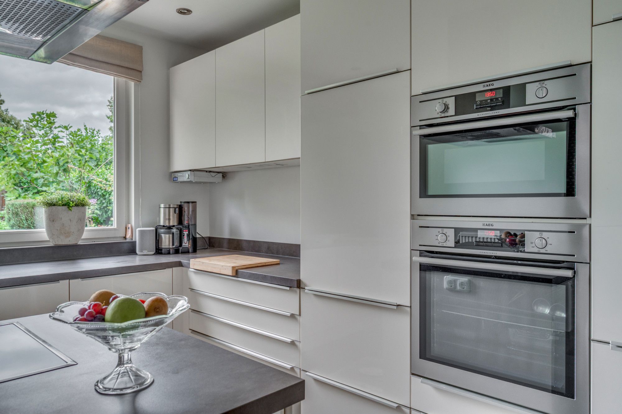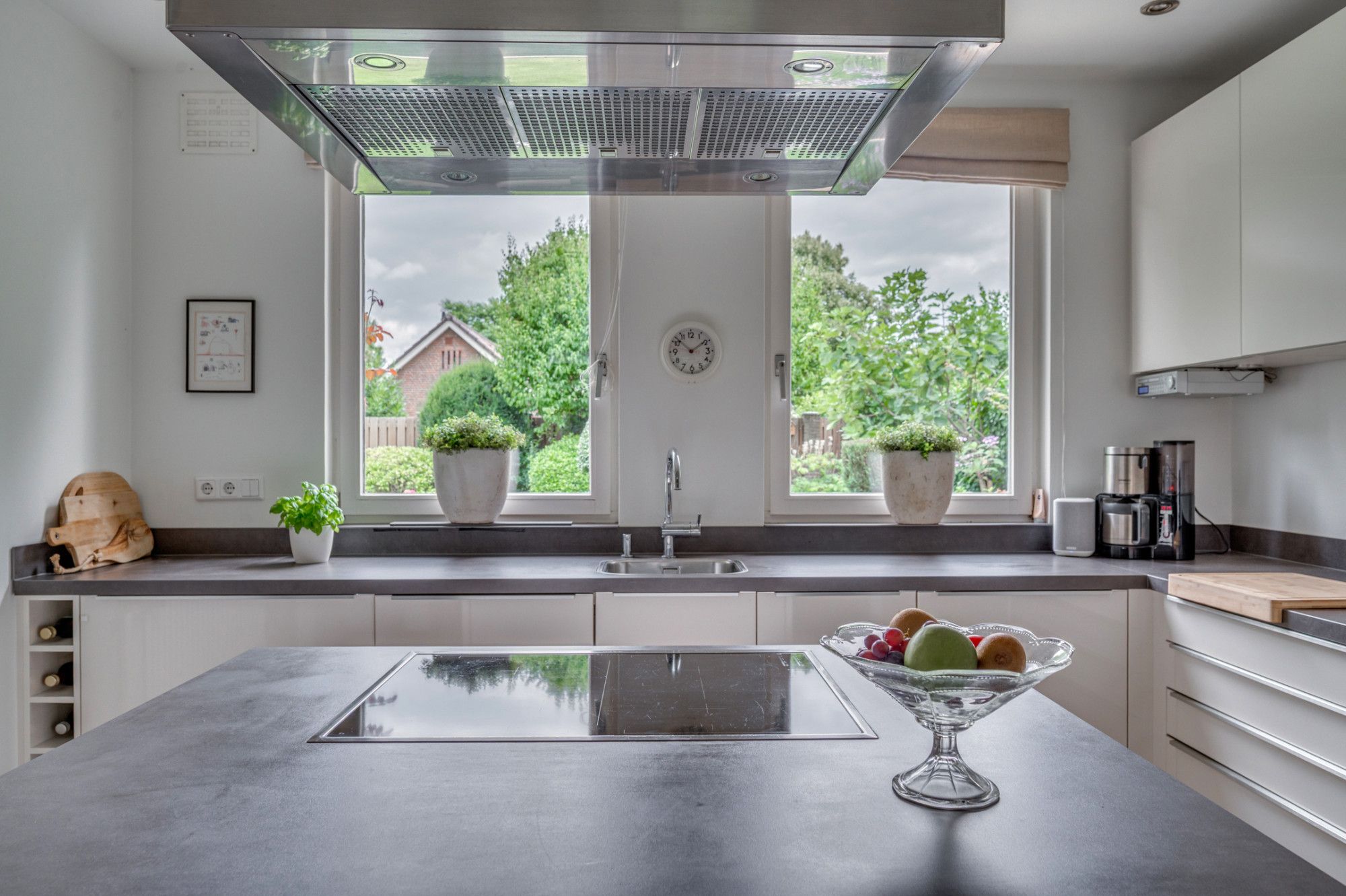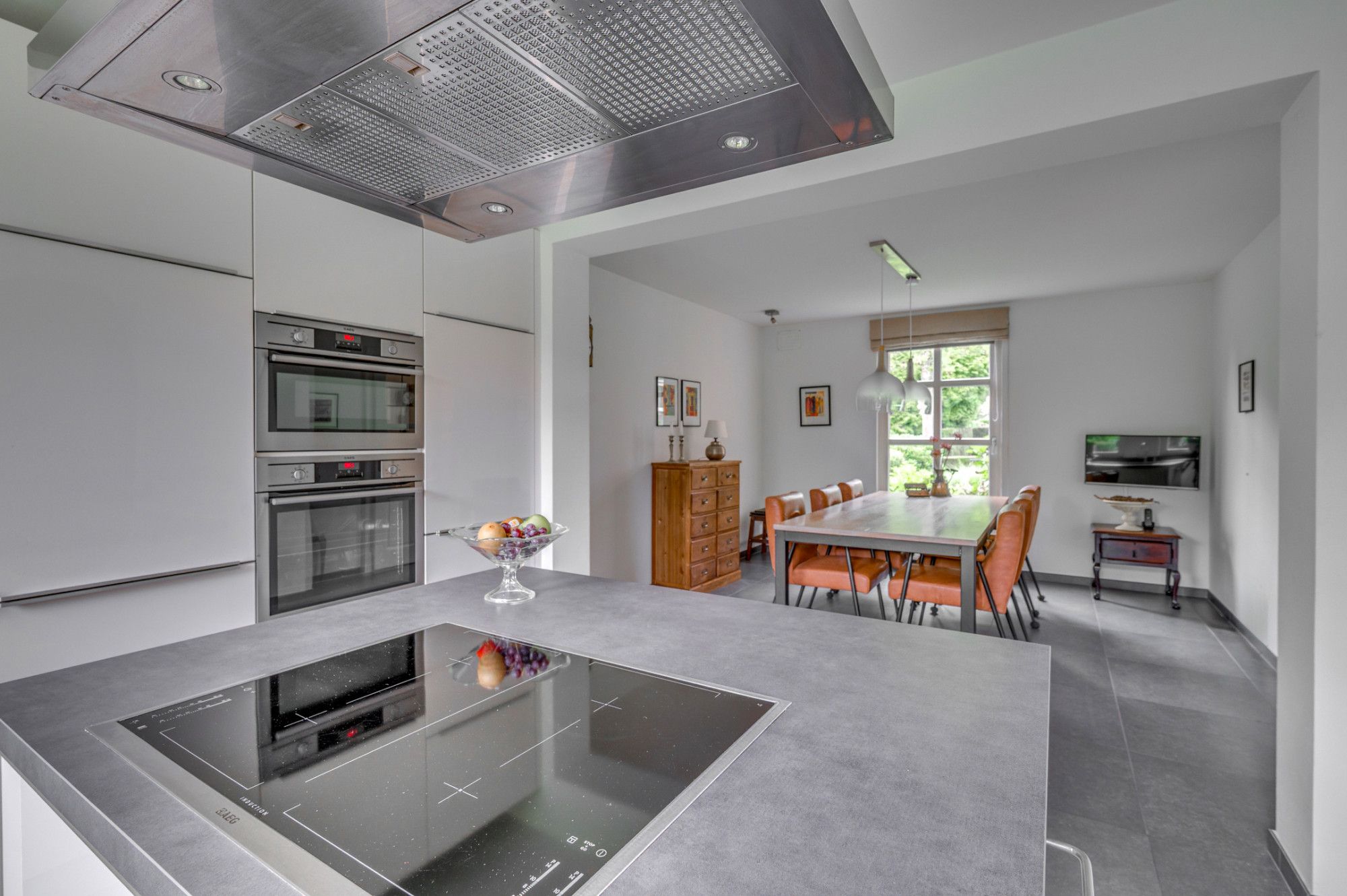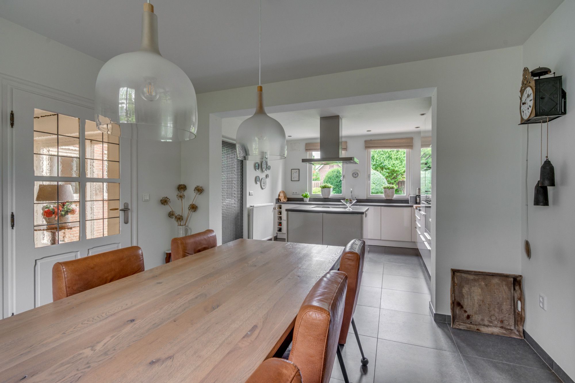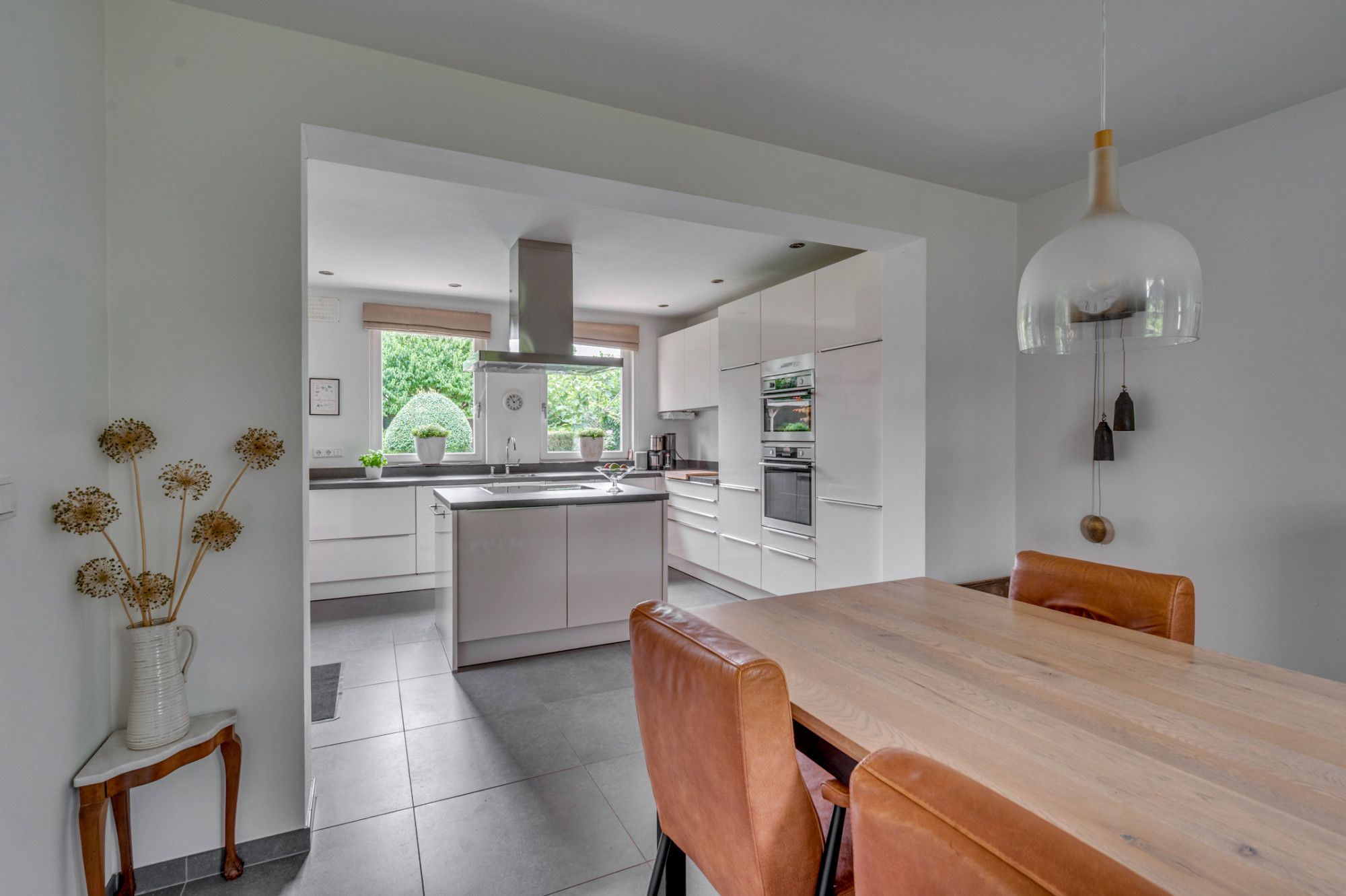 Vanuit de royale beklinkerde eigen oprit is de garage en de entree tot de woning te bereiken. De entree hal geeft toegang tot de trapopgang naar de verdieping, trapgang naar de kelder, separate toiletruimte, meterkast en loopdeur naar de woonkamer. De geheel betegelde toiletruimte is voorzien van een zwevend toilet, fonteintje, verwarming en buitenraam. De ruime woonkamer is voorzien van veel lichtinval door de grote raampartijen en ca. 56m² groot. De woonkamer is ingedeeld in een zitgedeelte aan de voorzijde met gashaard, en een zitgedeelte aan de achterzijde. Middels een schuifpui is er toegang tot de achtertuin. Verder is de woonkamer voorzien van een eikenhouten plankenvloer. De achterzijde van de woonkamer geeft middels een loopdeur toegang tot de wasruimte/ berging. Deze ruimte is voorzien van de witgoedaansluitingen, warm en koud water kraan en een loopdeur naar de tuin. De zeer ruime keuken met aansluitende eetkamer is gezamenlijk ca. 27m² groot. De ruimte is voorzien van een antracieten tegelvloer. De keuken beschikt over een ruim kookeiland met een 4-pits inductiekookplaat, afzuigkap en veel opbergruimte. Verder is de keuken voorzien van een koelkast, combi-magnetron, oven, vaatwasmachine, zeer veel opbergruimte en een loopdeur naar de tuin.