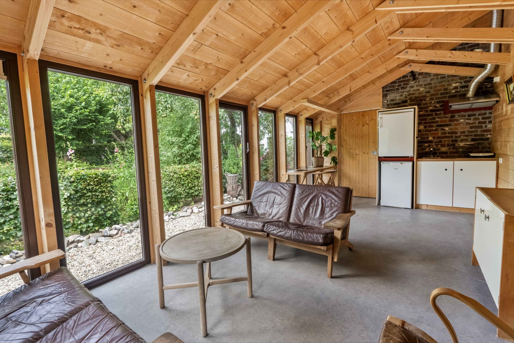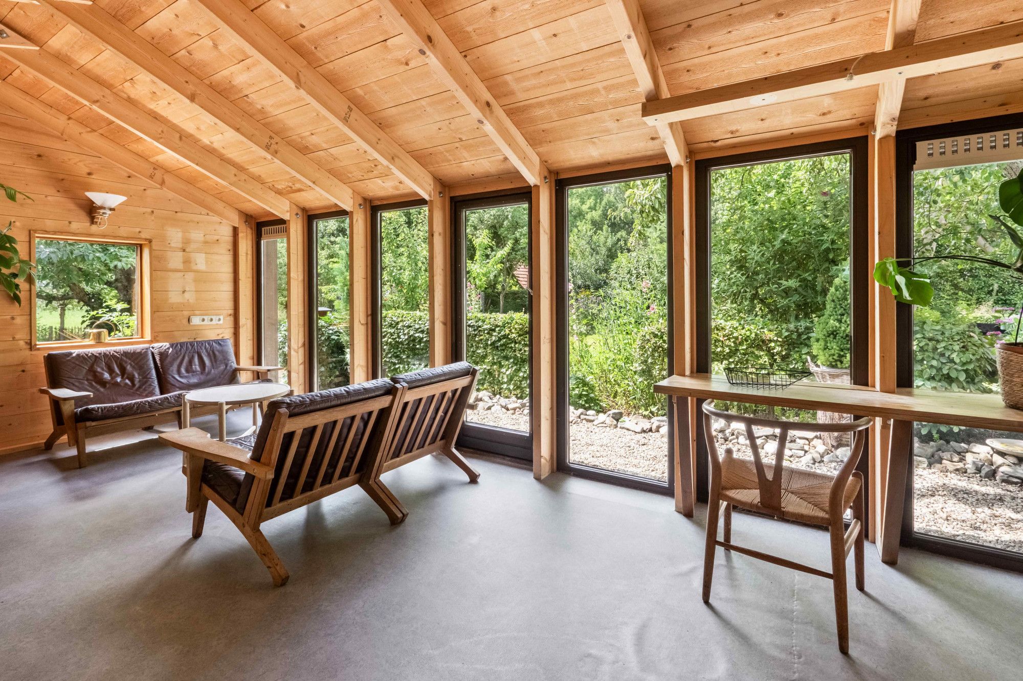 Op het perceel bevindt zich een houten gastenverblijf, volledig geïsoleerd en dankzij de vele ramen met een prettige natuurlijke lichtinval.