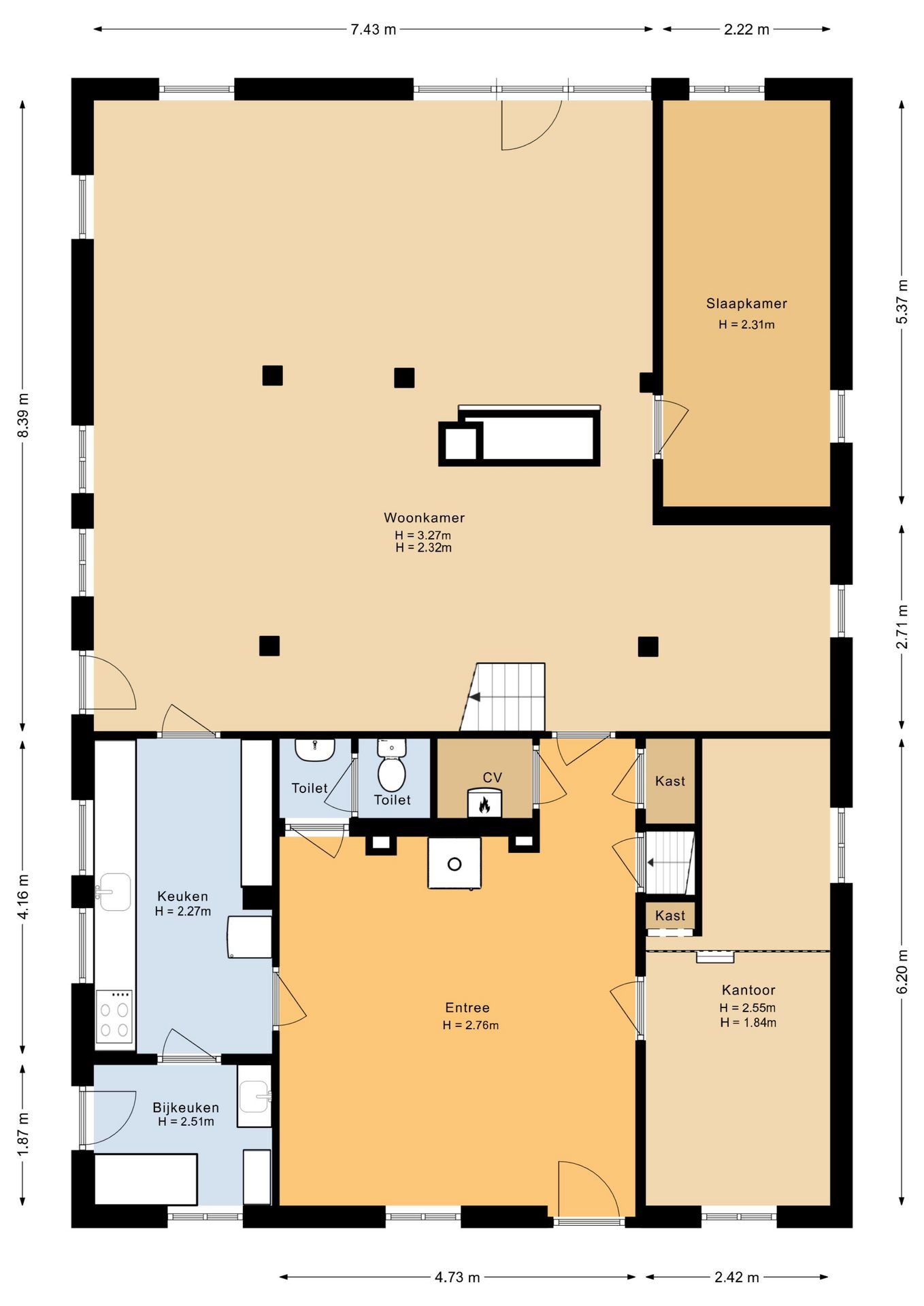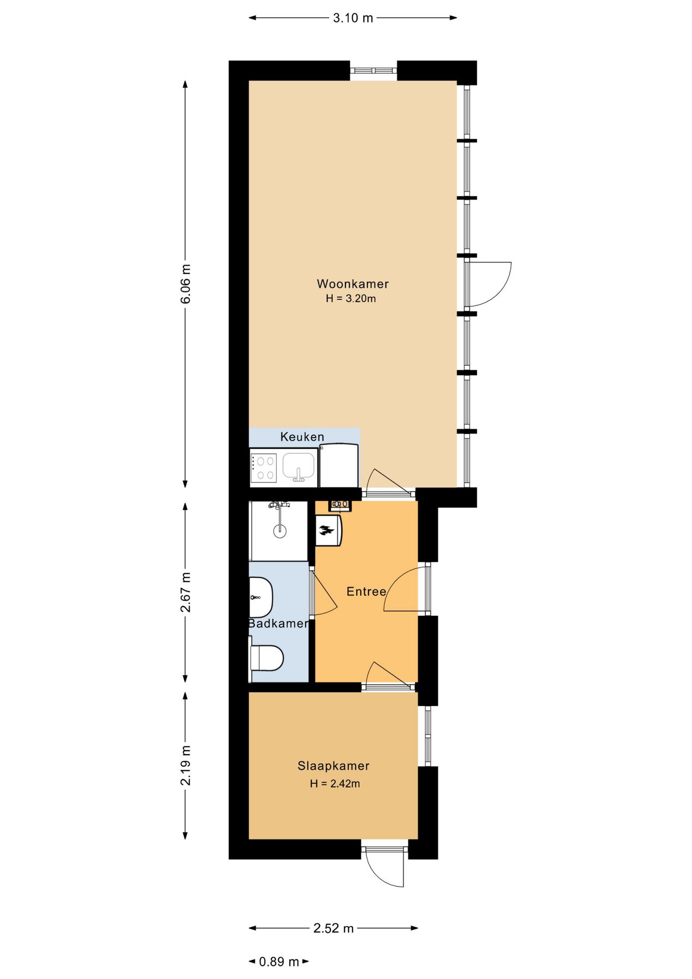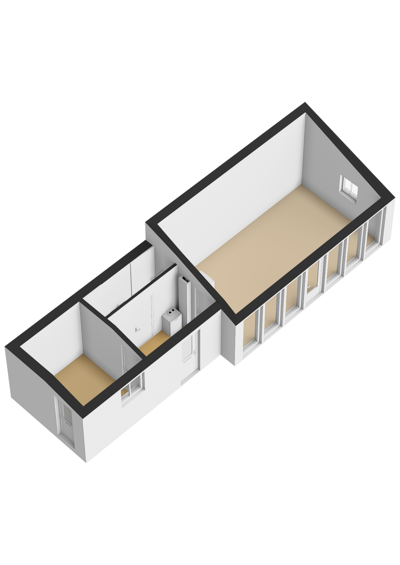 De ruimte is praktisch ingedeeld en voorzien van doorlopende vloerverwarming. Er is een eenvoudige maar functionele kitchenette in de woon-/eetkamer (ca. 19m2), een gezellige slaapkamer (ca. 5,5m2) en een nette doucheruimte met hangcloset en wastafel.