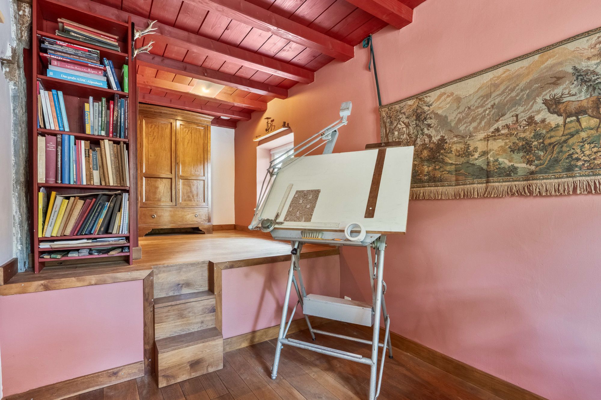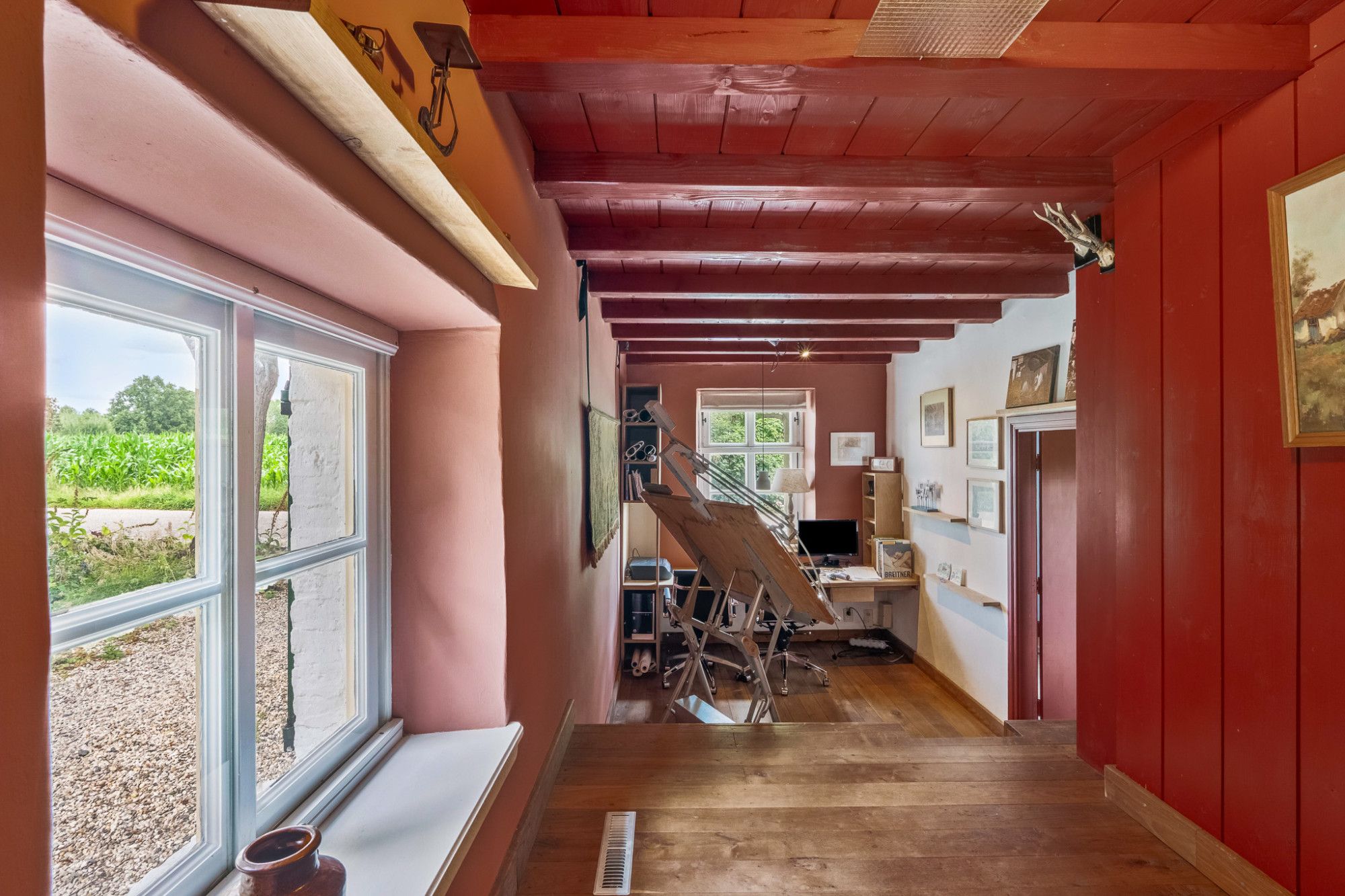 De charmante opkamer (ca. 13m2), gelegen boven de kelder, is momenteel ingericht als kantoor en biedt een rustige werkplek.