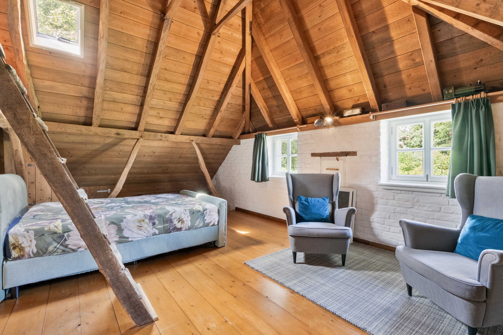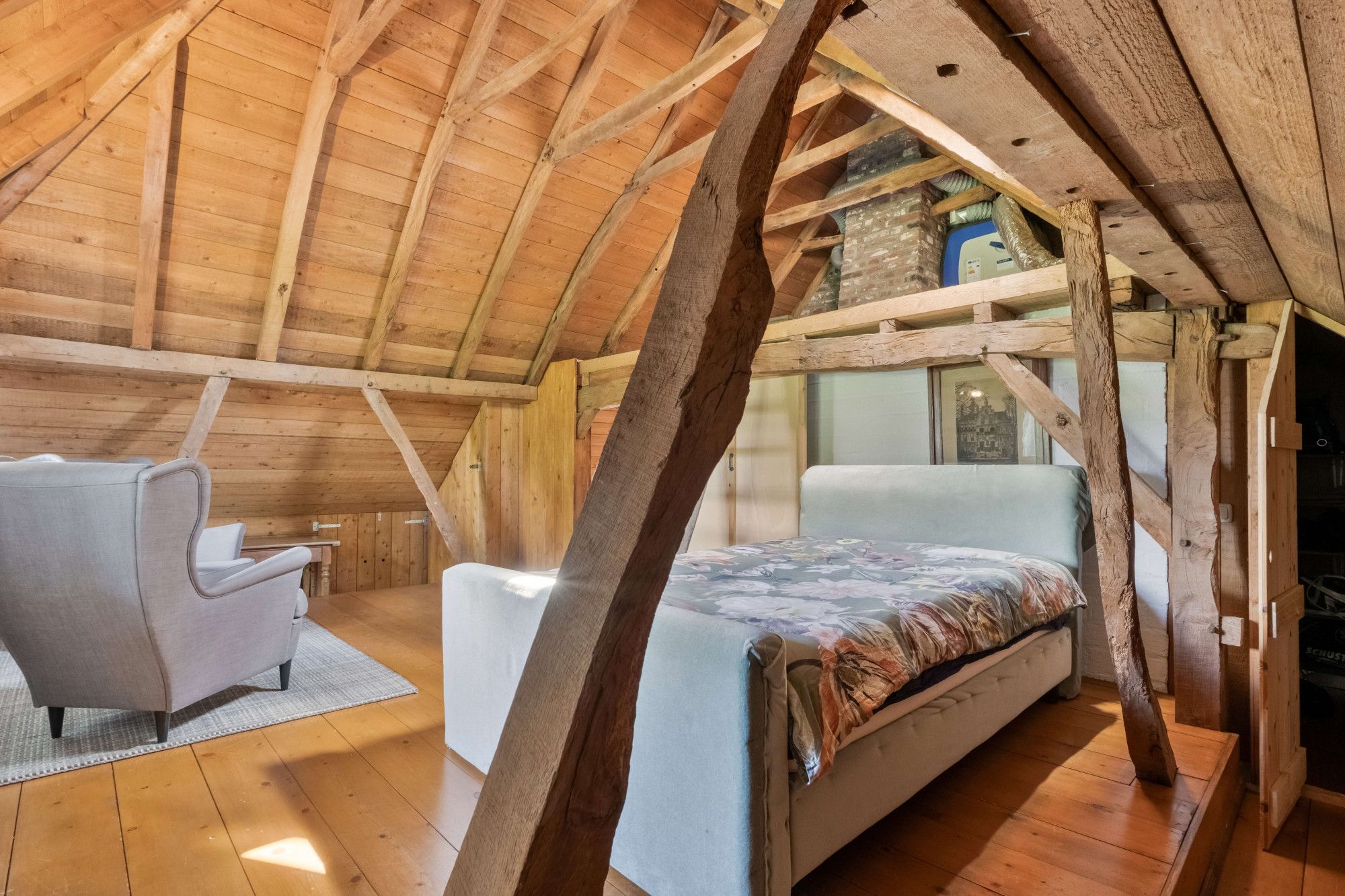Op de begane grond bevindt zich bovendien een slaapkamer (ca. 12m2) met charmante schuurramen, die zowel sfeer als daglicht brengen in deze comfortabele ruimte.