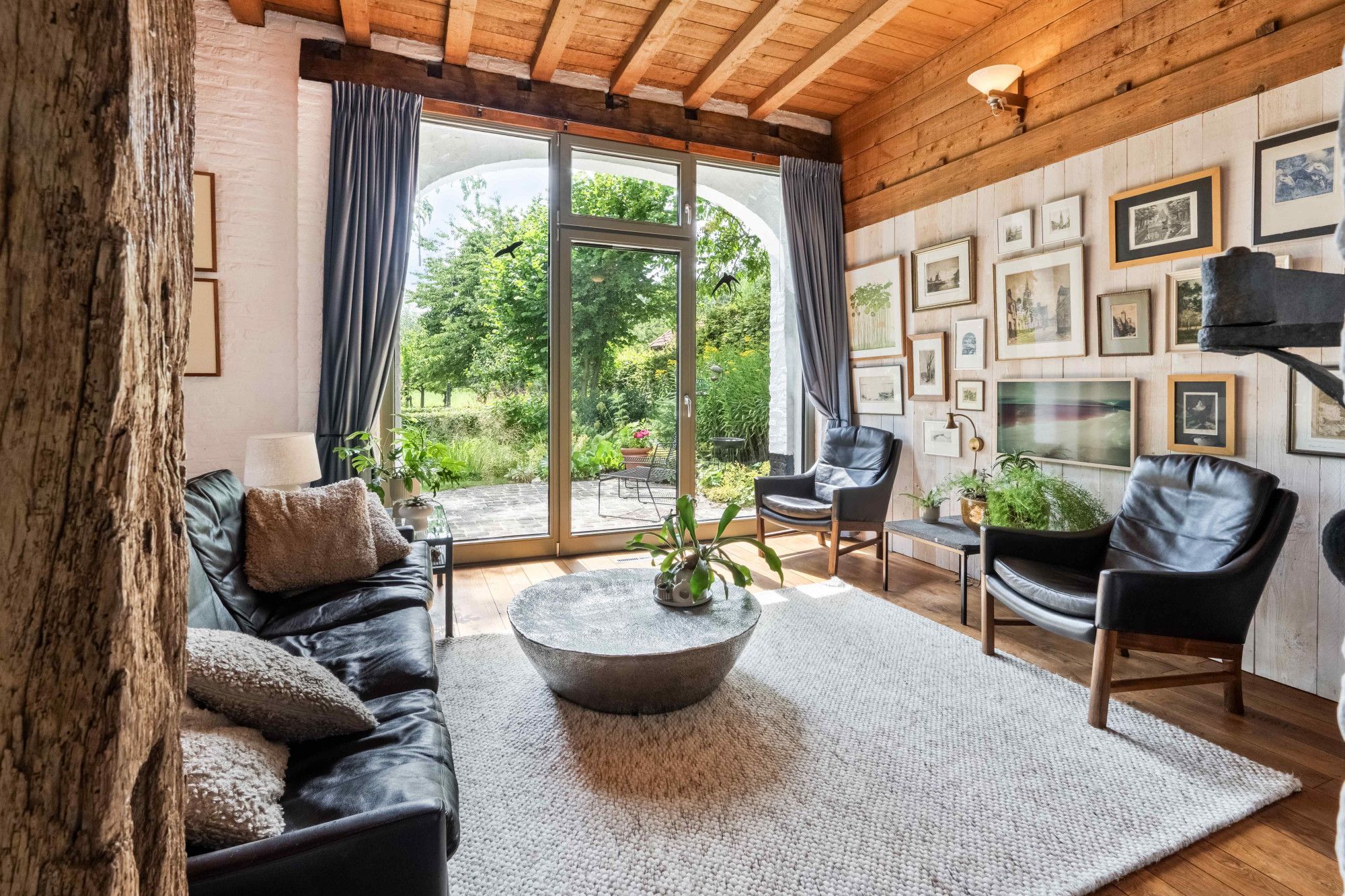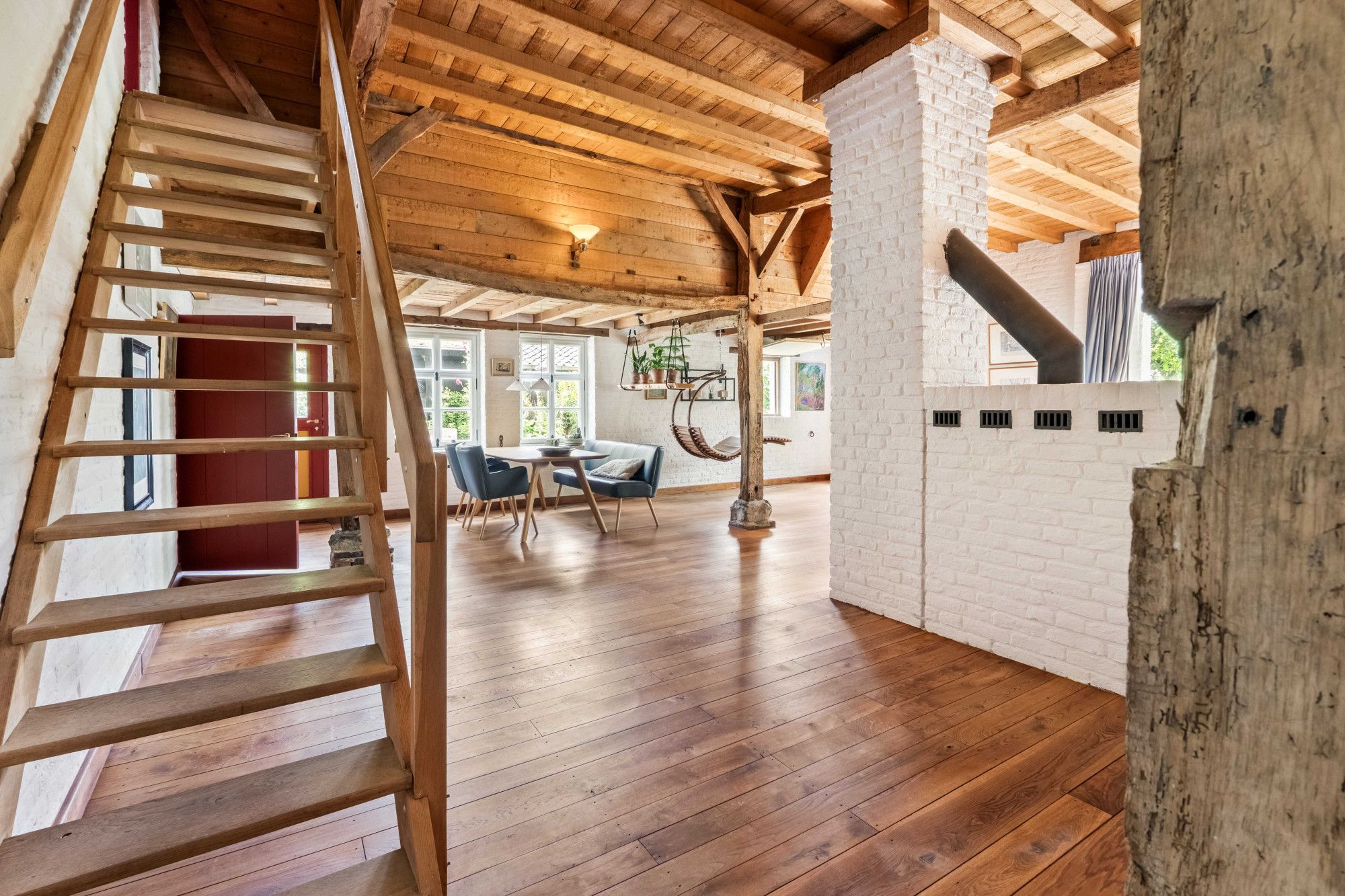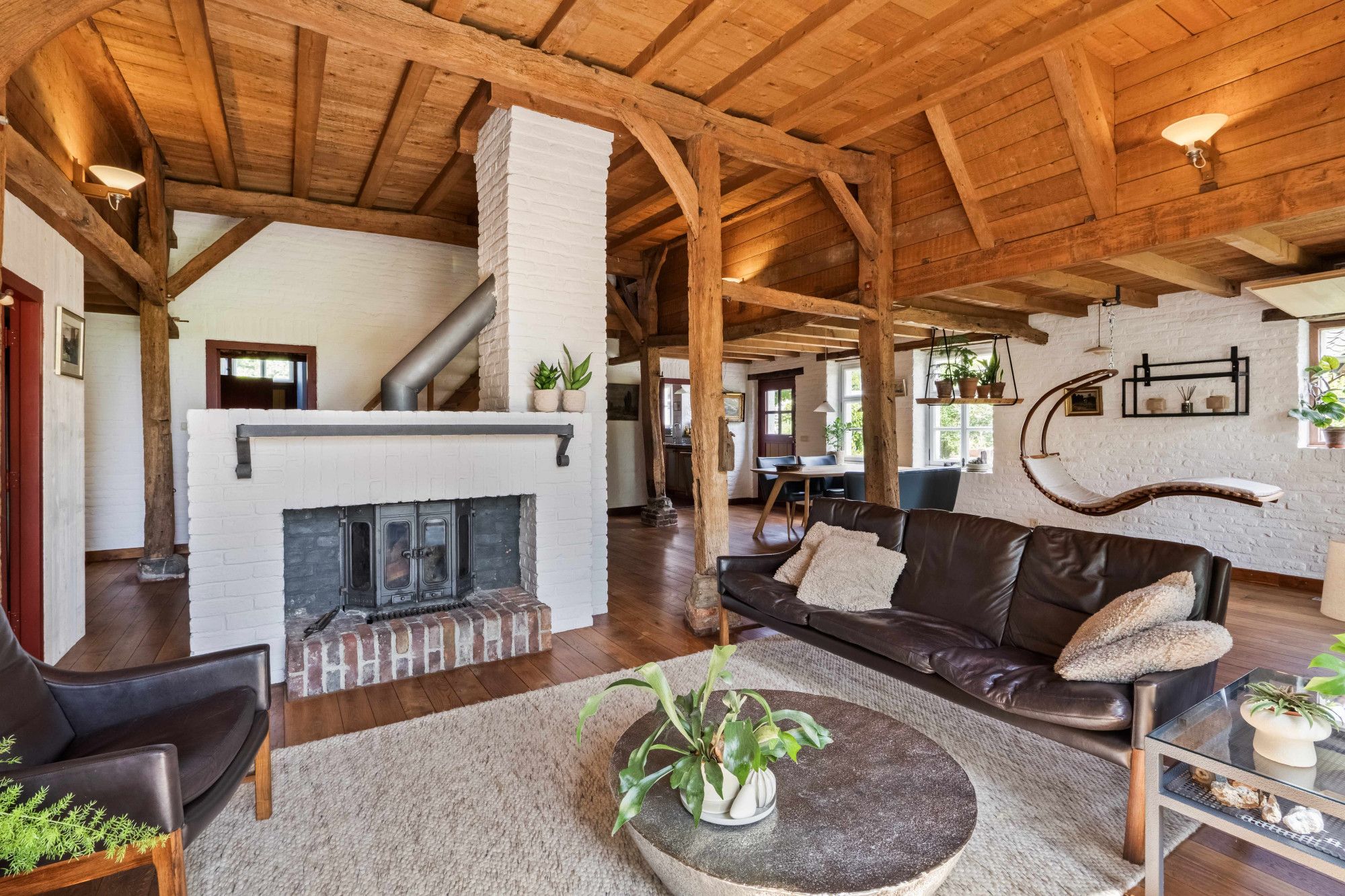 De ruime woonkamer (ca. 70m2) heeft een open en warme sfeer, mede dankzij de zichtbare eikenhouten draagconstructie, de massief eikenhouten vloer en de open trap naar de verdieping. De open haard vormt het hart van de ruimte.