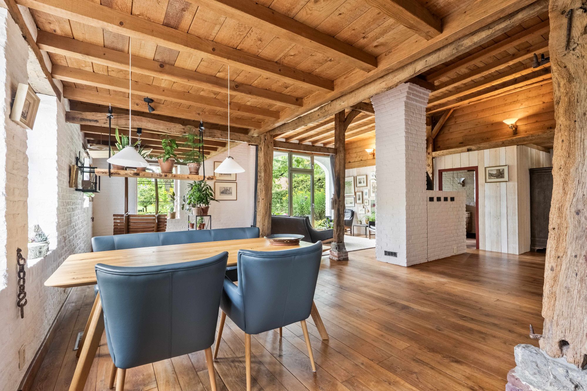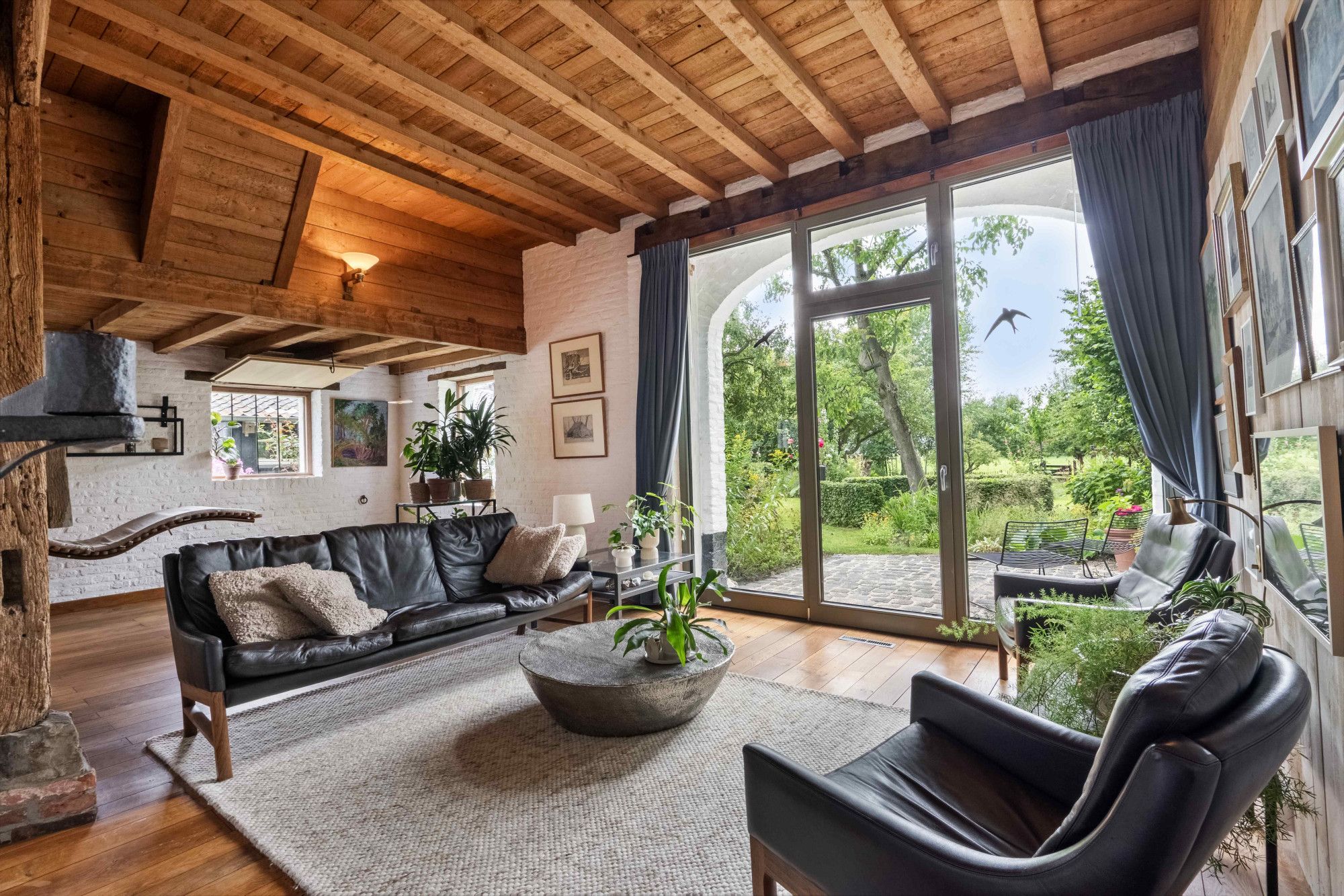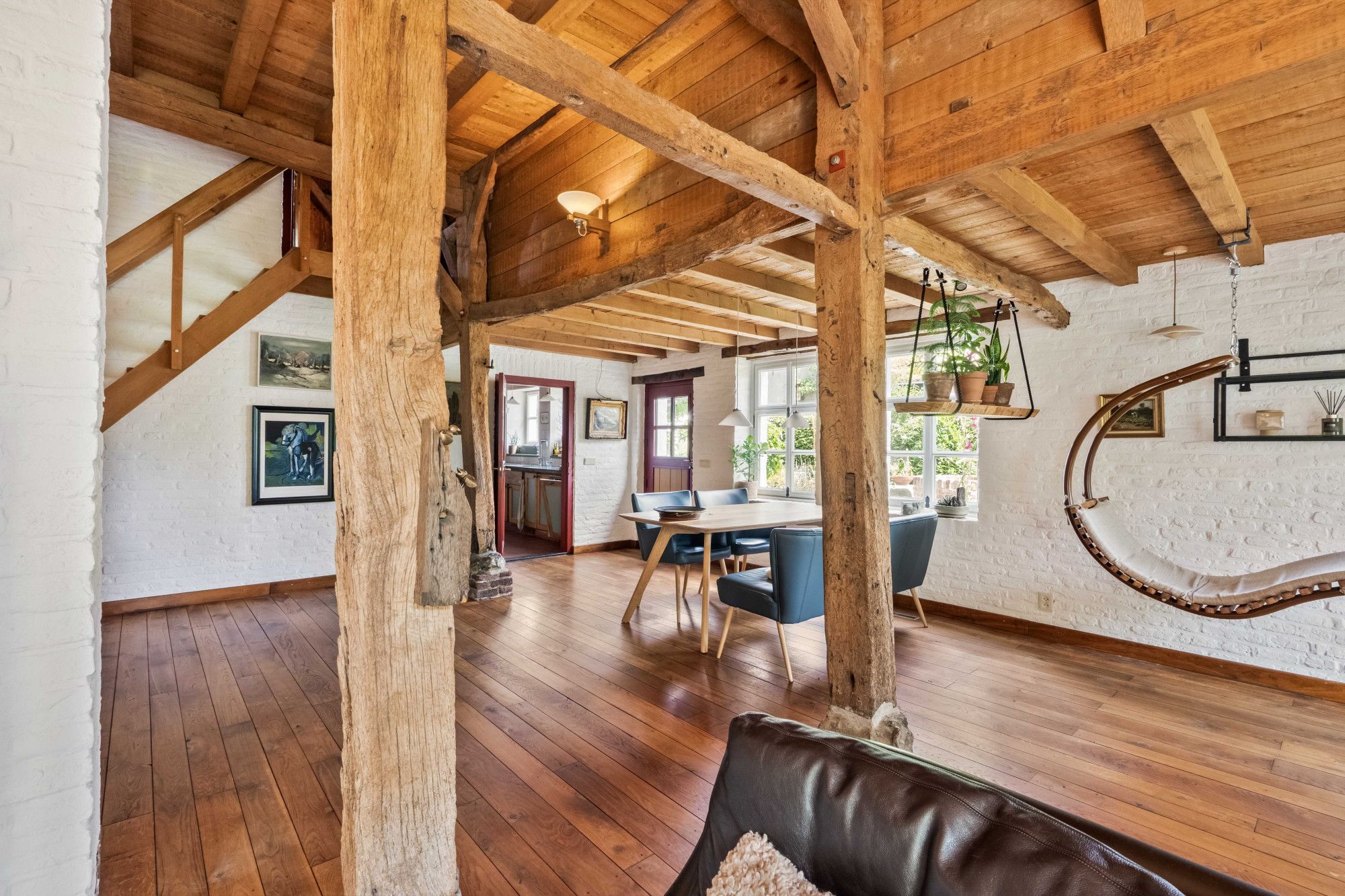 De ruime woonkamer (ca. 70m2) heeft een open en warme sfeer, mede dankzij de zichtbare eikenhouten draagconstructie, de massief eikenhouten vloer en de open trap naar de verdieping. De open haard vormt het hart van de ruimte.
