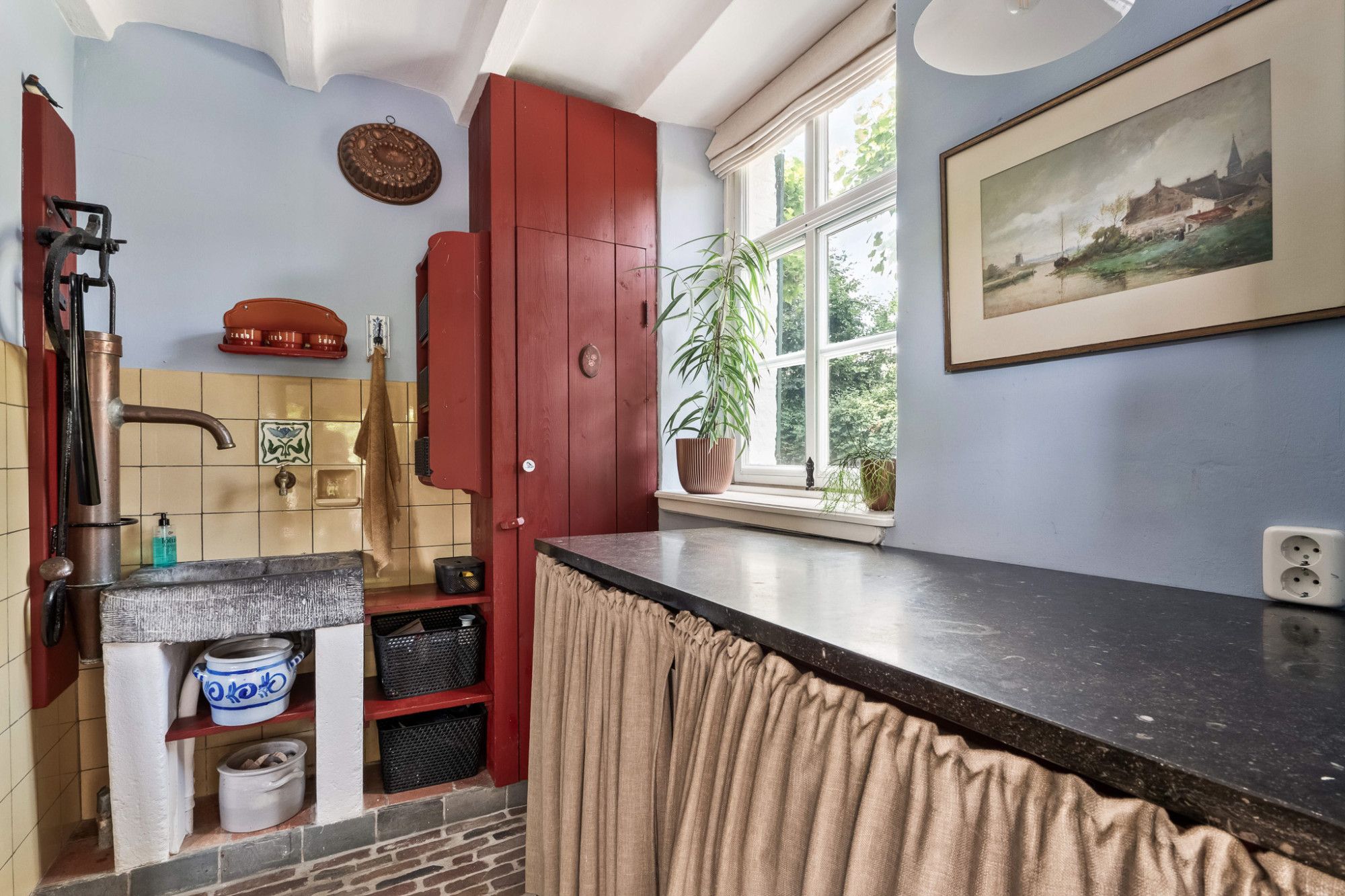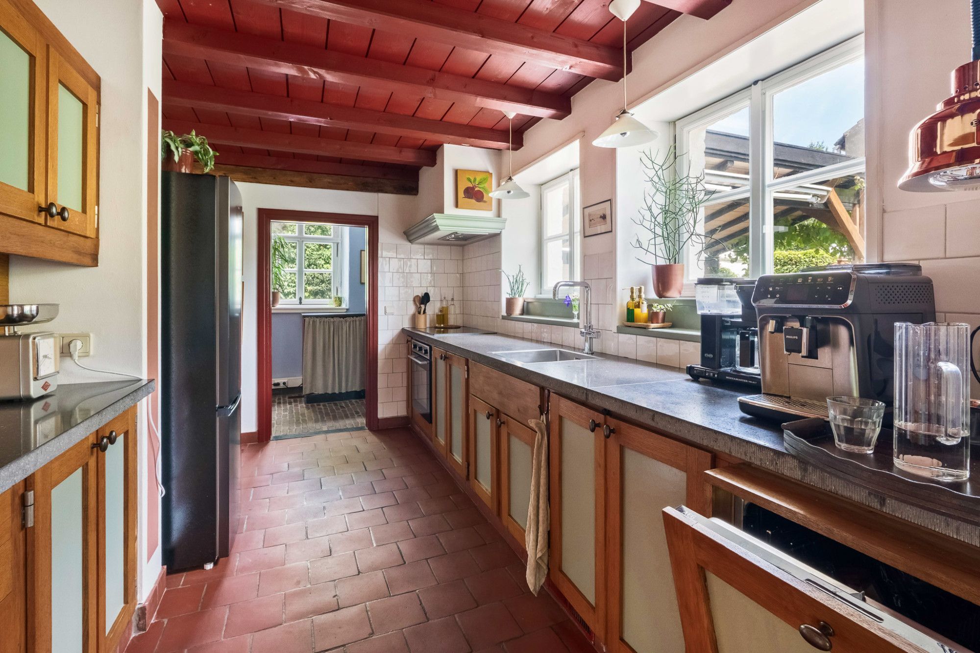 Aansluitend bevindt zich de bijkeuken met praktische bergruimte, wasbak en loopdeur naar tuin.
