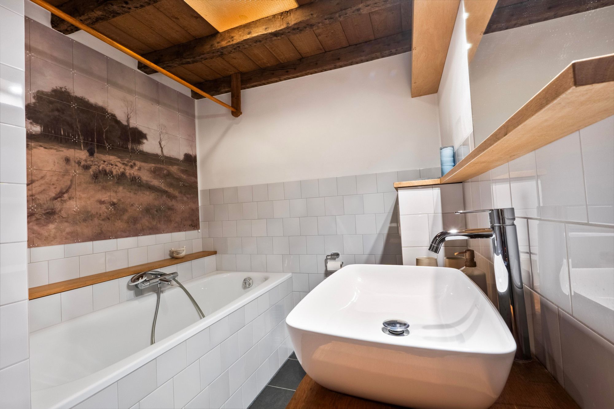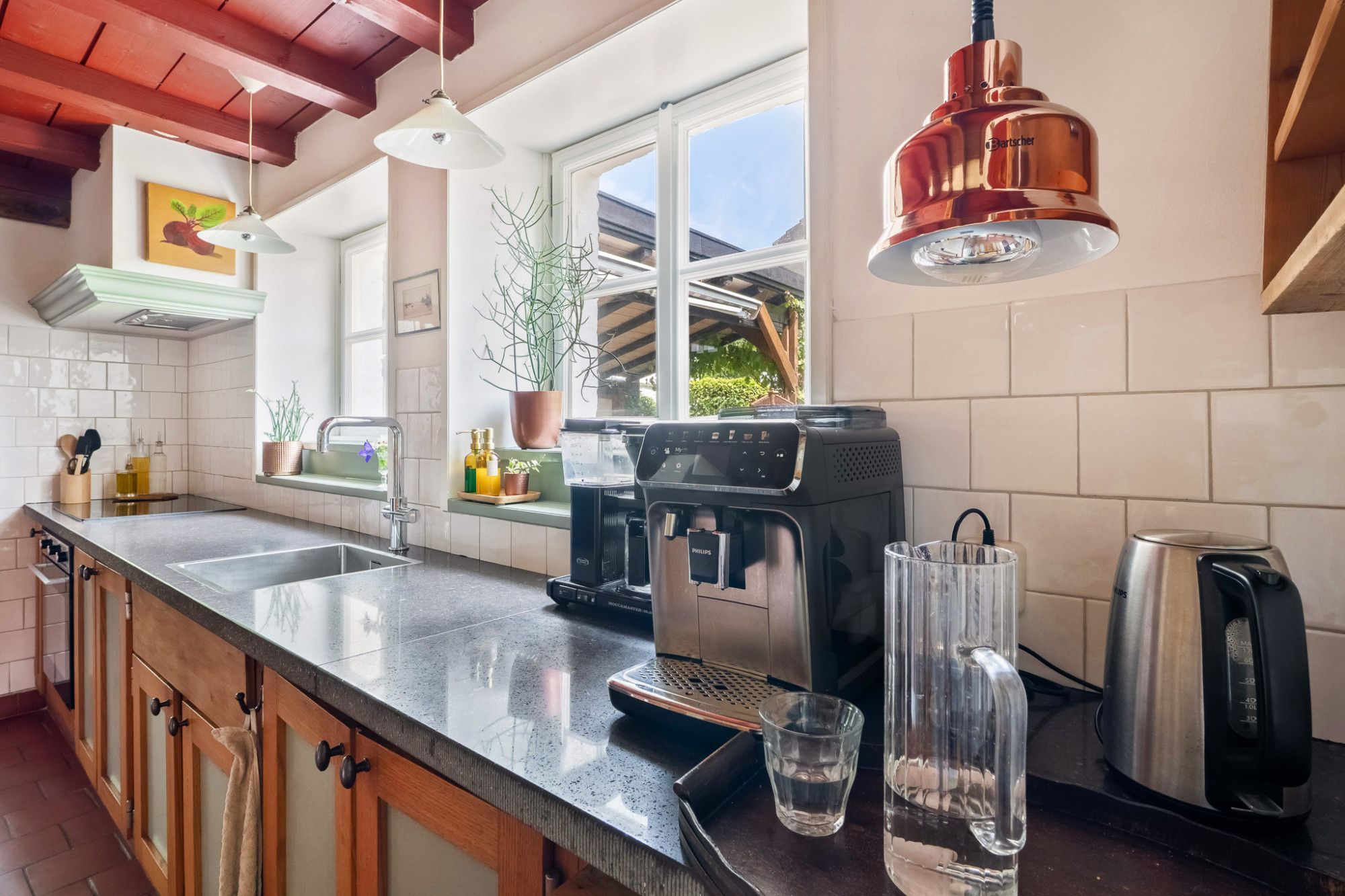 De gesloten keuken (10,5m2) straalt landelijke klasse uit en is voorzien van massief houten keukenkastjes met een stenen werkblad en diverse moderne apparatuur zoals een inductiekookplaat, afzuigkap, vaatwasser, oven en een hoogwaardige Grohe-kraan met gekoeld, gefilterd én bruisend water.