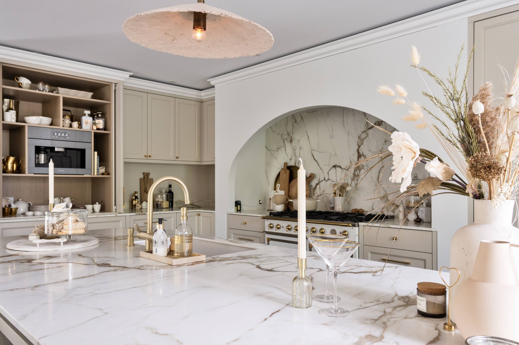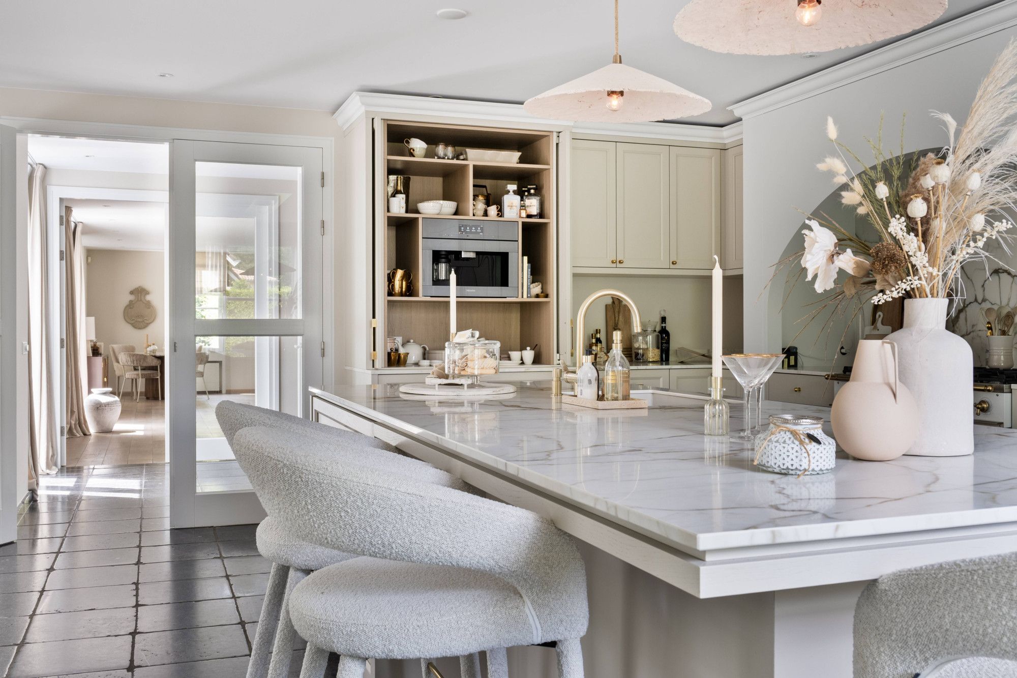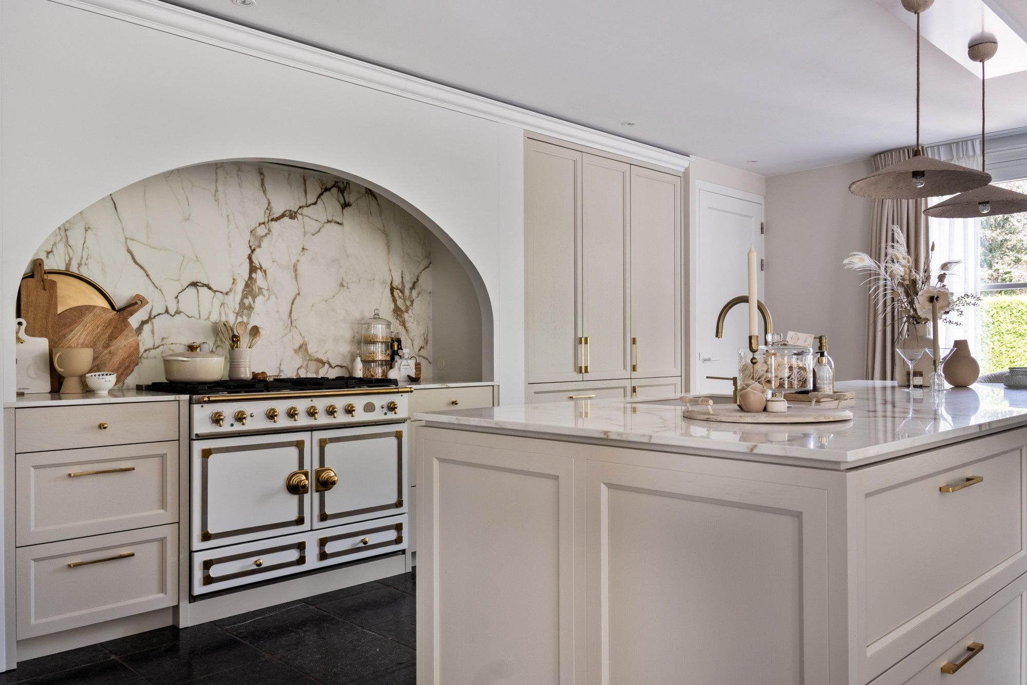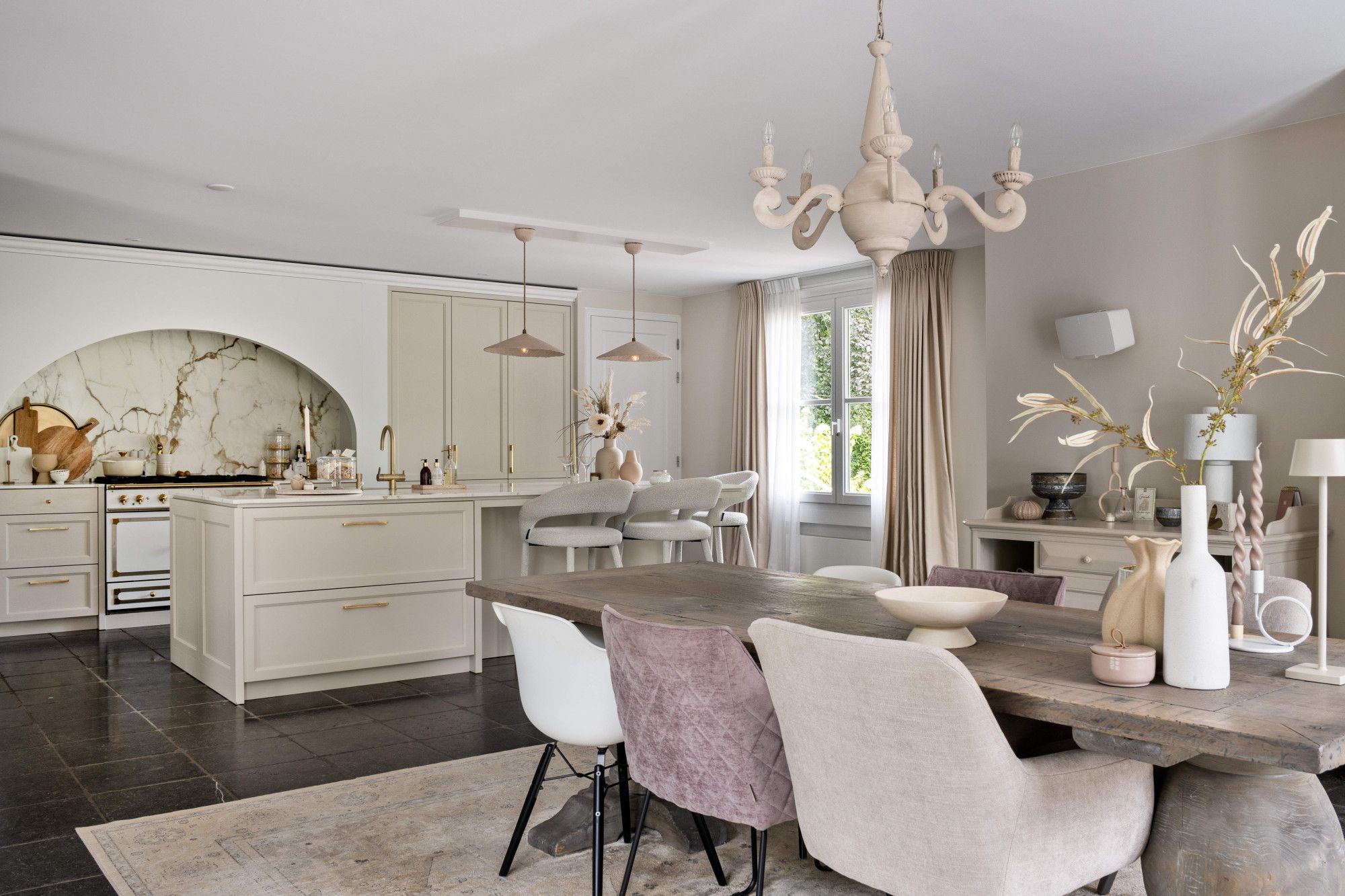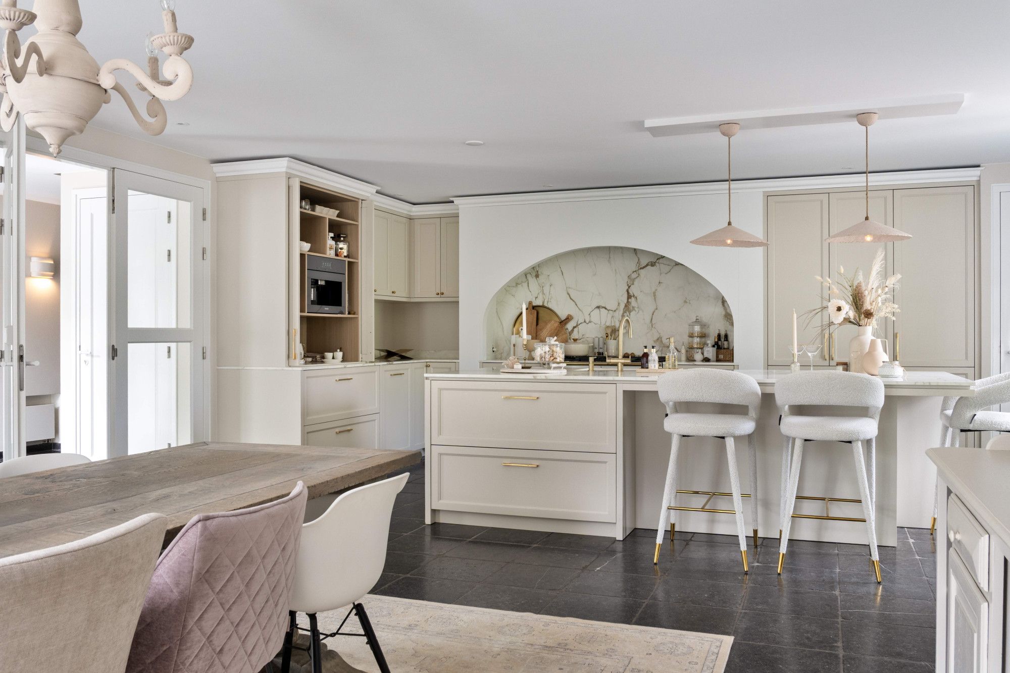 De leefkeuken vormt een sfeervolle ruimte waar ambacht, luxe en dagelijks comfort samenkomen. Een speciaal ontworpen nis-meubel, geïnspireerd op een Amerikaans concept, fungeert als ‘baristabar’. Hoogwaardige apparatuur, waaronder een karaktervol 'La Cornue' gasfornuis, onderstreept het exclusieve karakter. Het royale kookeiland nodigt uit tot samen koken en tafelen, terwijl de overvloed aan opbergruimte zorgt voor rust en overzicht. Een subtiele touch van metallic details en verfijnde marmeren accenten versterken het luxueuze gevoel en maken het geheel tijdloos elegant.