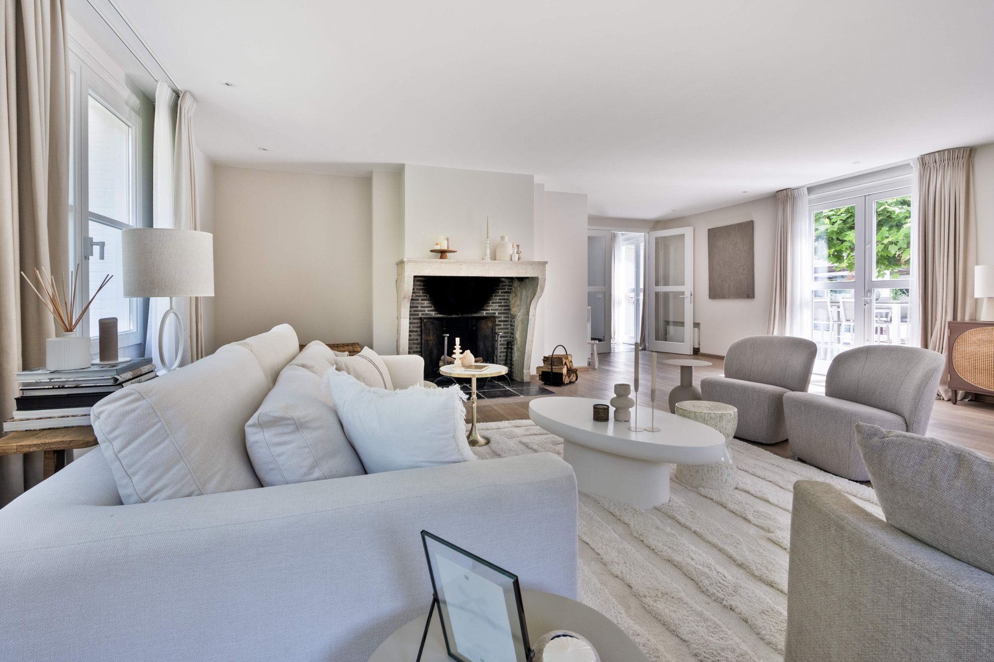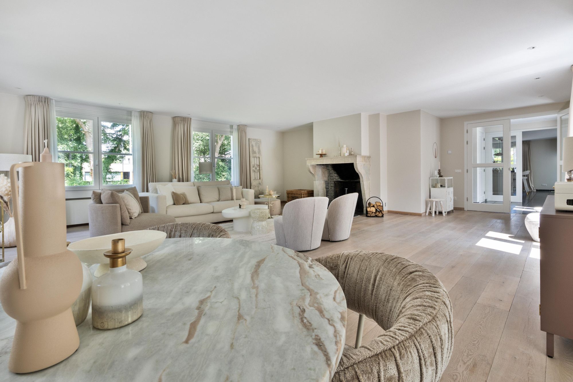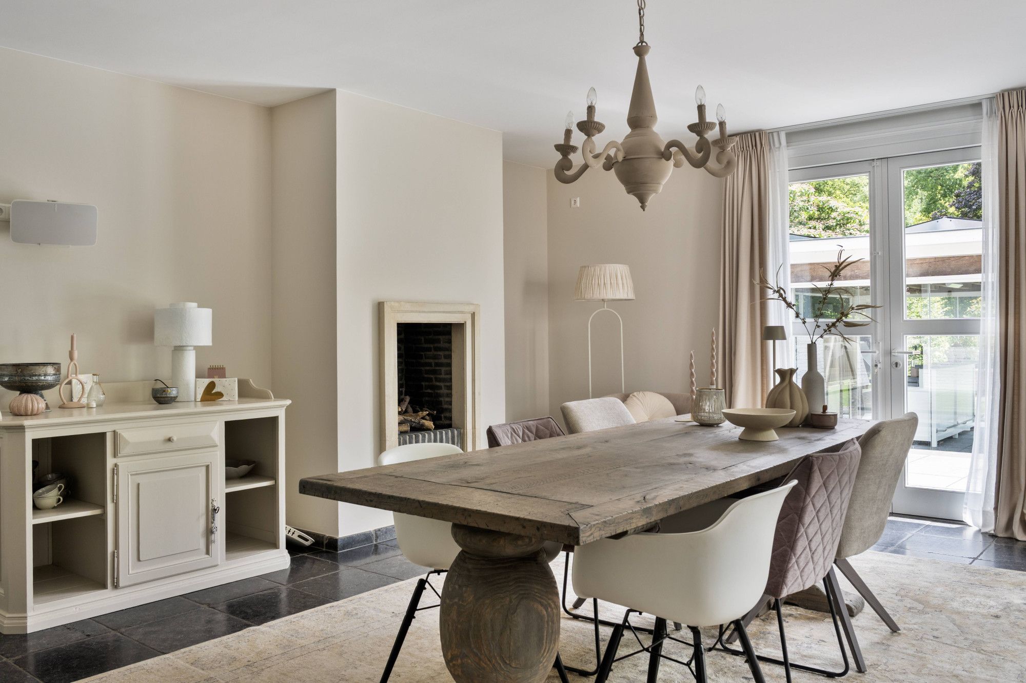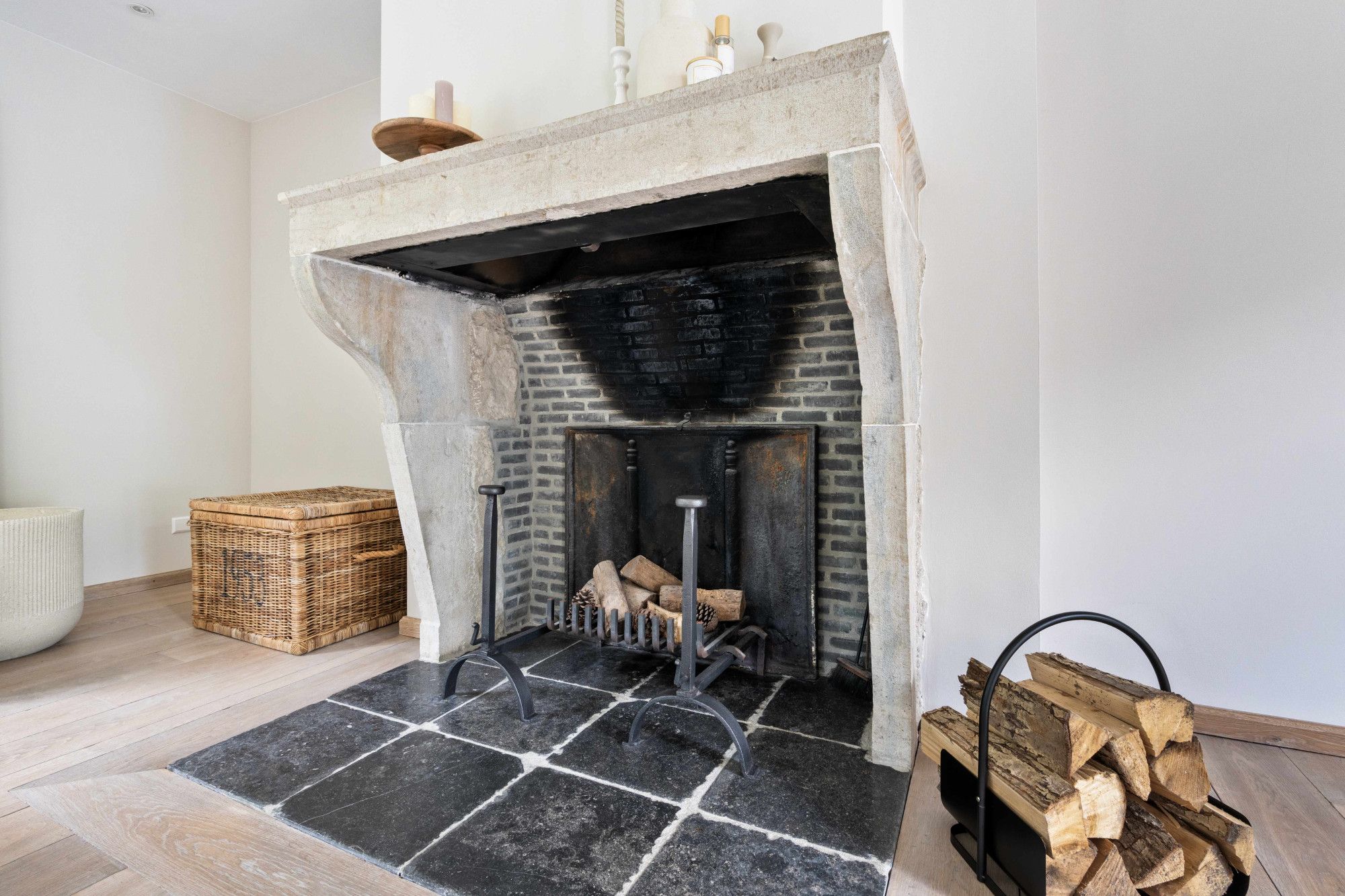 De royale living vormt het kloppend hart van de woning. Openslaande deuren, verfraaid met een 'Piet Boon'-beslag, verbinden binnen moeiteloos met het terras en laten daglicht rijkelijk binnenstromen. Centraal in deze ruimte prijkt een indrukwekkende haardpartij, uitgevoerd in kalksteen, die niet alleen warmte biedt maar ook fungeert als architectonisch statement. De authentieke eikenhouten vloer onderstreept het karakter van het huis en voegt een natuurlijke, tijdloze basis toe.