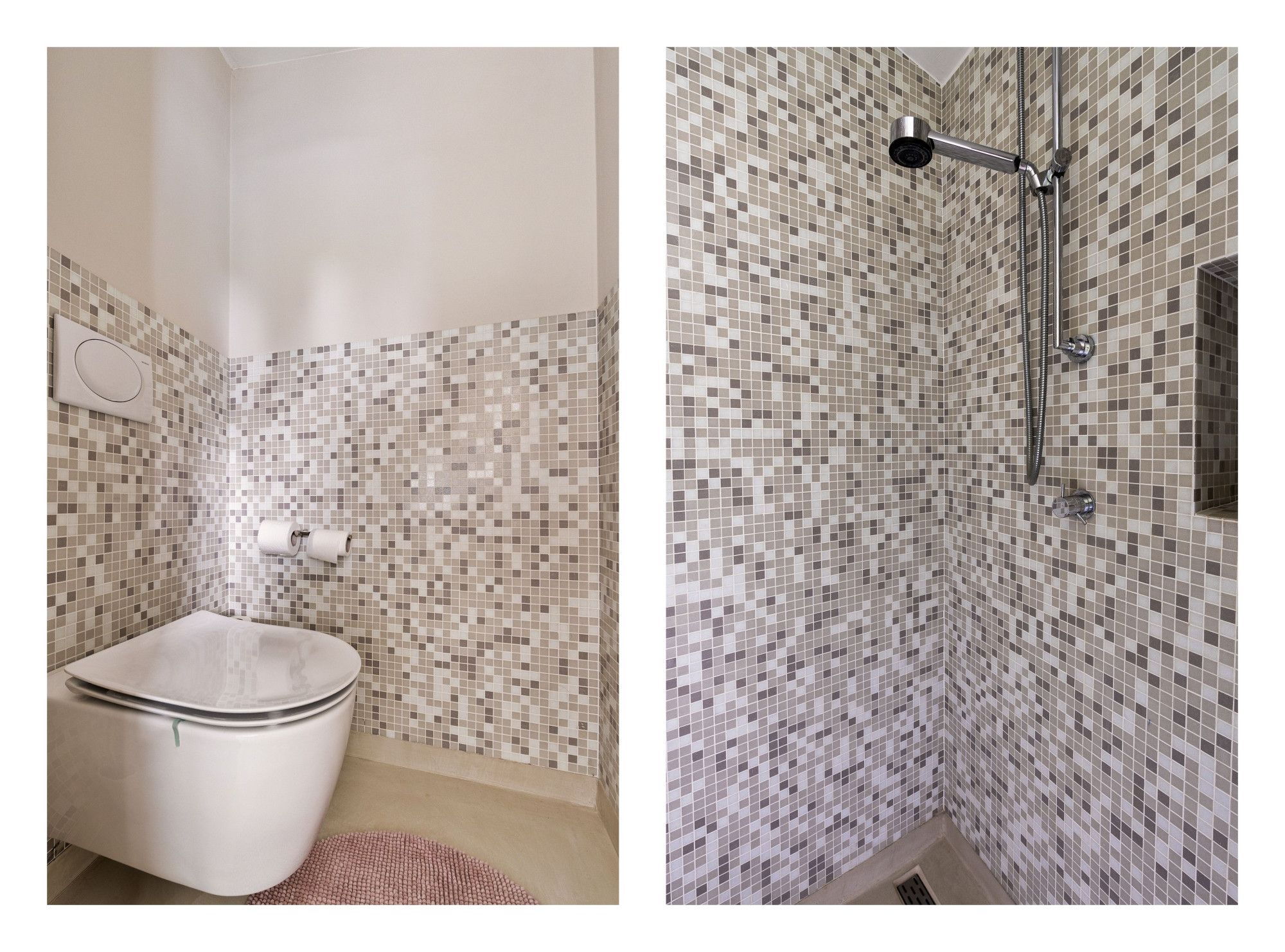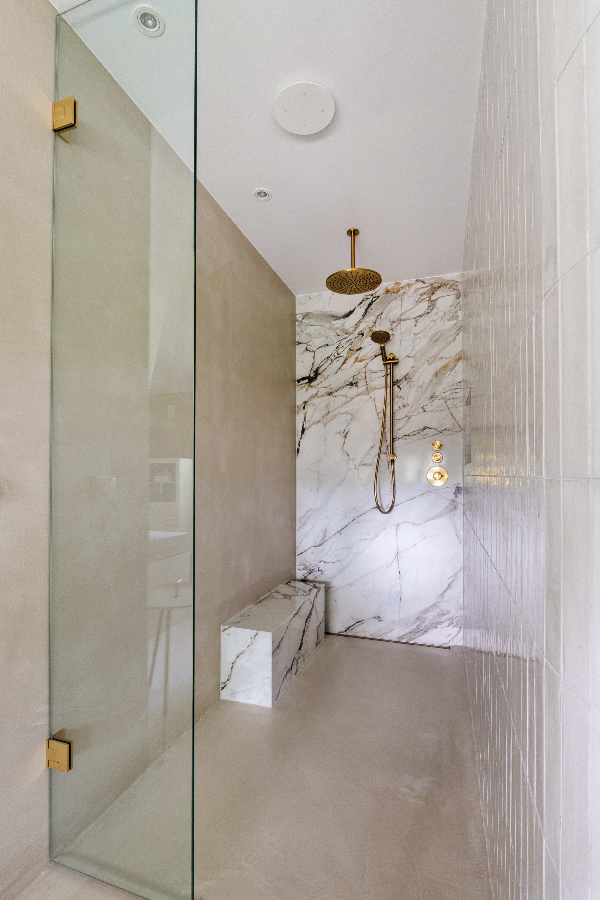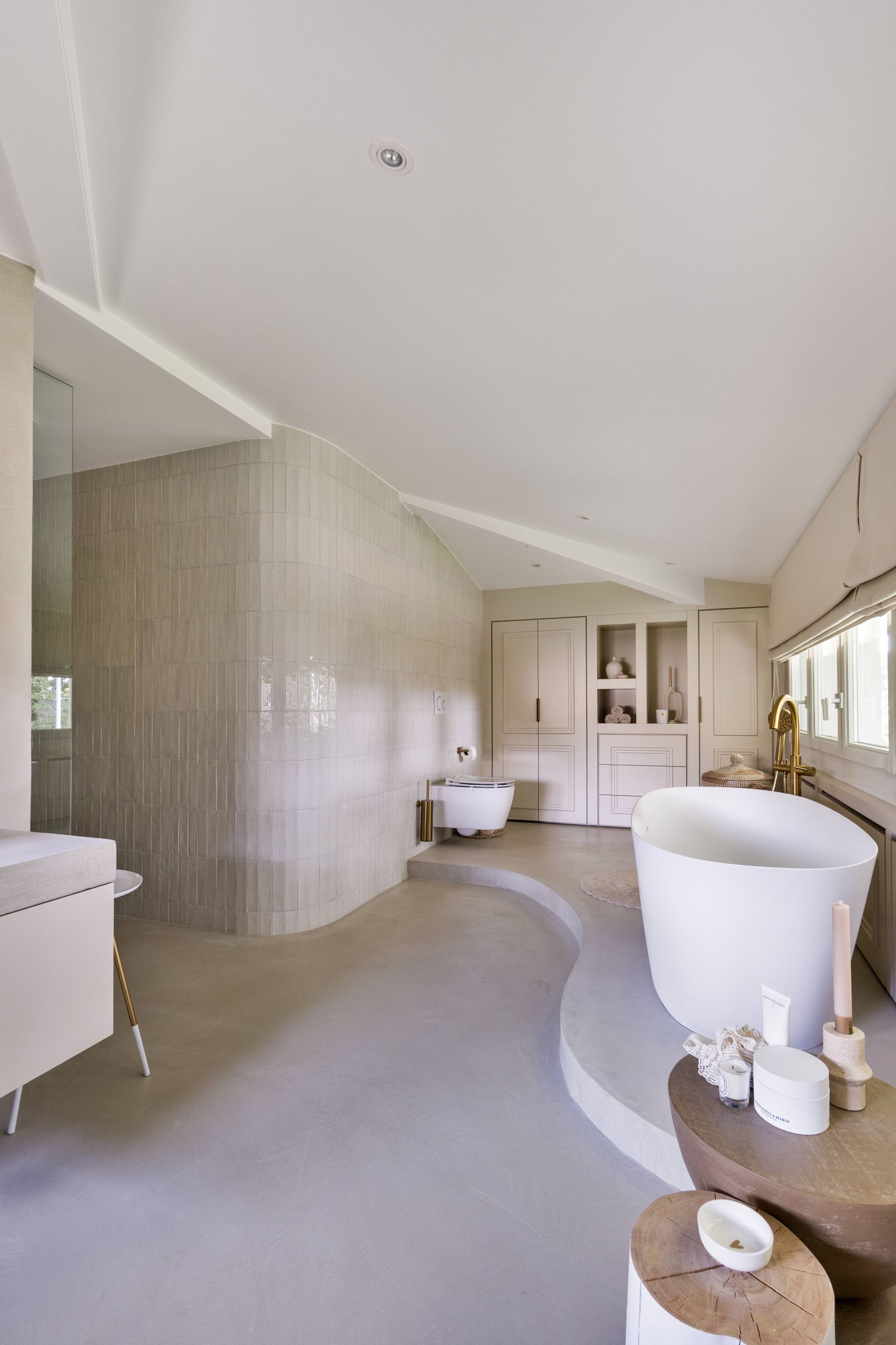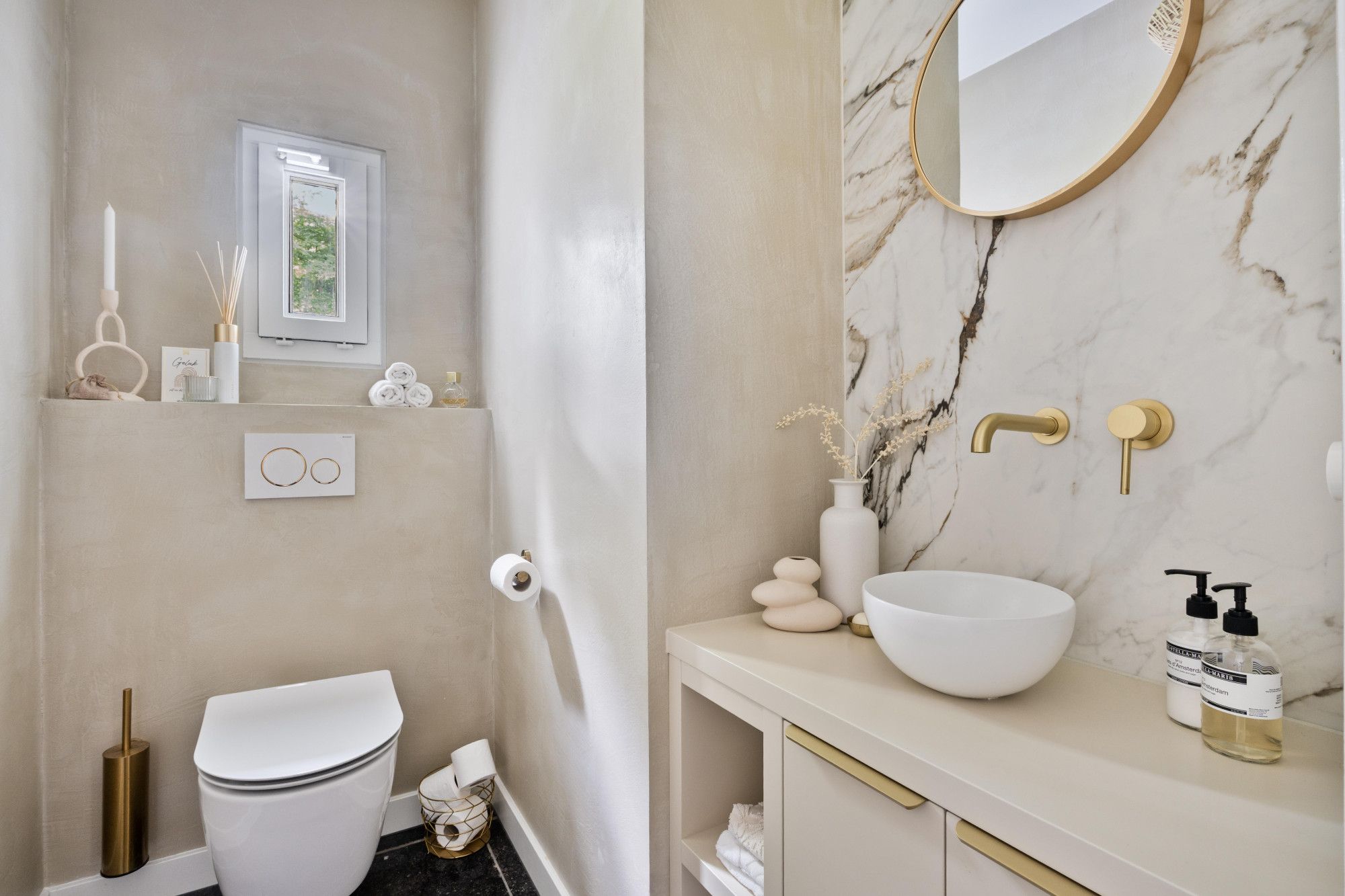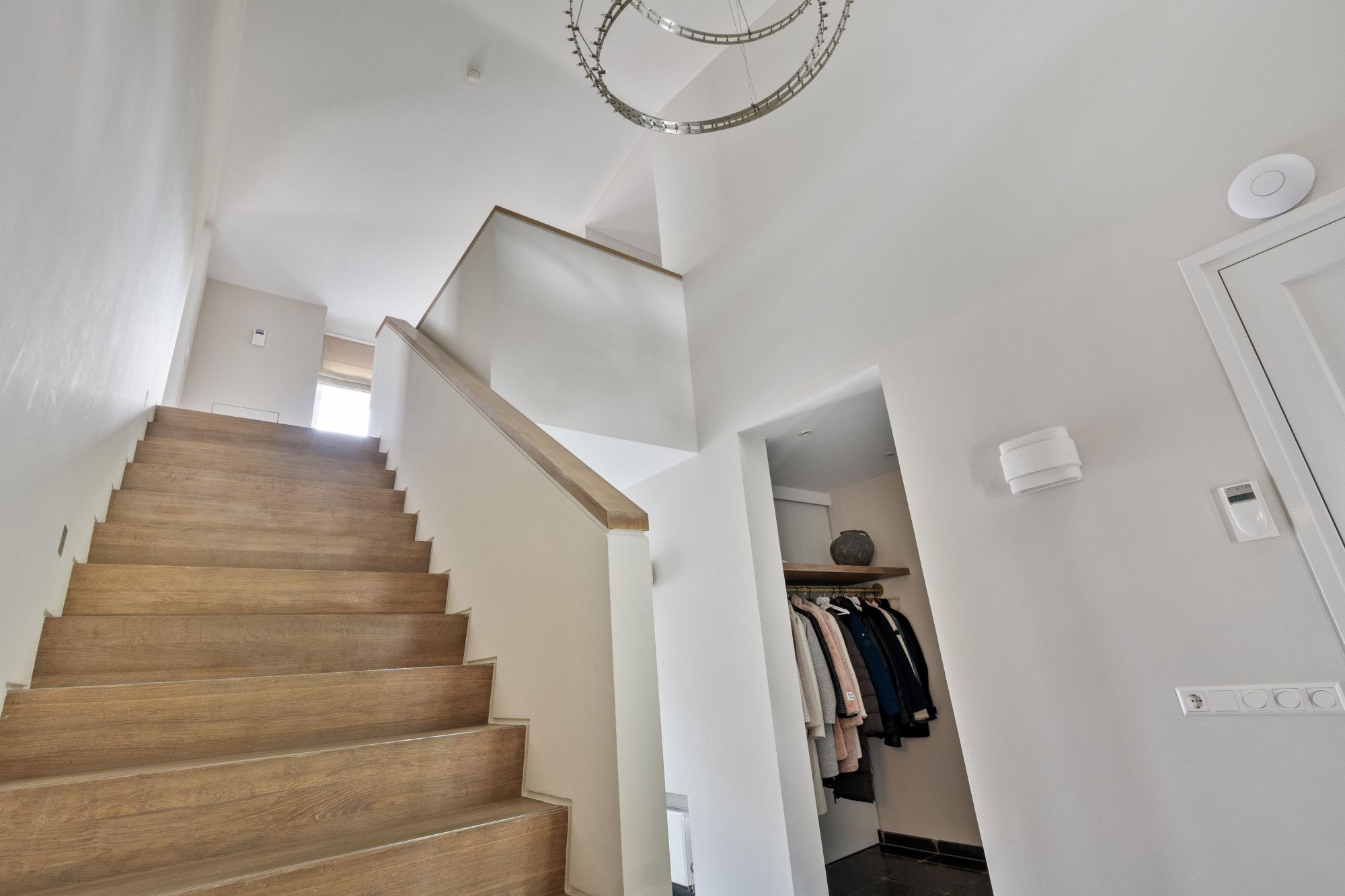 De entree met een fraaie kloostervloer omarmt je met een verfijnd ton-sur-ton kleurenpalet, een zorgvuldig afgestemde compositie van zachte greige-tinten, die rust en eenheid creëert. Het spel van licht, natuurlijke materialen en ingetogen luxe vormt een stijlvolle voorbode van wat deze villa verder te bieden heeft.