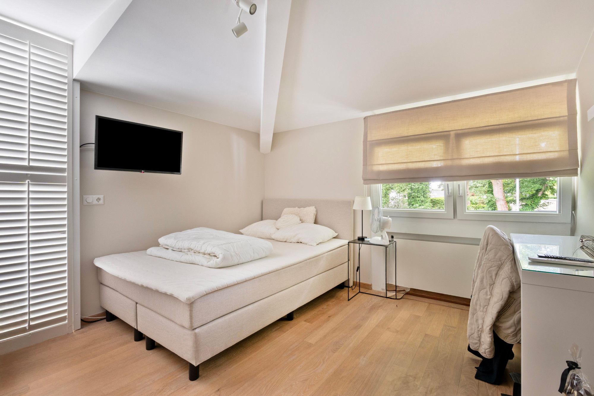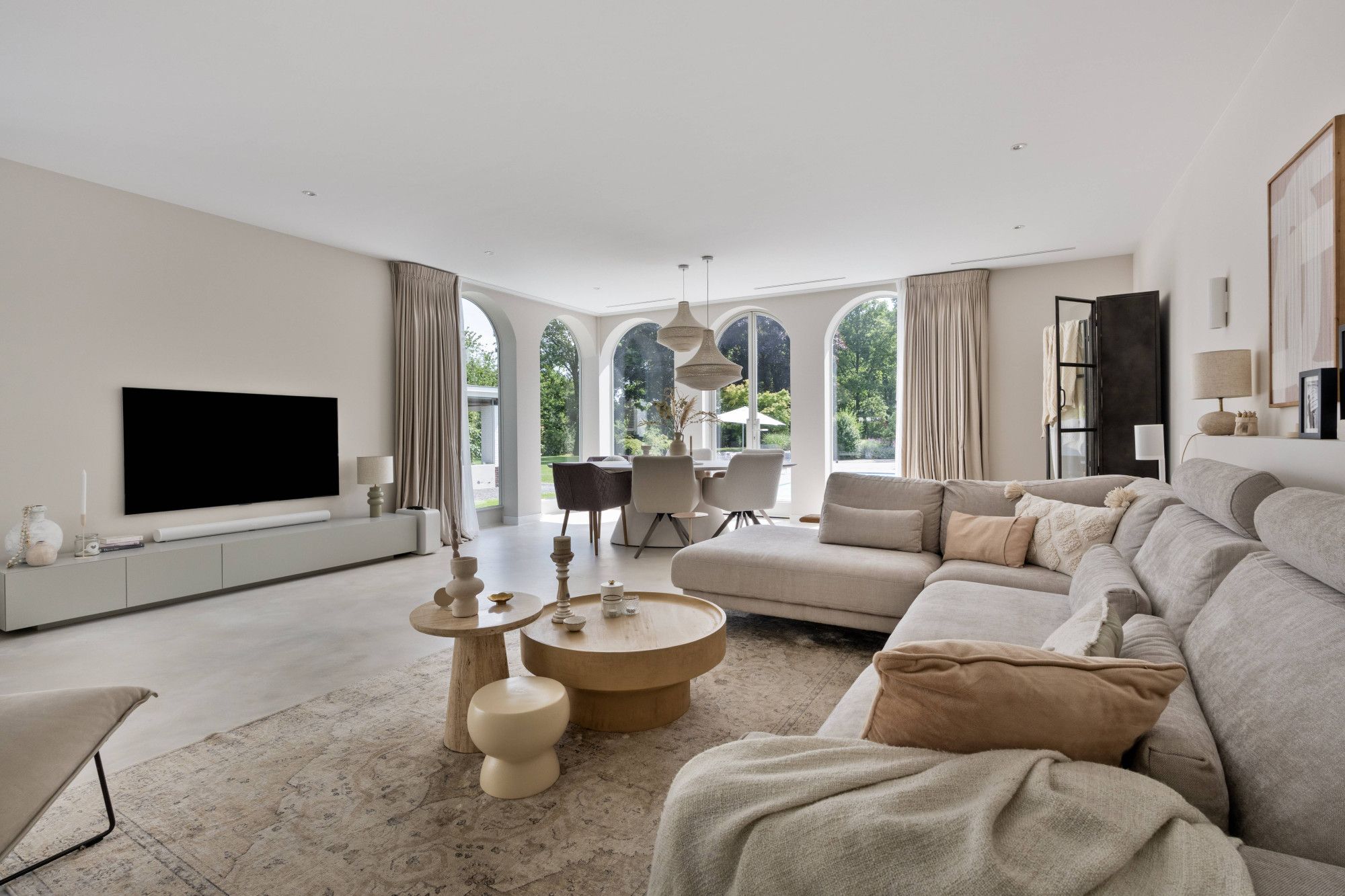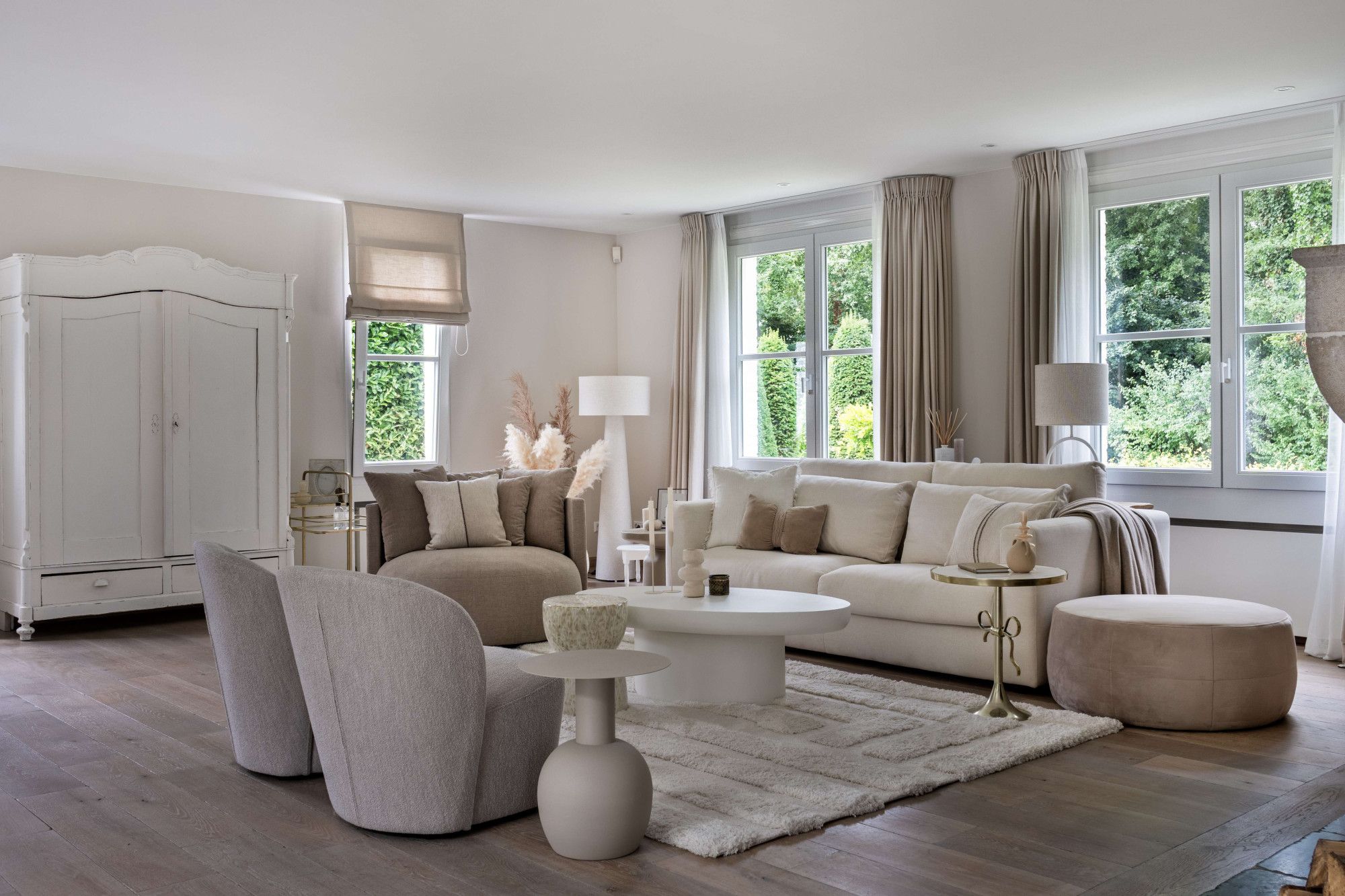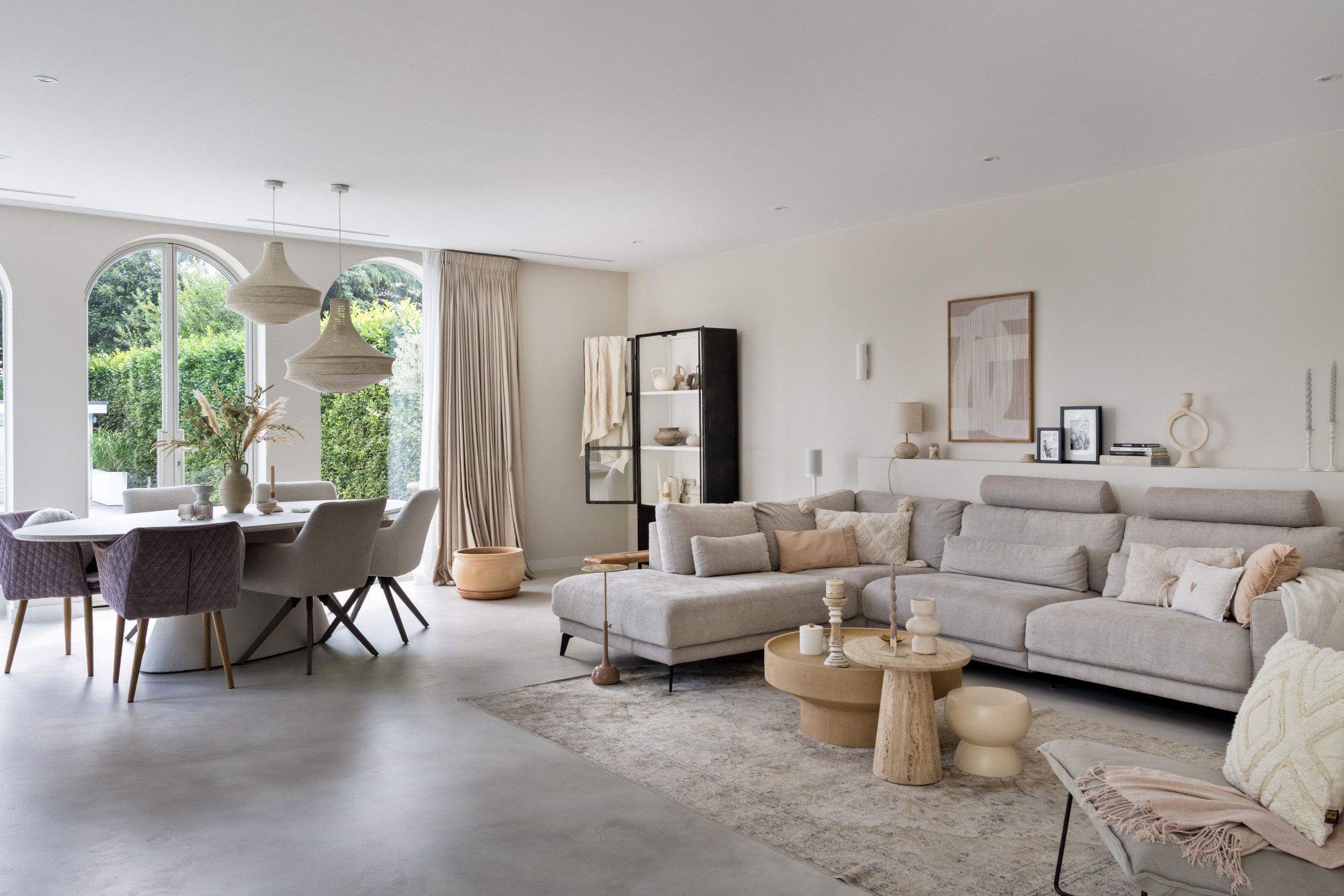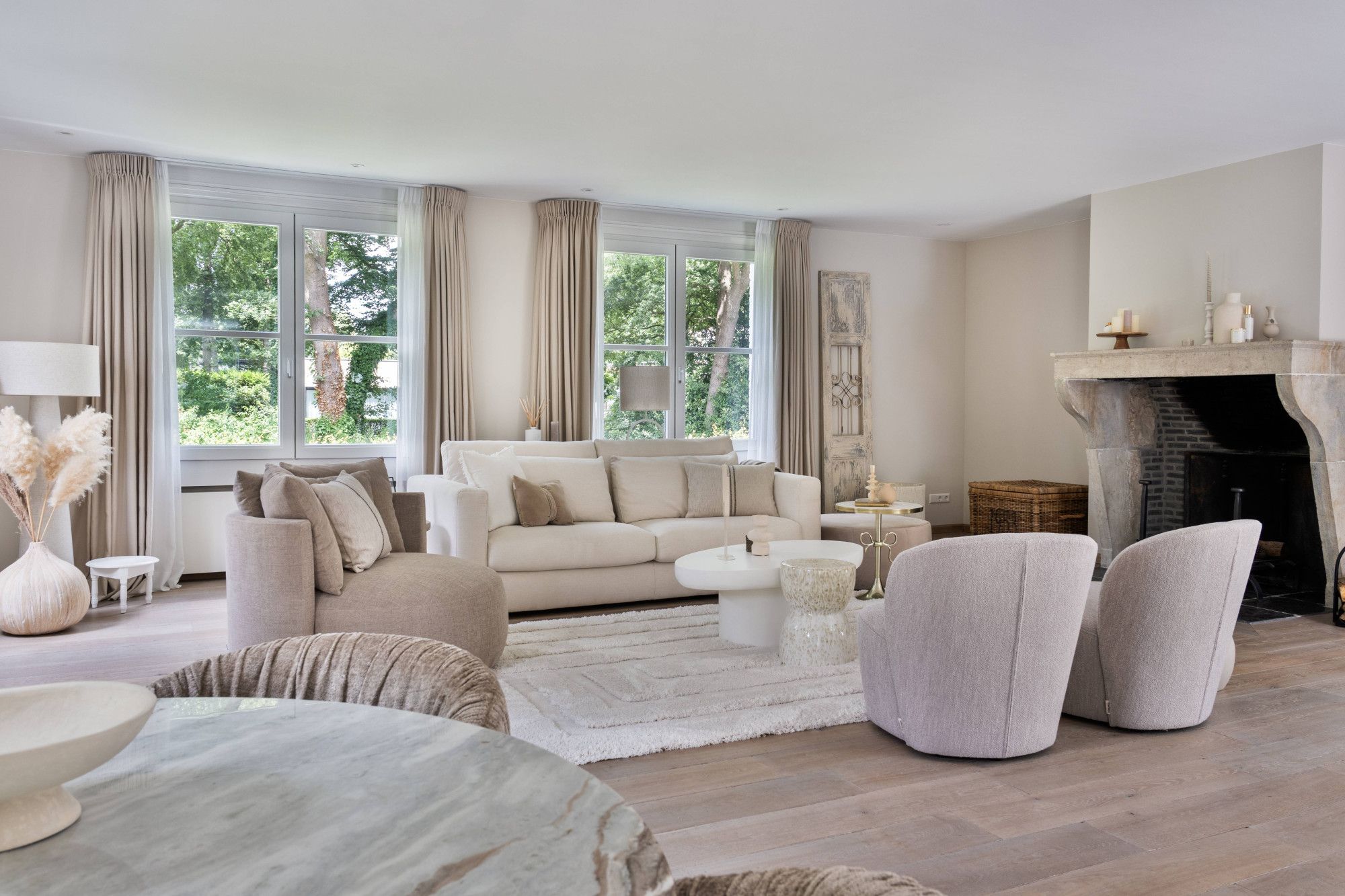 Aansluitend bevindt zich een tweede living, gerealiseerd in een onder architectuur ontworpen aanbouw. Deze ruimte ademt licht en ruimte en versterkt het gevoel van luxe en ontspanning. Het interieur is een harmonieus samenspel van hout, velours, bouclé en natuursteen dat zorgt voor een uitnodigende sfeer waarin comfort en elegantie hand in hand gaan.
