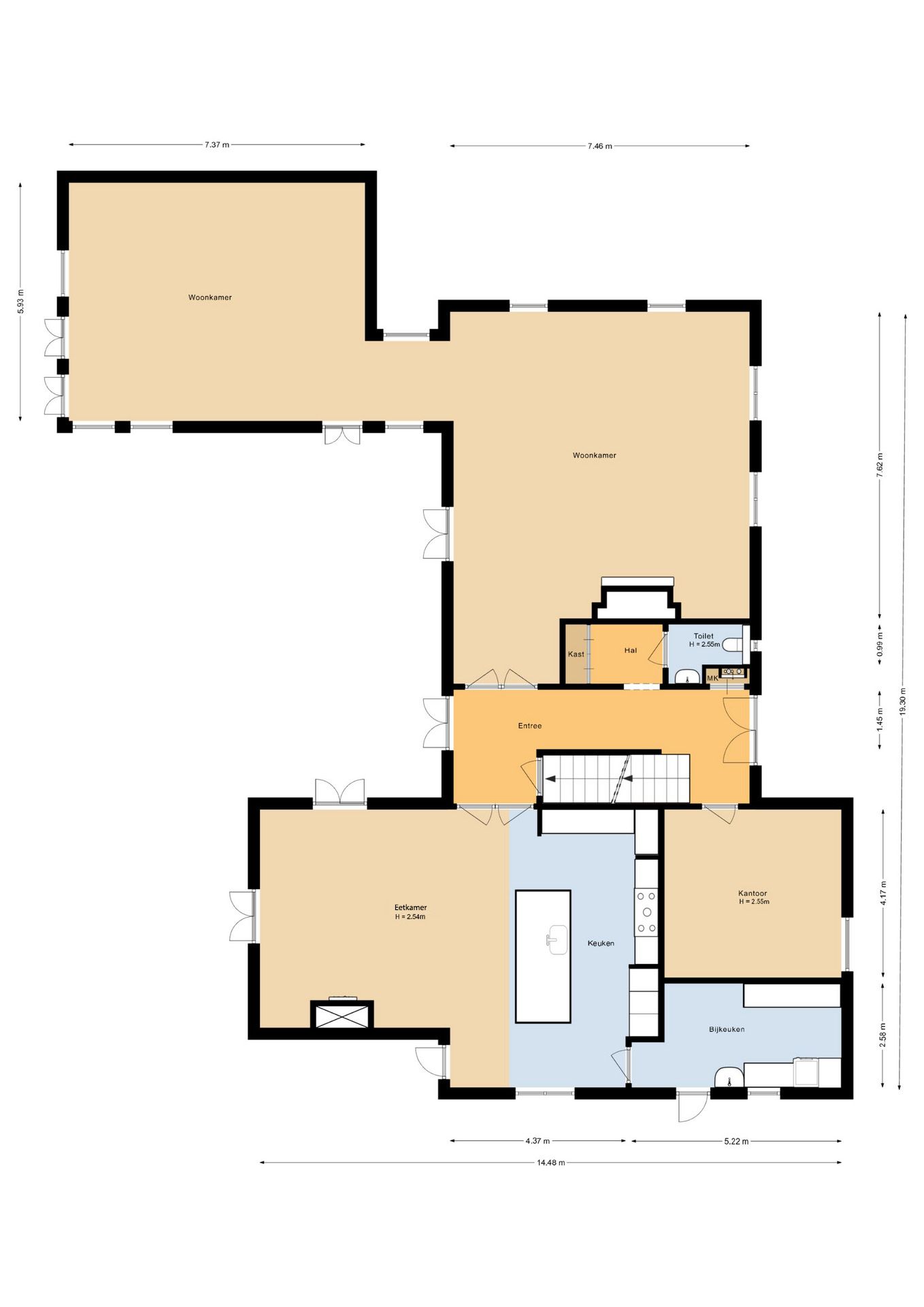 De begane grond is ontworpen als een vloeiend geheel waarin functionaliteit en verfijnd wooncomfort elkaar versterken. Direct vanuit de hal zijn de multifunctionele kantoorruimte, de garderobe en het stijlvolle toilet bereikbaar: praktisch ingedeeld, zonder concessies te doen aan esthetiek.