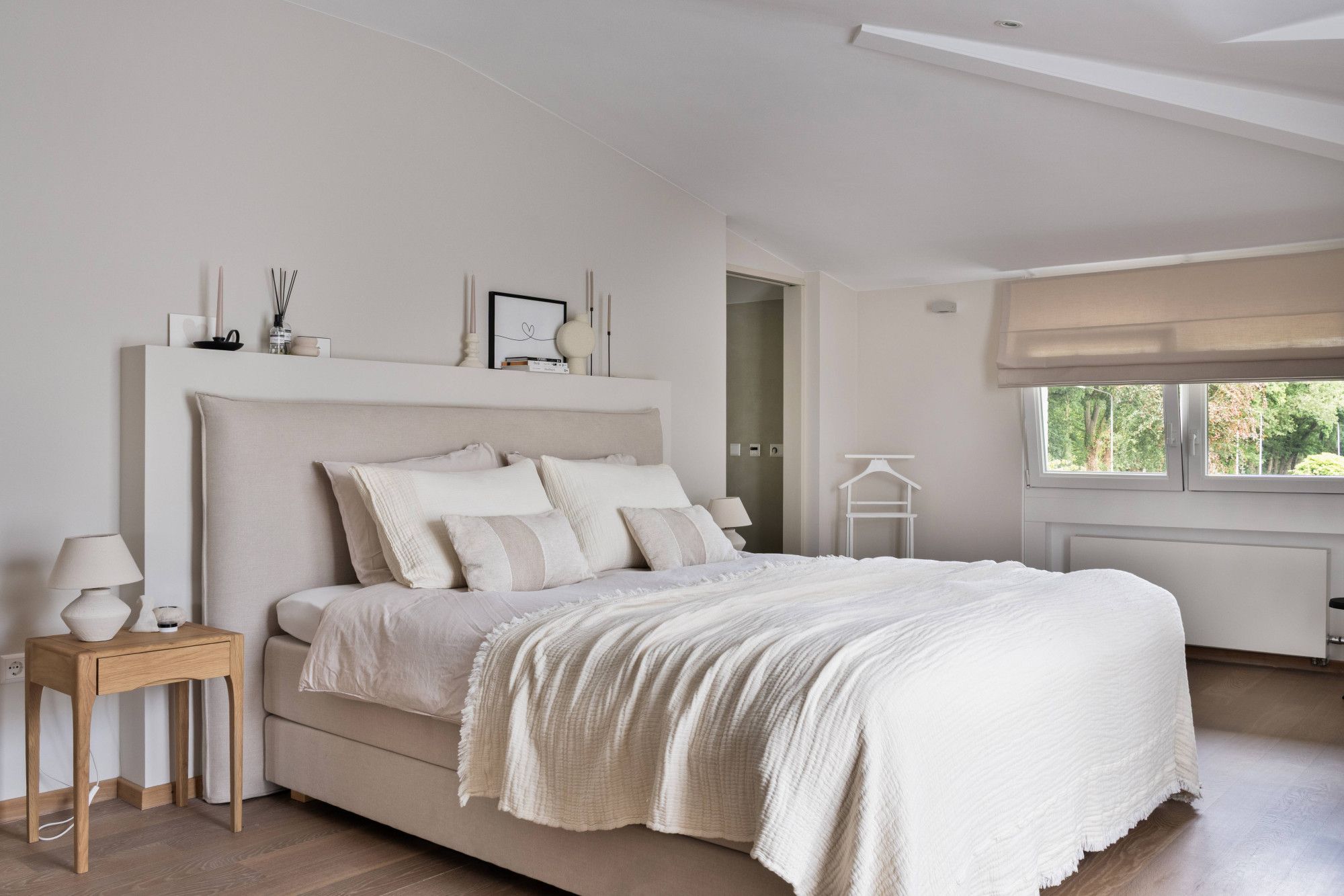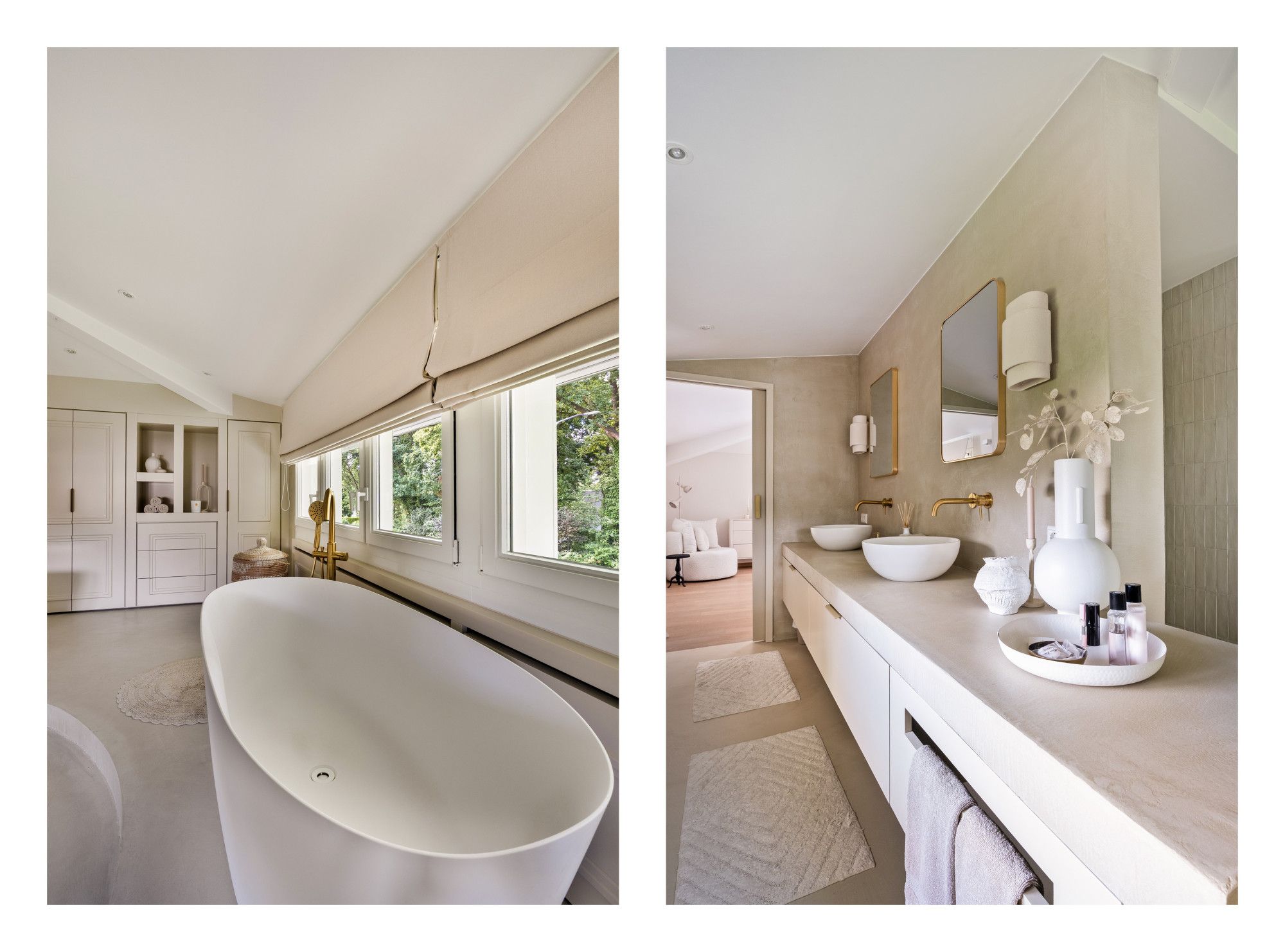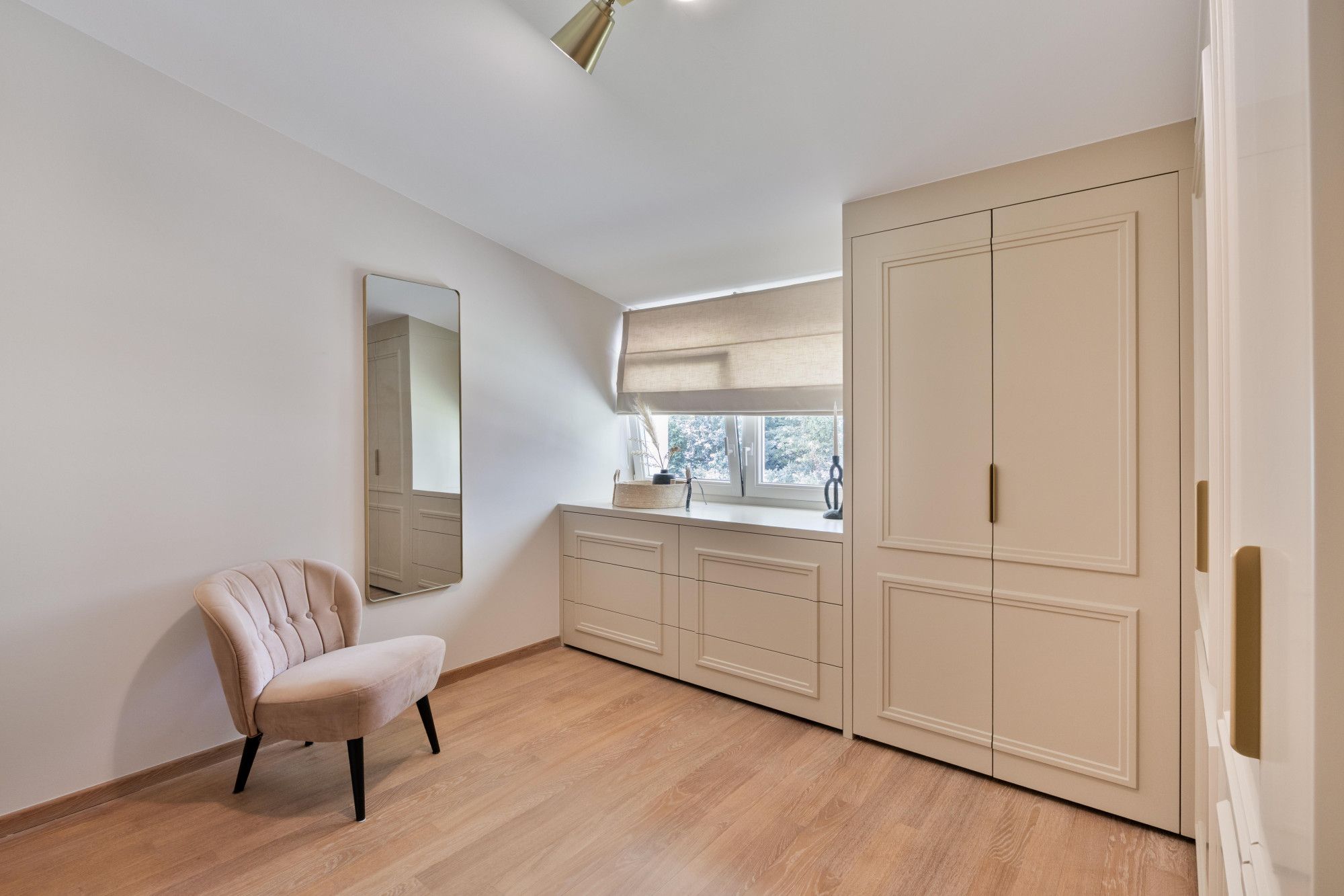 Op de verdieping zet een zorgvuldig samengestelde mix van goud en beige eveneens de toon: goud voor glamour en warmte, beige voor zachtheid en sereniteit. Zoals het gezegde luidt: “De beste kleur in de hele wereld is de kleur die je goed staat.” Hier is dat voelbaar in elke nuance. De vrouw des huizes koos in nauwe samenwerking met de interieurarchitect de kleuren, materialen en accessoires, waardoor elke ruimte een persoonlijk en harmonieus geheel vormt.