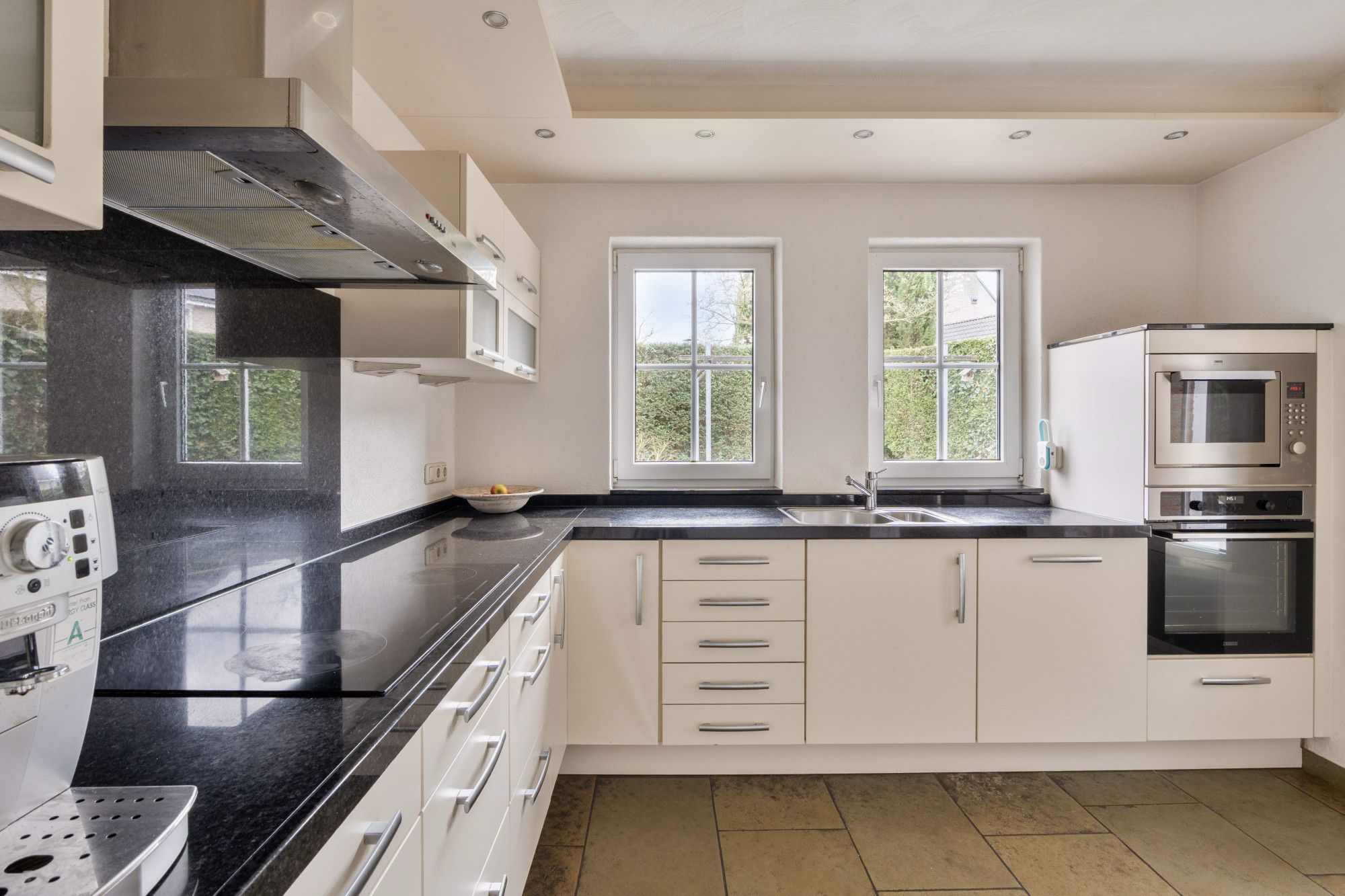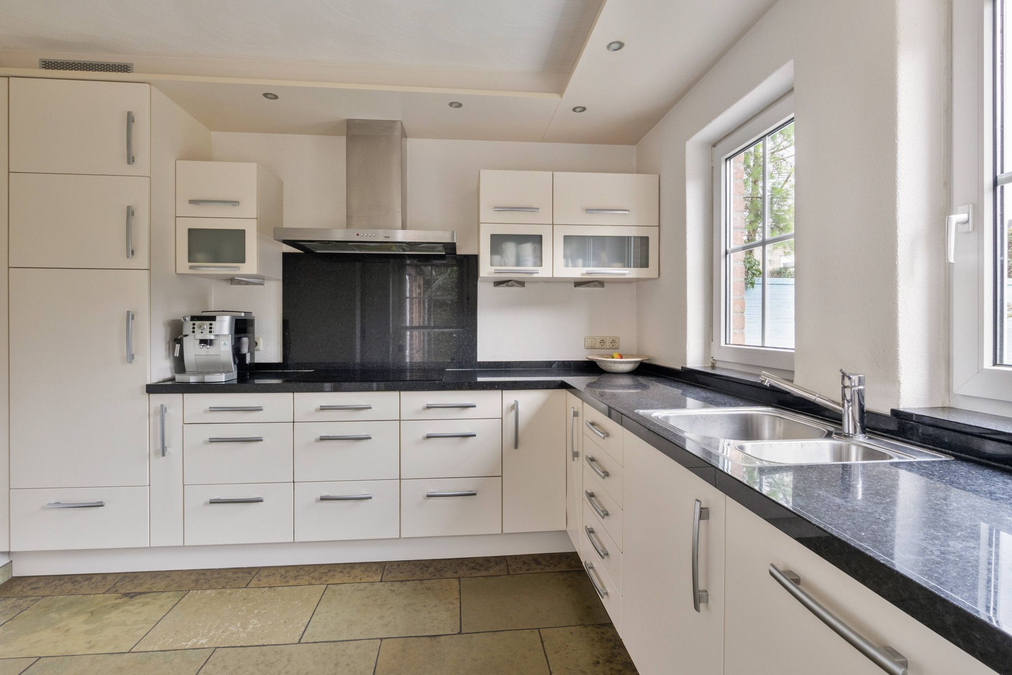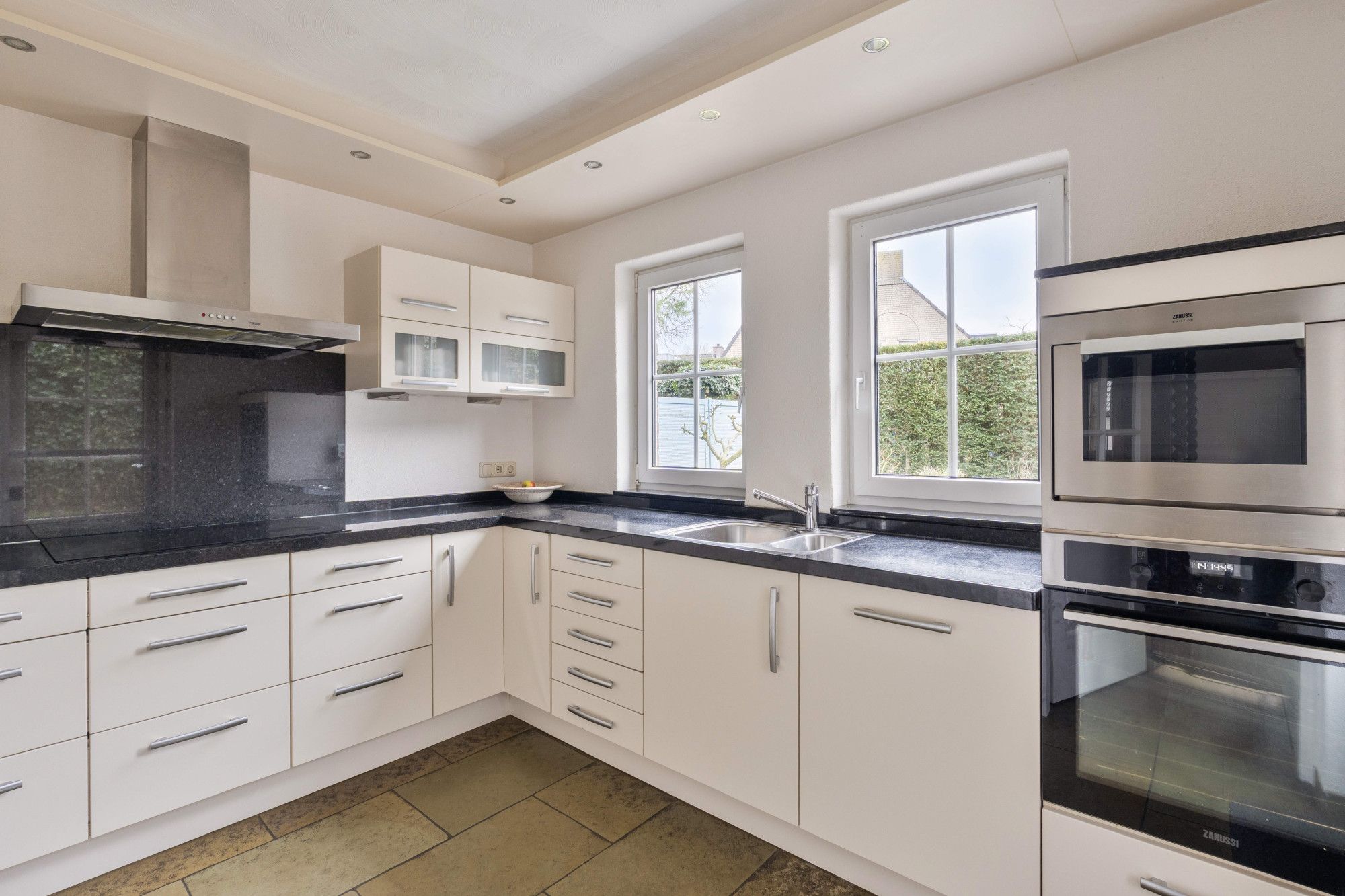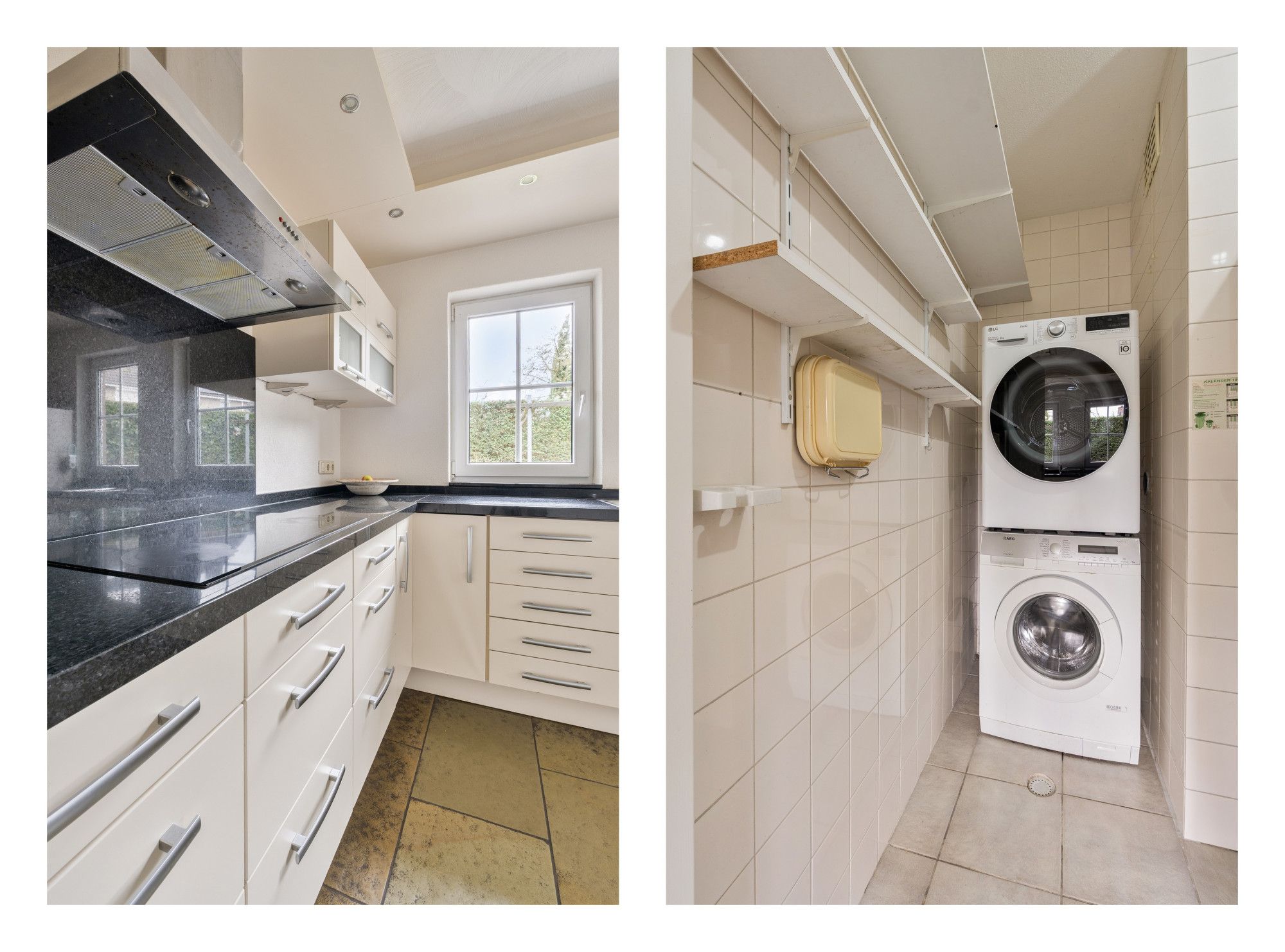 De aangrenzende keuken van ca. 9 m² is van alle gemakken voorzien: een afzuigkap, bak-/(stoom)oven, combi-magnetron, inductiekookplaat, vaatwasser en koelkast. Boven de keuken bevindt zich een praktische vliering, ideaal voor extra opslagruimte, bereikbaar via een vlizotrap. Vanuit de keuken is er toegang tot de ruime achtertuin met vrije achterom. Ook is er via de keuken toegang tot een bijkeuken met aansluitingen voor het witgoed. Deze bijkeuken biedt tevens toegang tot de garage van ca. 18 m².