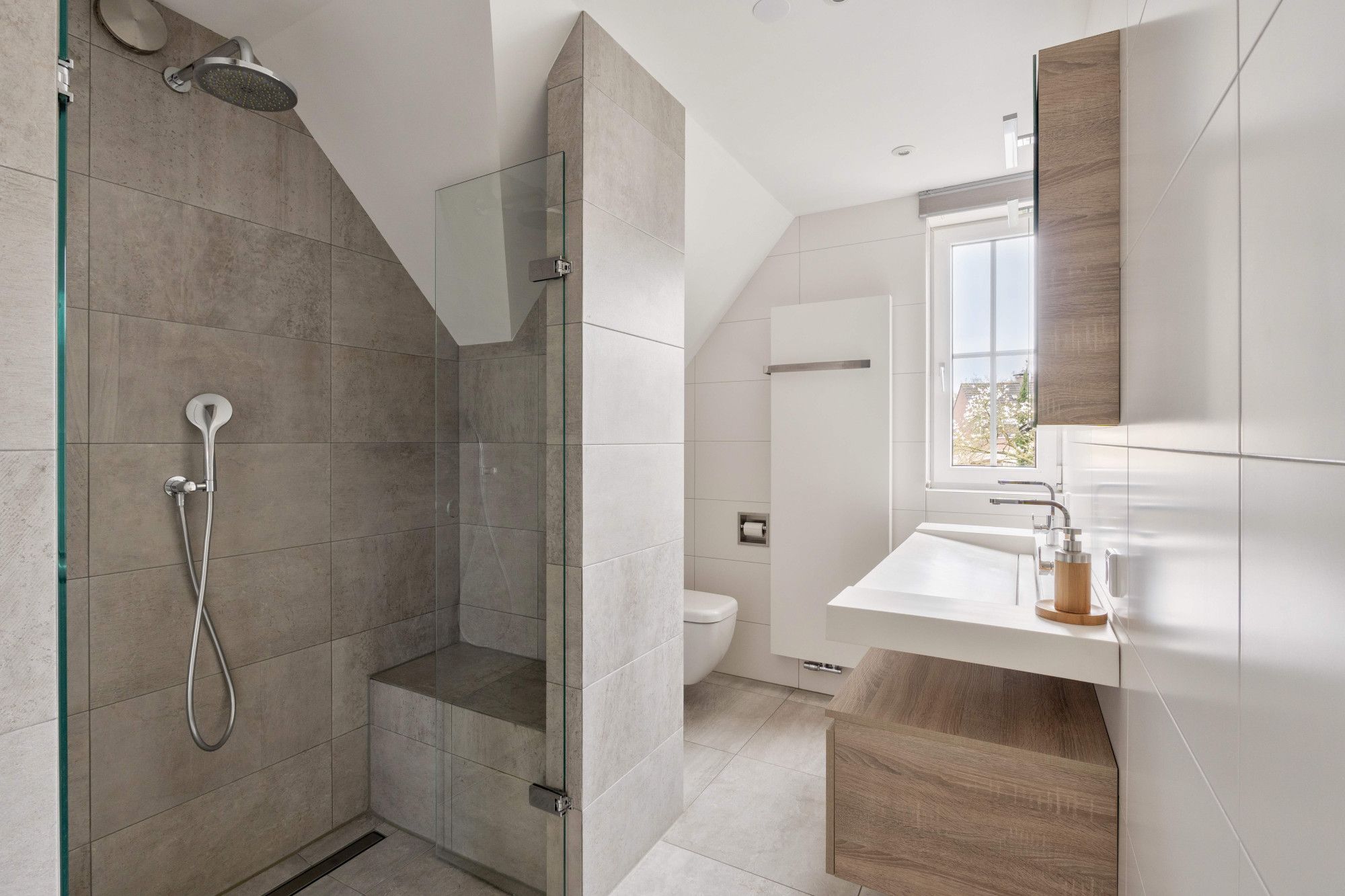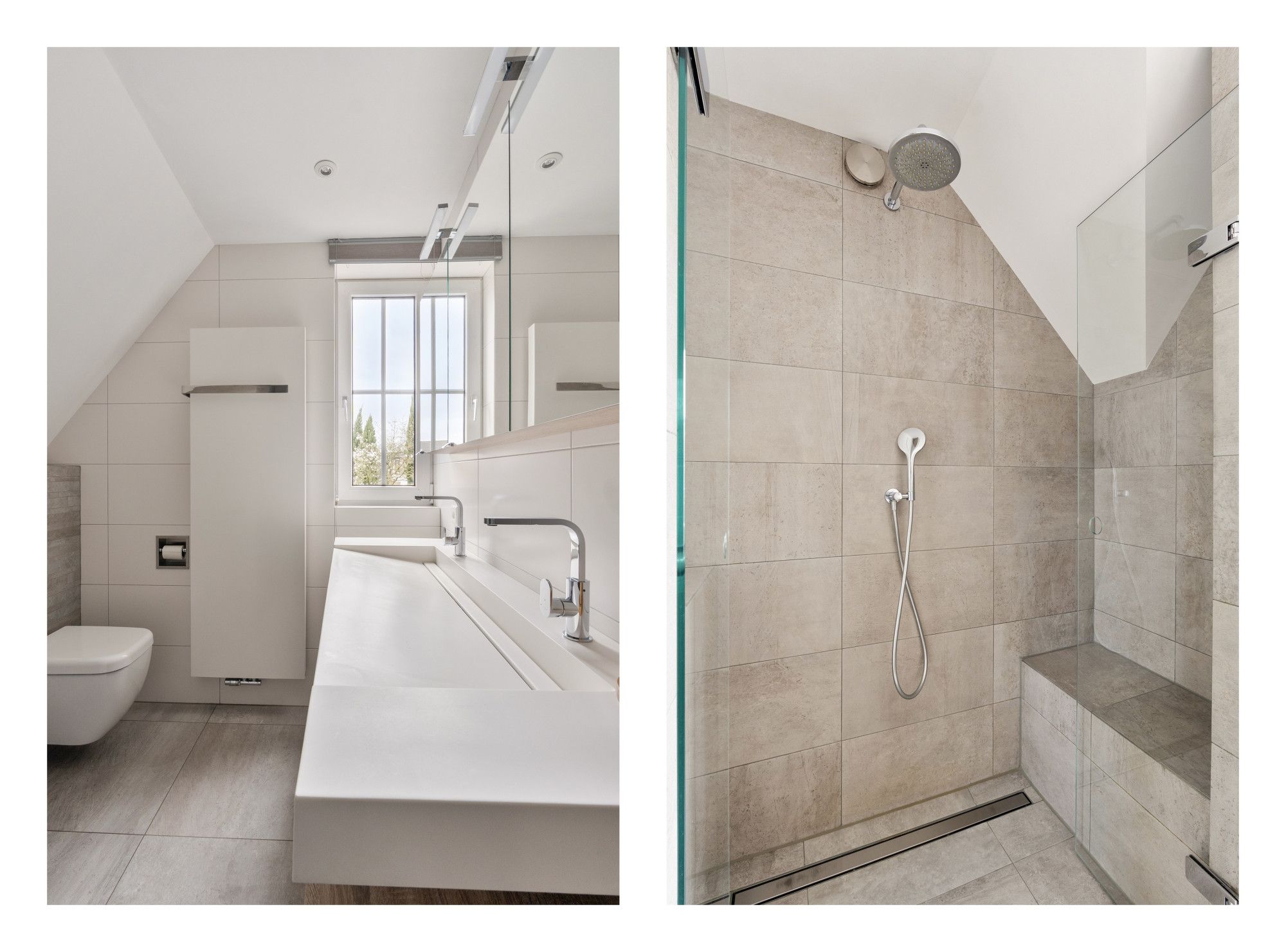 Op de eerste verdieping bevinden zich vijf (slaap)kamers van ca. 9 , 9, 9, 13 & 21 m². De moderne badkamer van ca. 6 m², volledig vernieuwd in 2020, is van alle comfort voorzien: een zeer ruime douche, dubbele wastafel, hangend toilet, een designradiator. en elektrische vloerverwarming.