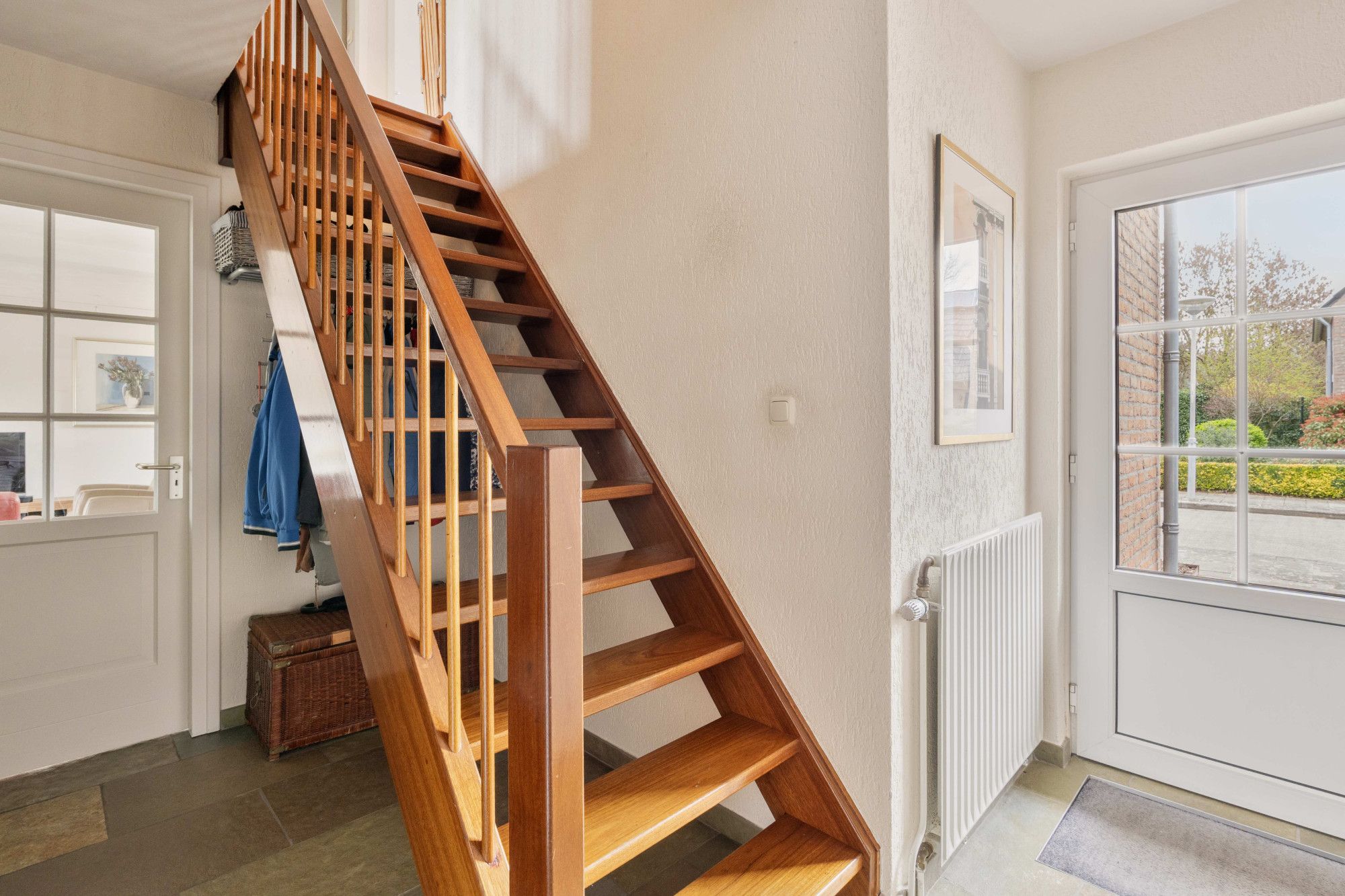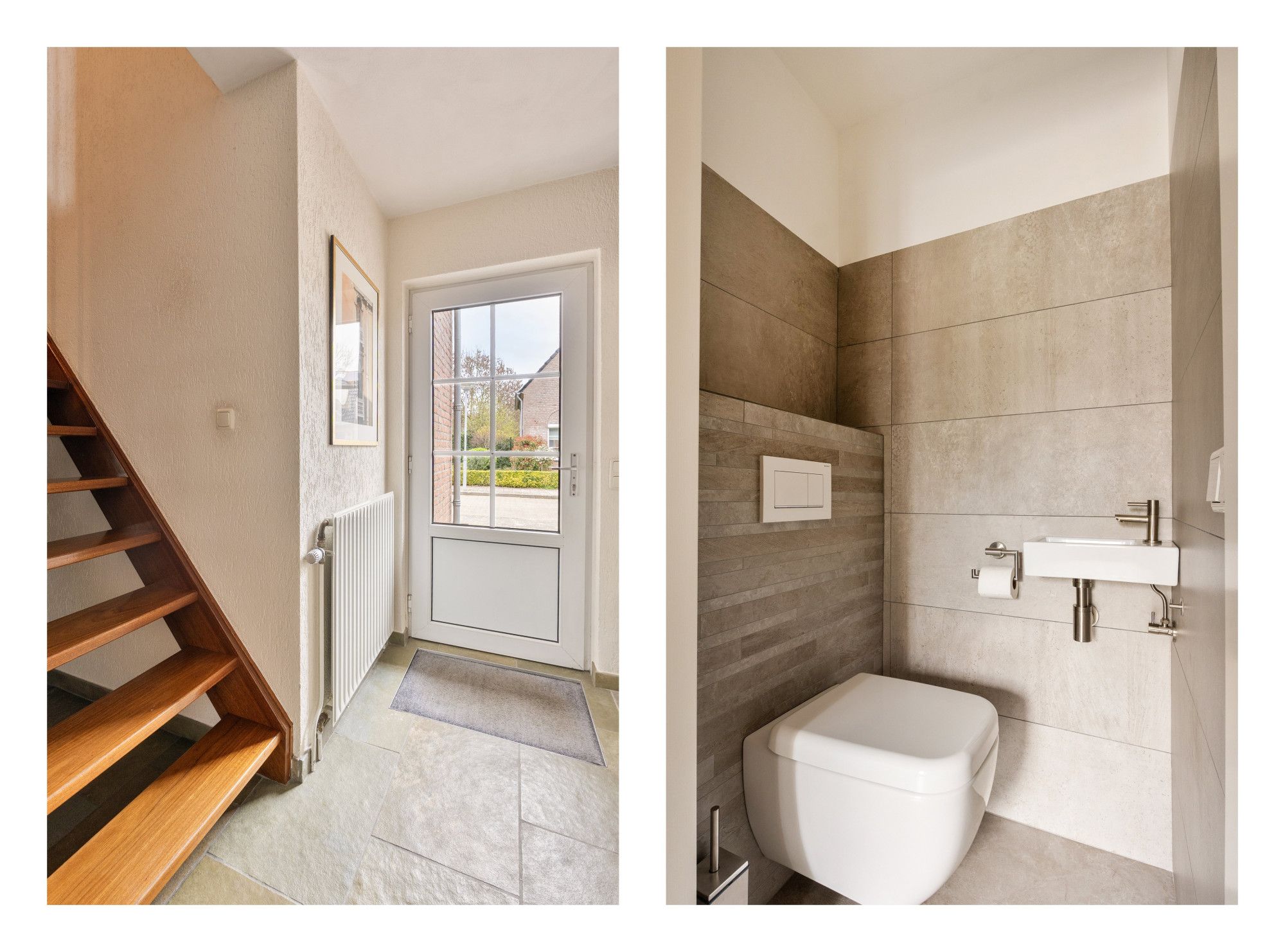 Ruime hal met meterkast, garderobe, en toiletruimte met hangend toilet (vernieuwd in 2020). Trapopgang (hardhouten trap) naar de 1e verdieping, toegang tot de woonkamer en tot de inpandige garage.