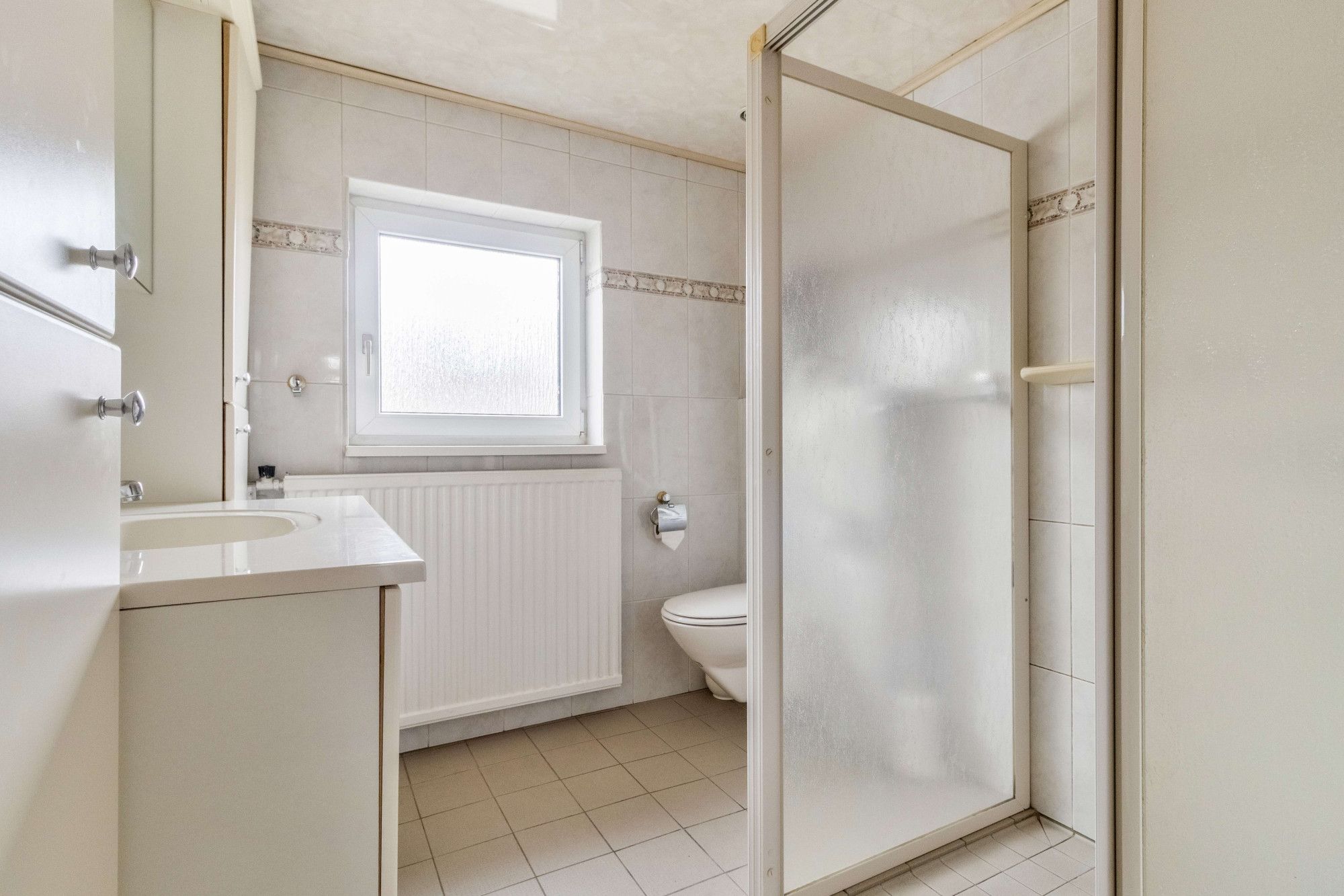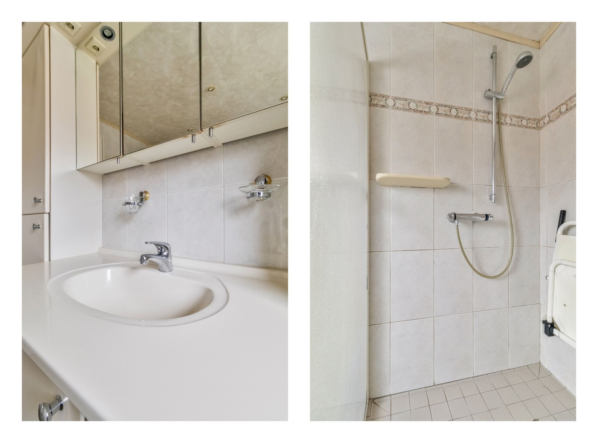 De badkamer (ca. 5m2) is ingericht met een wastafel inclusief meubel, een hangend closet en douchecabine.