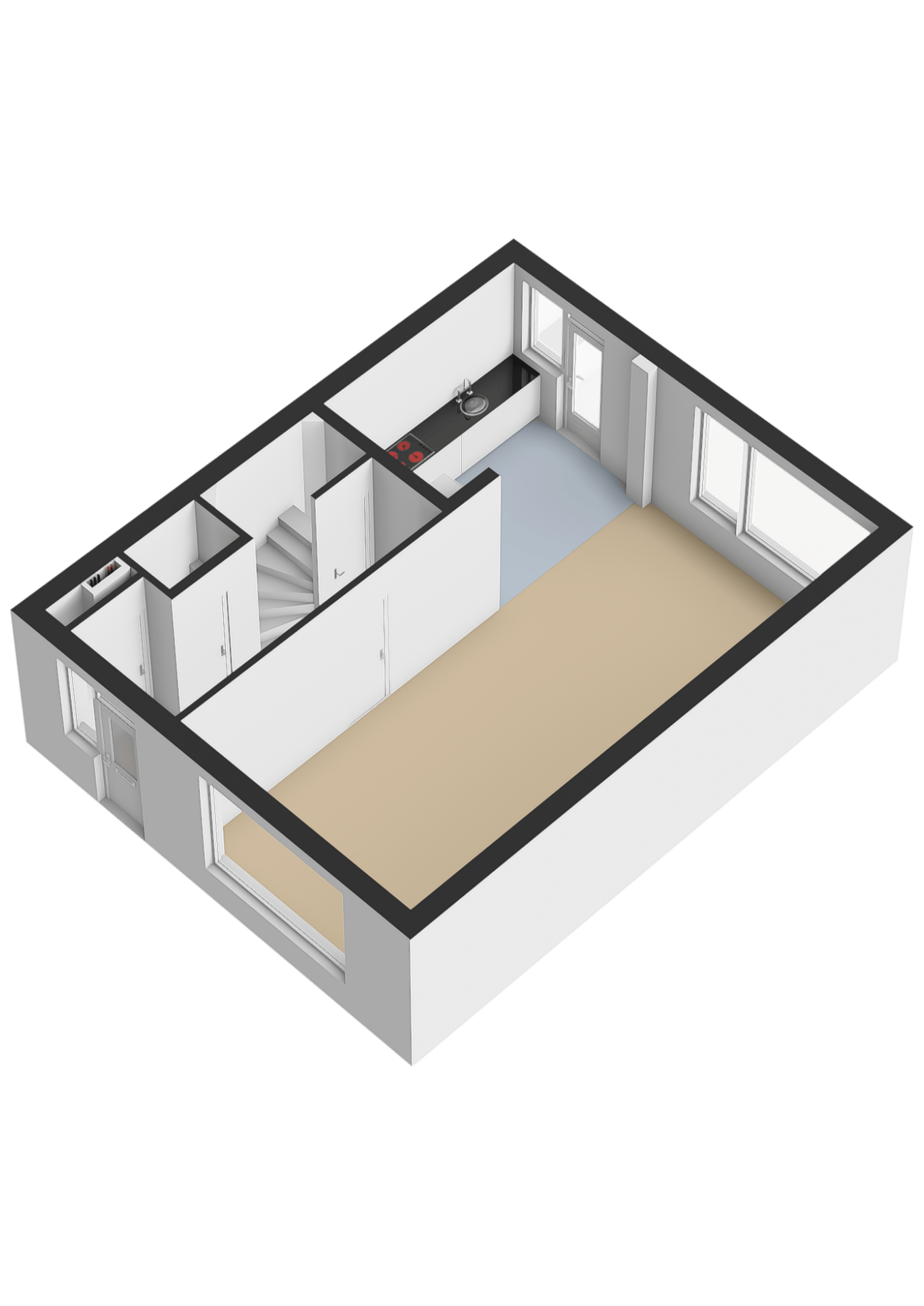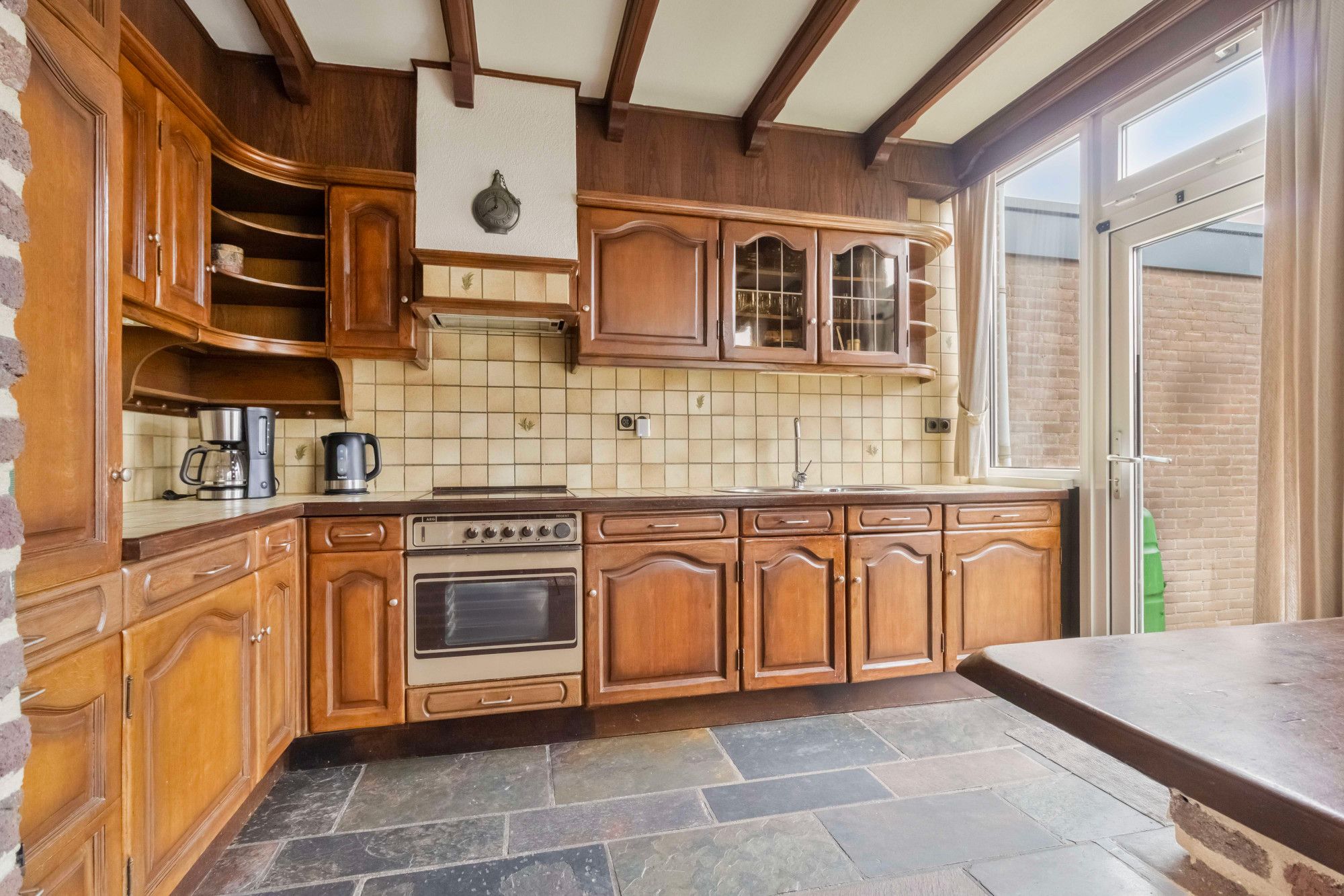 De keuken (ca. 9m2) grenst direct aan de woonkamer en is praktisch ingericht. U vindt hier een 4-pits keramisch kookplaat, oven, koelkast, afzuigkap en een dubbele spoelbak. Het lage barretje zorgt voor een speelse verbinding met de leefruimte.