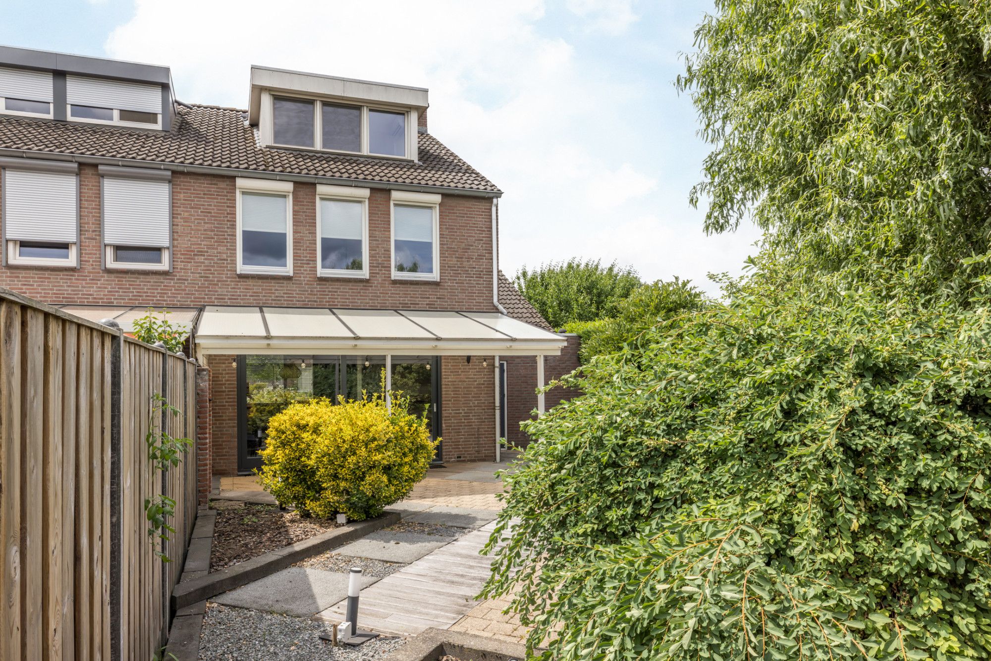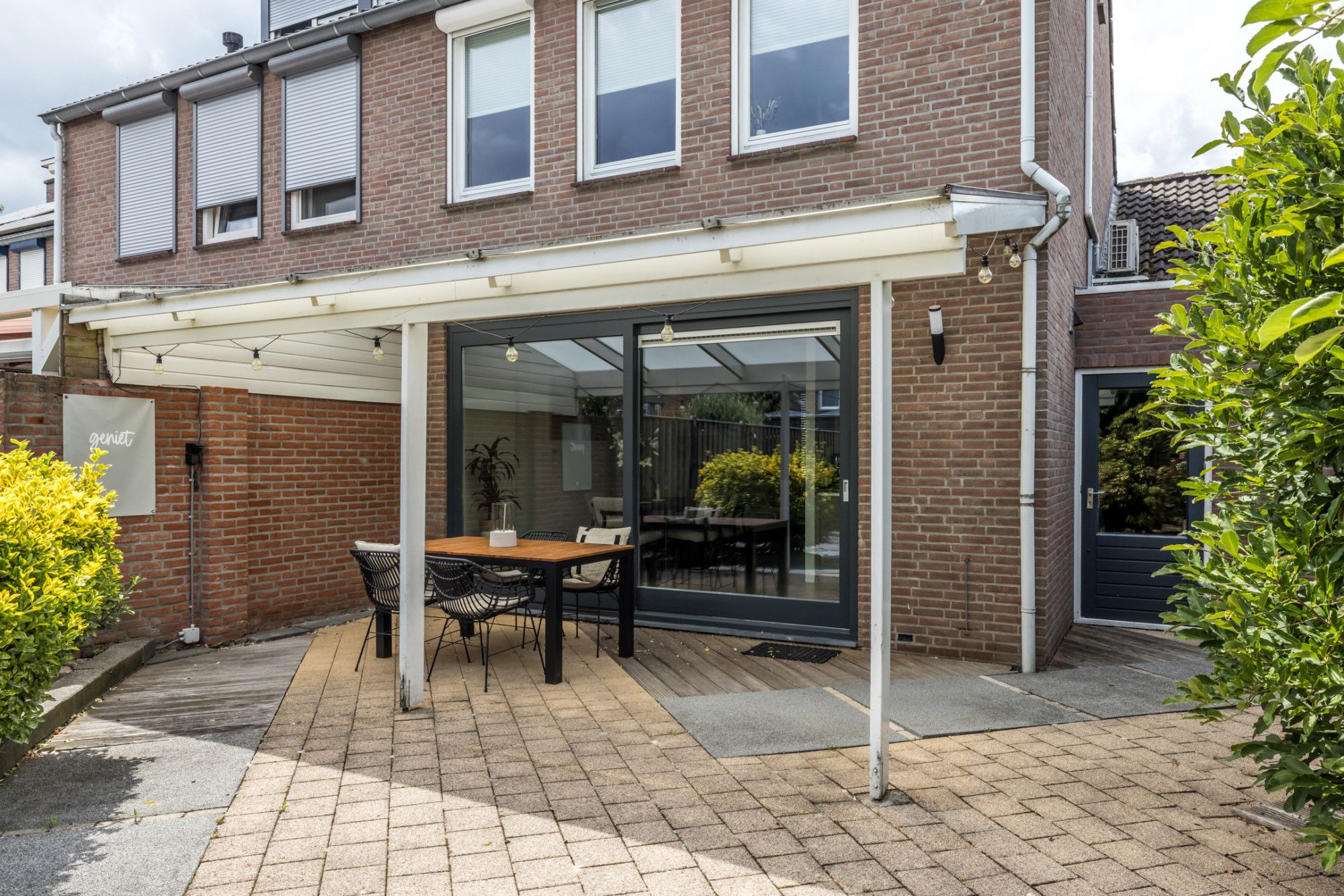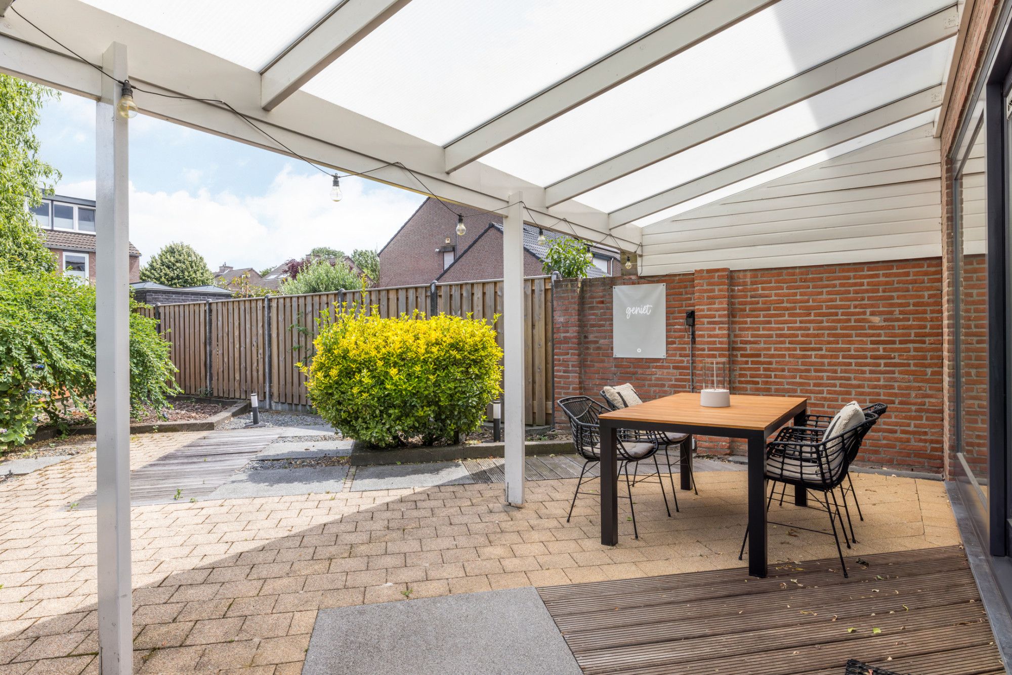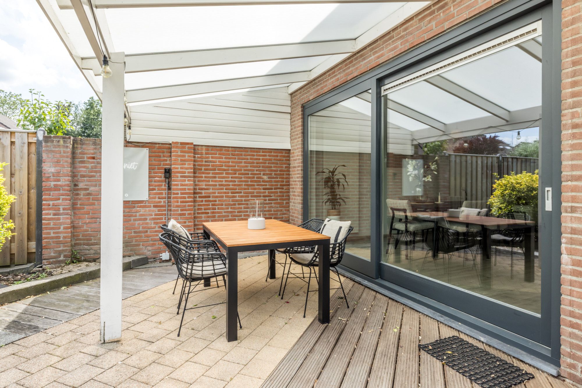 Aan de achterzijde van de woning, op het oosten, vind je een fijn, overdekt terras van ca. 16 m². De plek om te genieten van de eigen tuin, zelfs als het weer wat minder is. De tuin is volledig omsloten en onderhoudsvriendelijk, zodat je vooral kunt ontspannen en genieten van jouw eigen gezellige buitenplek.
