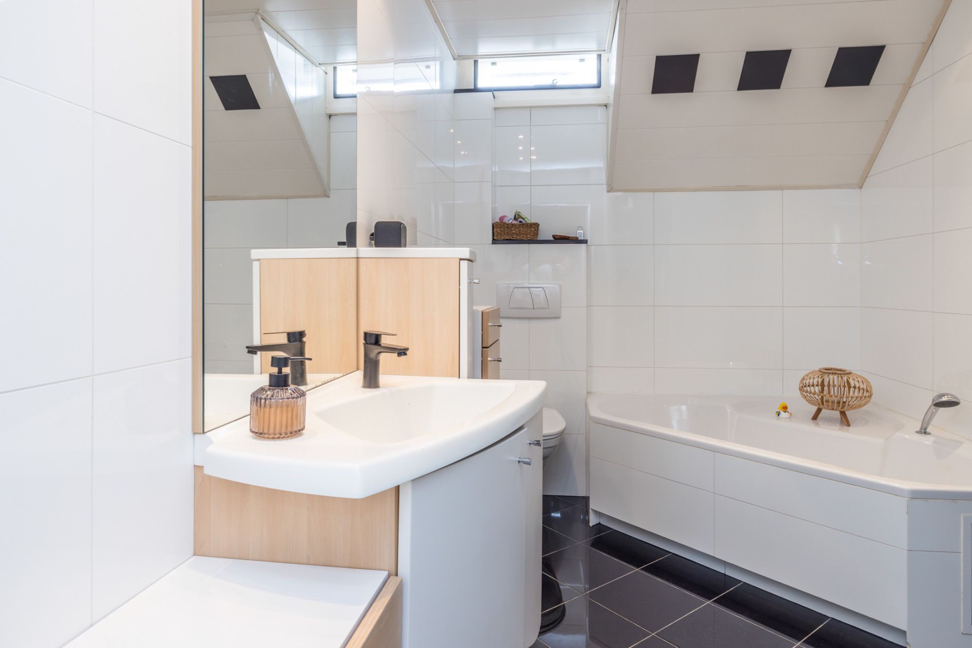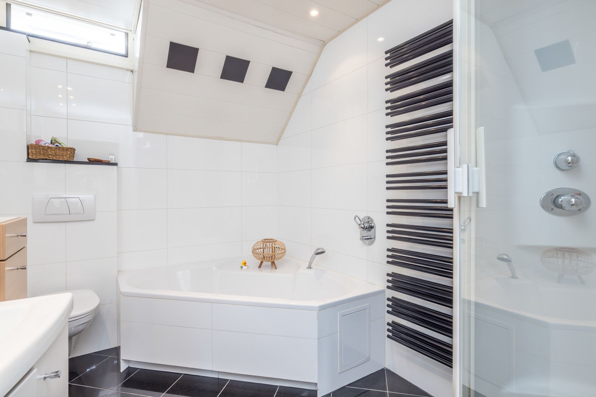 De luxe badkamer (ca. 7 m²) is volledig betegeld en voorzien van een hoekbad, douchecabine, zwevend toilet, handdoek radiator, wastafel met meubel en wandmeubel.
