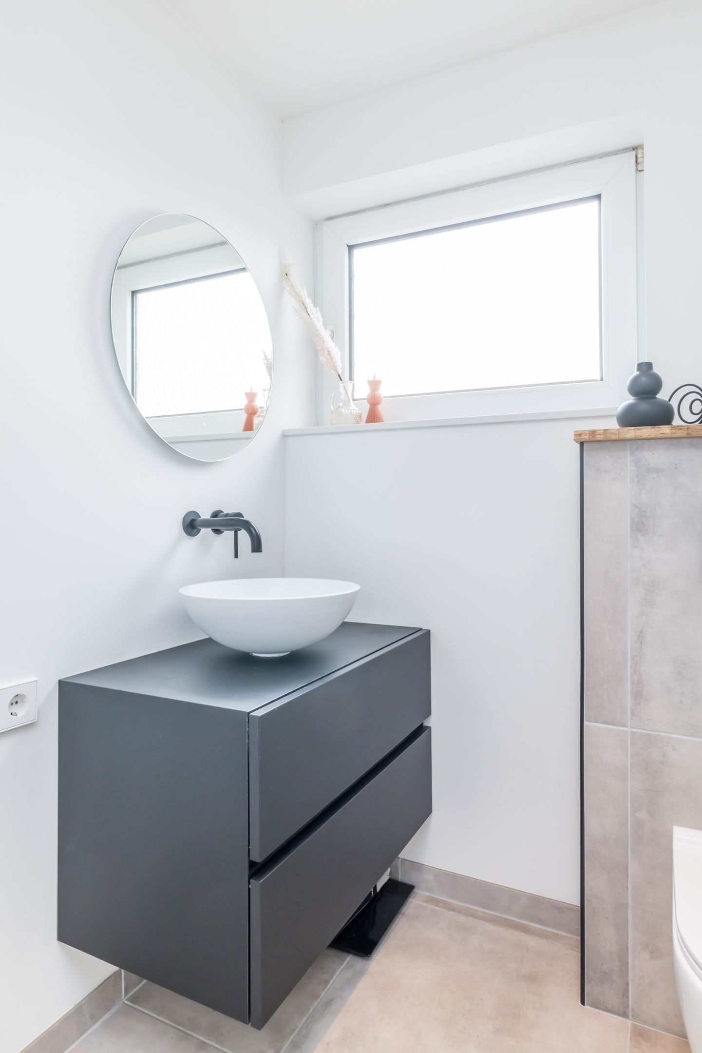 De geheel gemoderniseerde betegelde badkamer uit 2020 is voorzien van een inloopdouche, vaste wastafel met een 2e zwevend toilet.