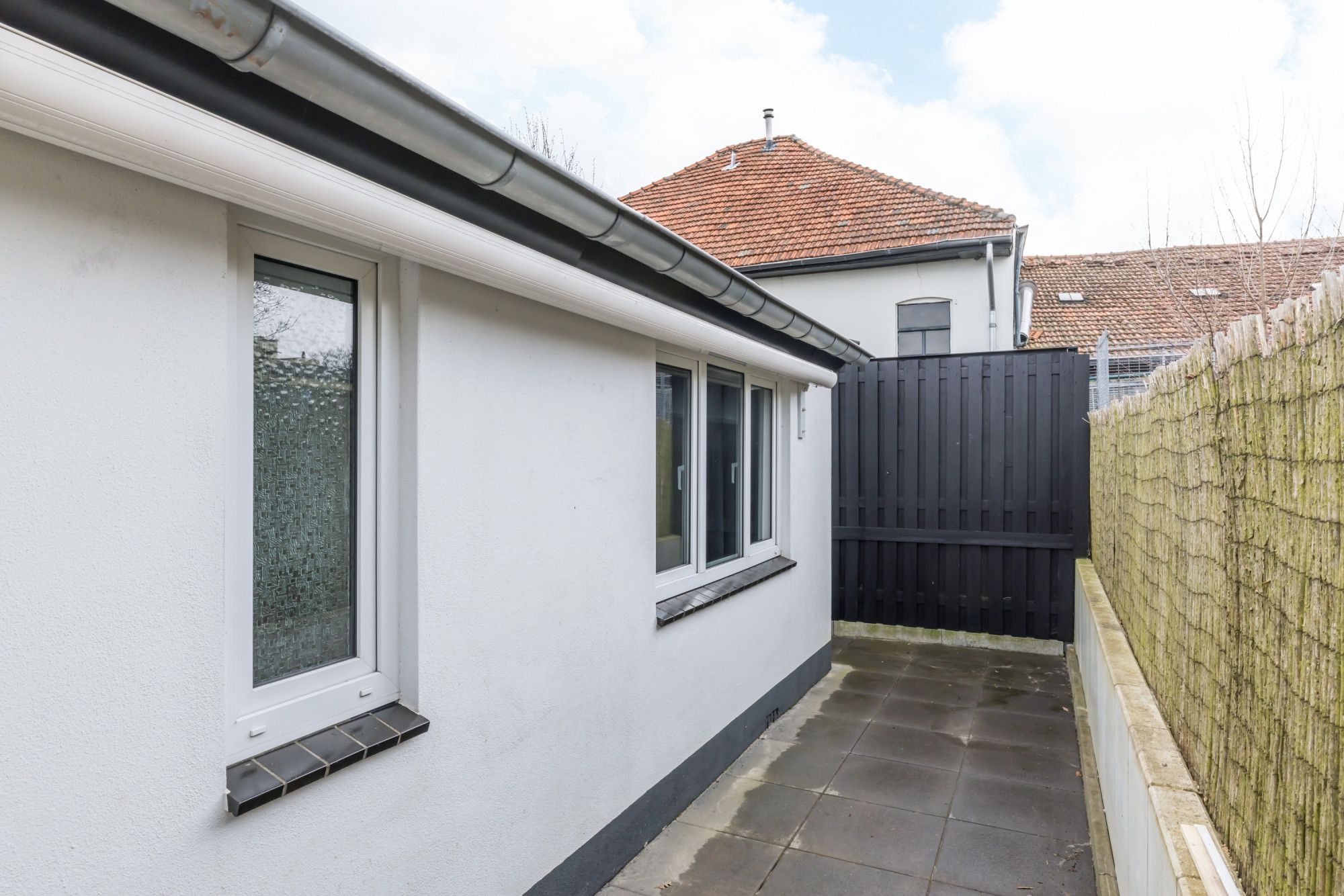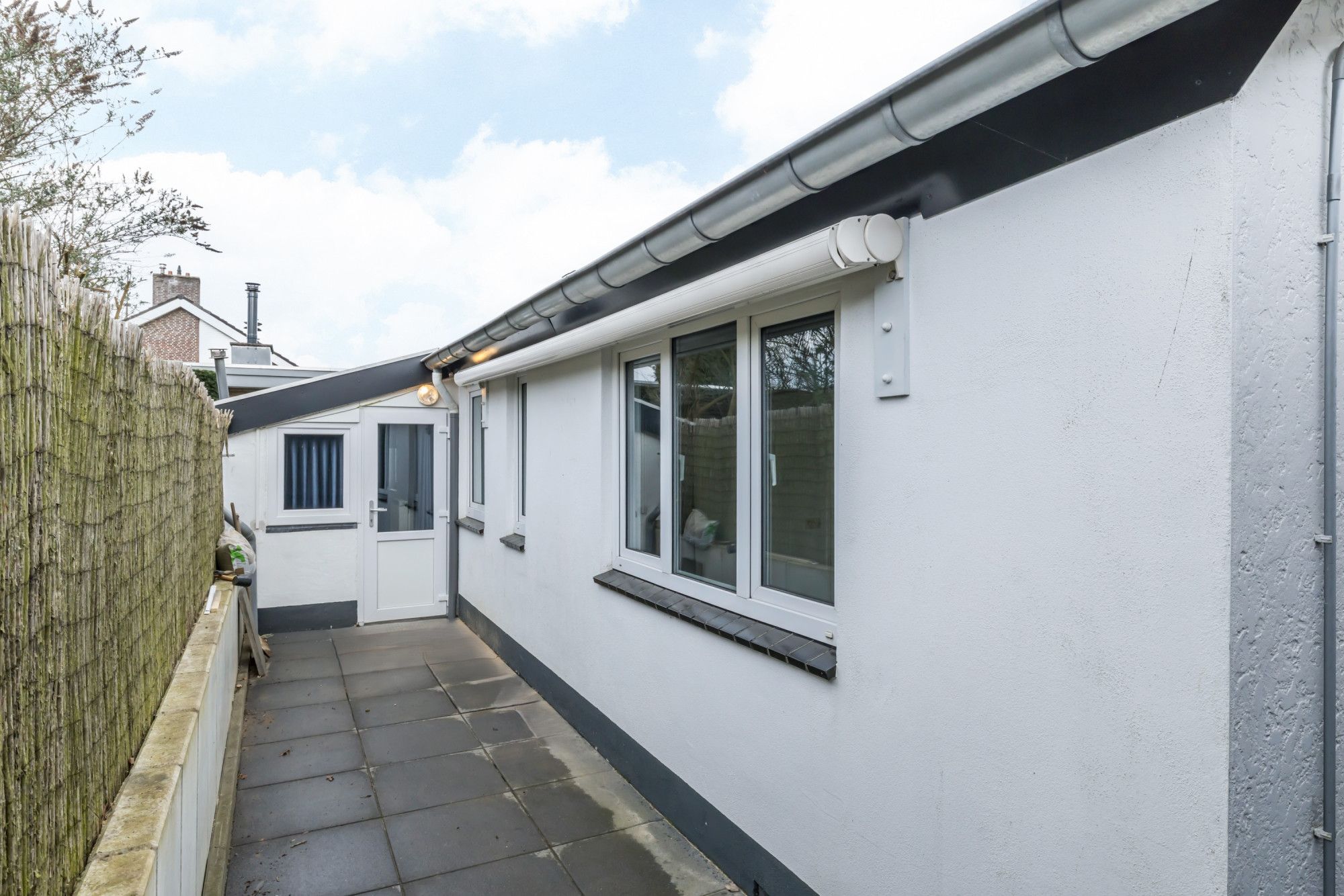 Patiotuin v.v. elektrisch zonnescherm en zij-ingang.