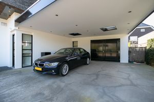 Achter de keuken ligt een praktische bijkeuken, inclusief aansluitingen voor witgoed, met doorgang naar de garage. Deze is voorzien van een extra spoelbak, de vloerverwarmingsinstallatie en cv-ketel. De garage is keurig betegeld, heeft een hardhouten poort en is strak afgewerkt.