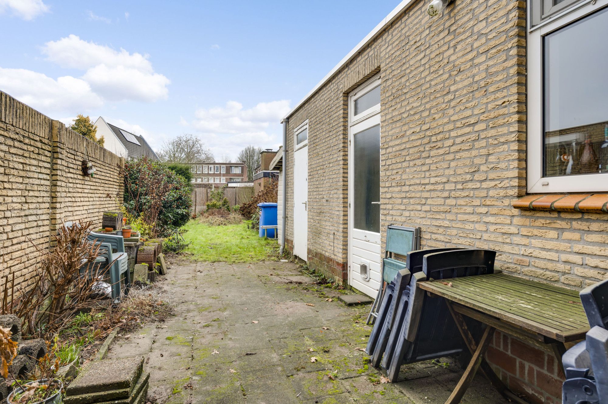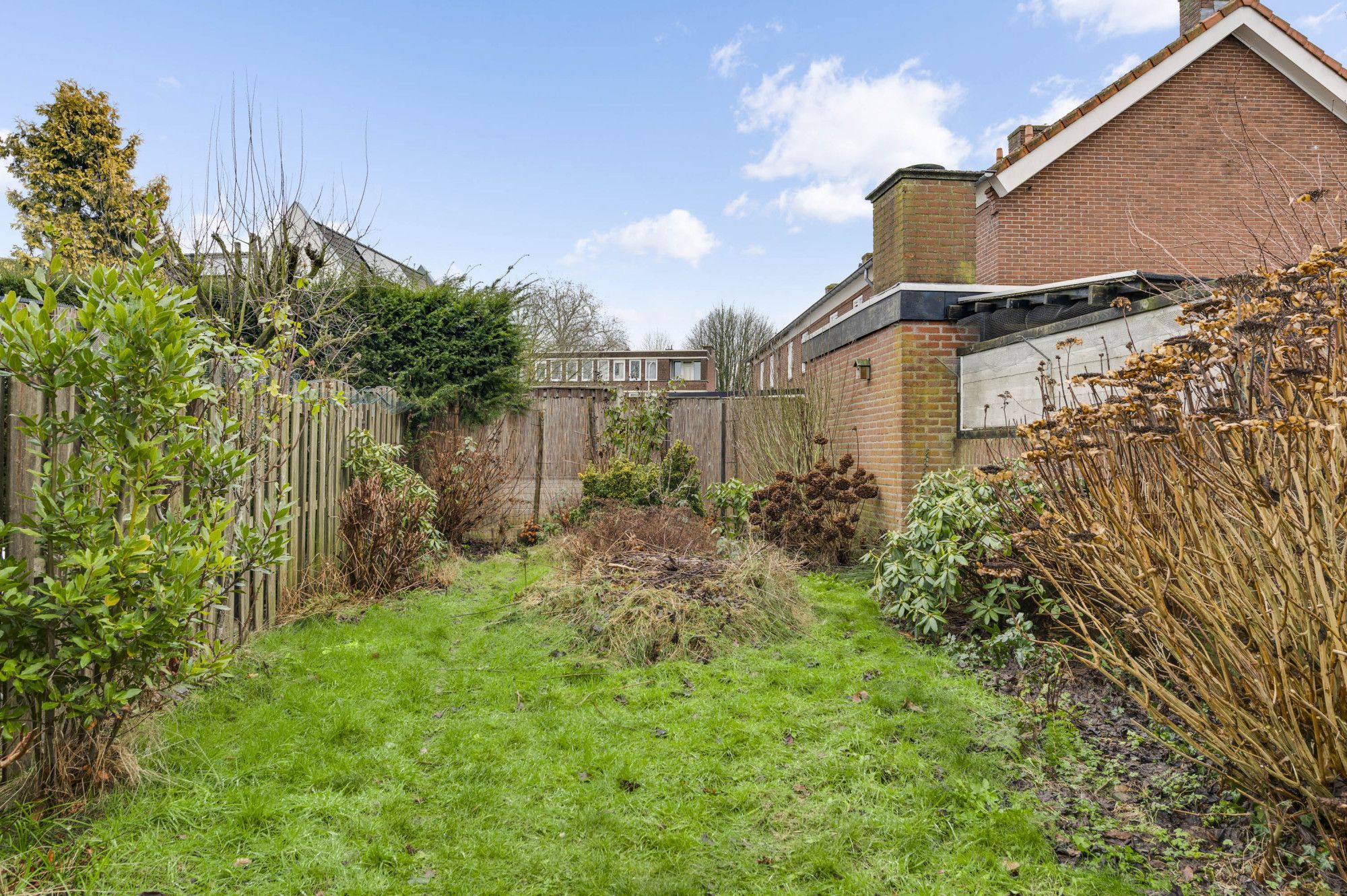 De diepe en zonnige achtertuin op het oosten biedt optimale privacy en is onderhoudsvriendelijk aangelegd met terrassen, gazon en borders. Tevens is er een vrije achterom aanwezig middels een authentieke onderdoorgang.