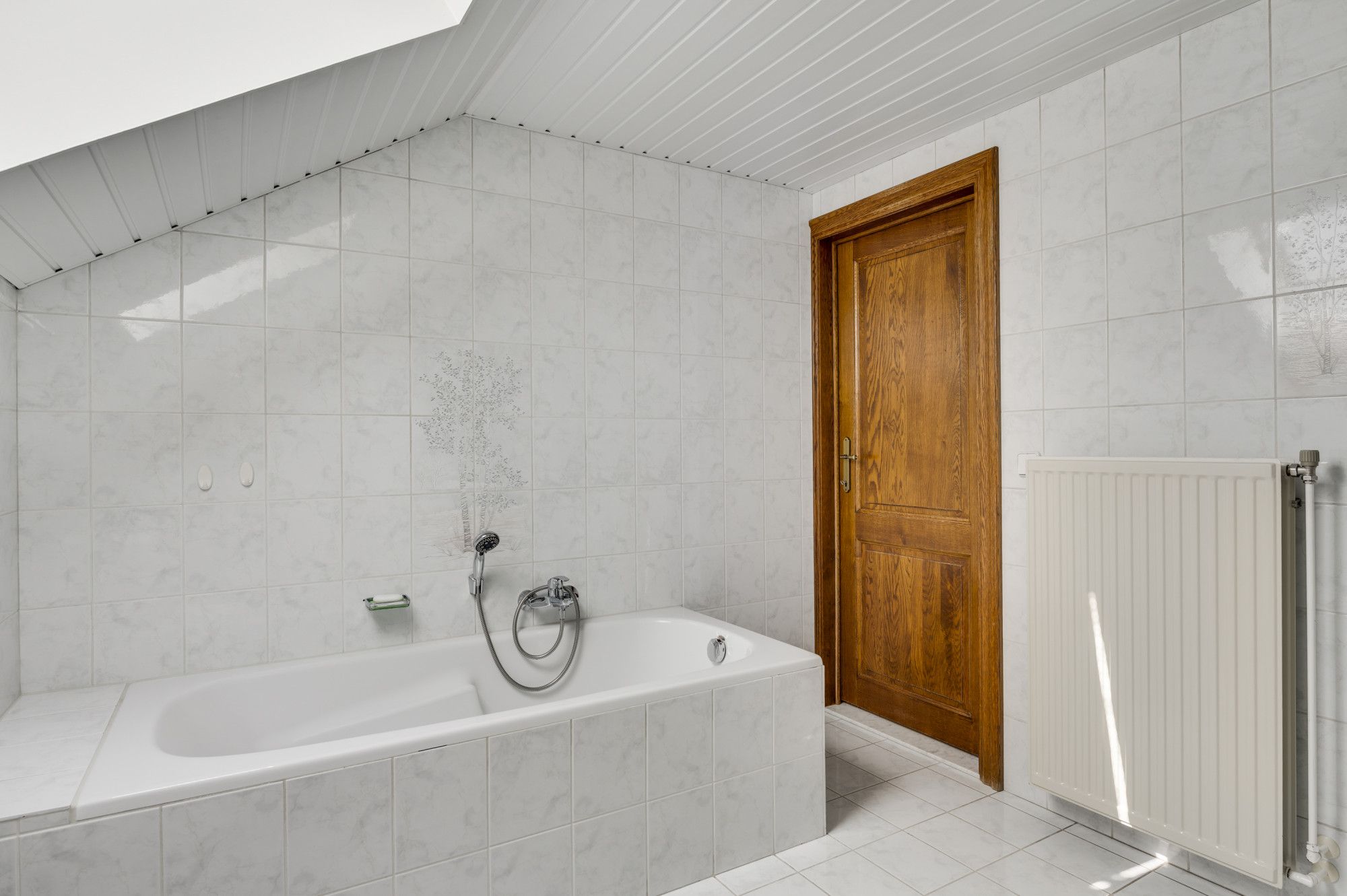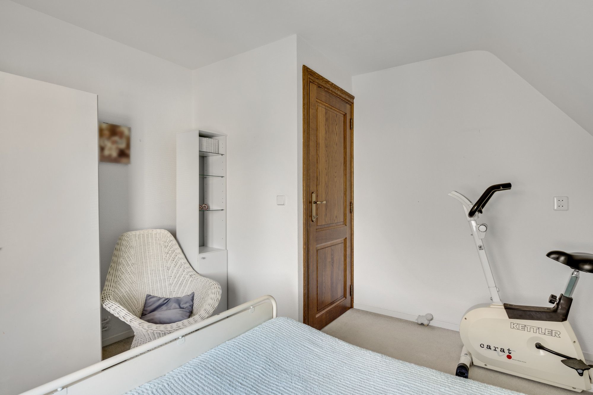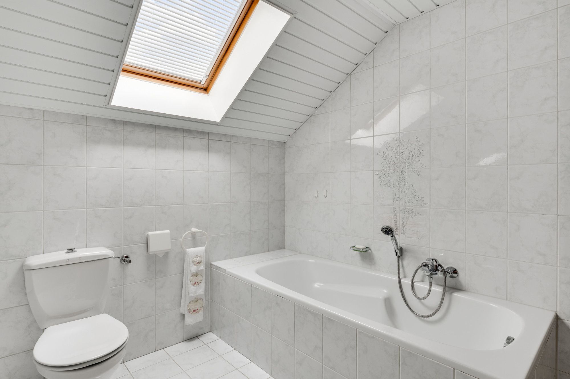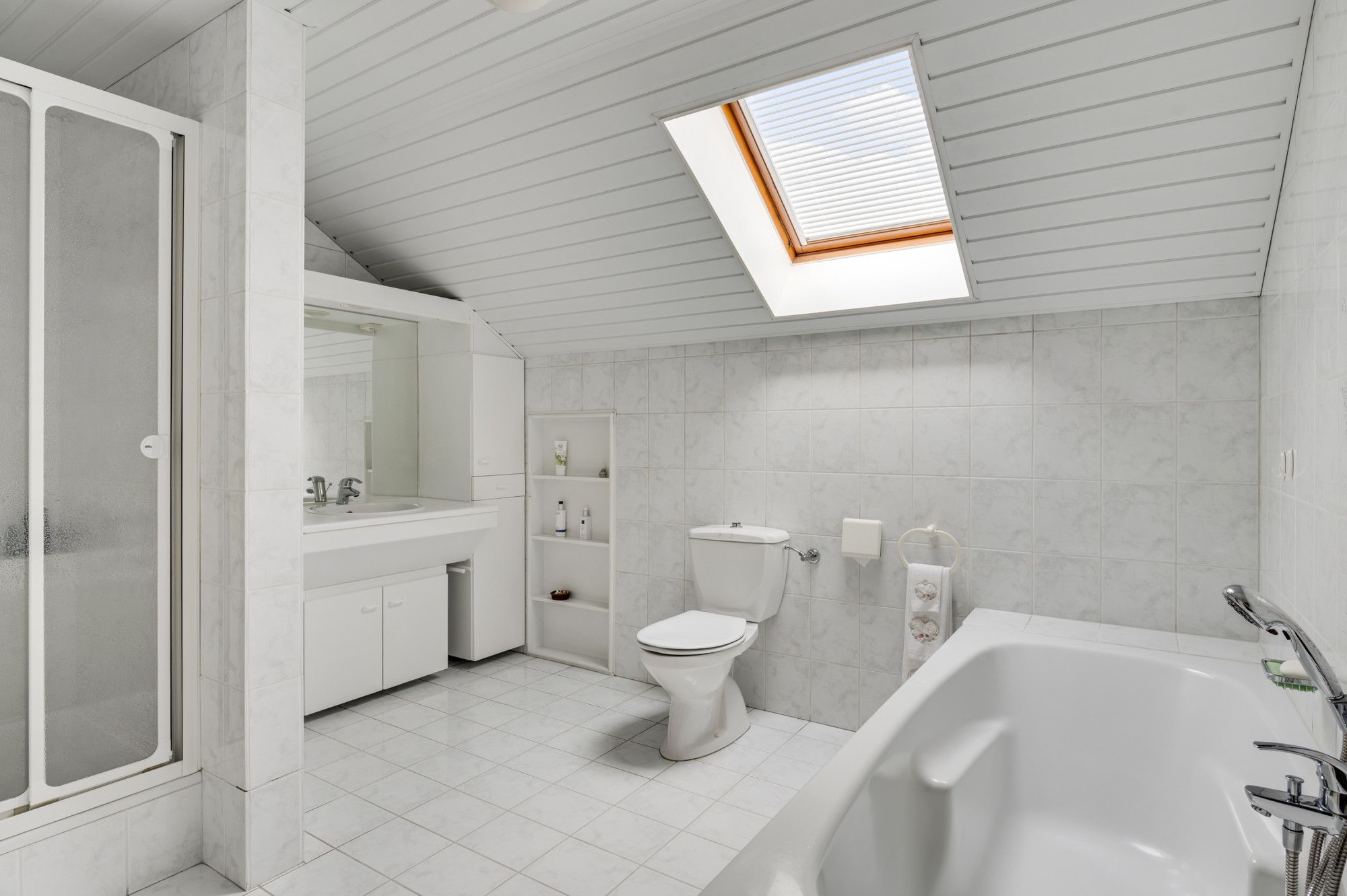 De overloop met vide komt uit op nog 3 (slaap)kamers met op iedere kamer een praktische bergruimte en de hoofdslaapkamer met muurkasten. De nette en ruime badkamer is uitgerust met een douche, ligbad, toilet, wastafel met meubel en een Velux dakraam. Ook de badkamer heeft ingebouwde kasten.