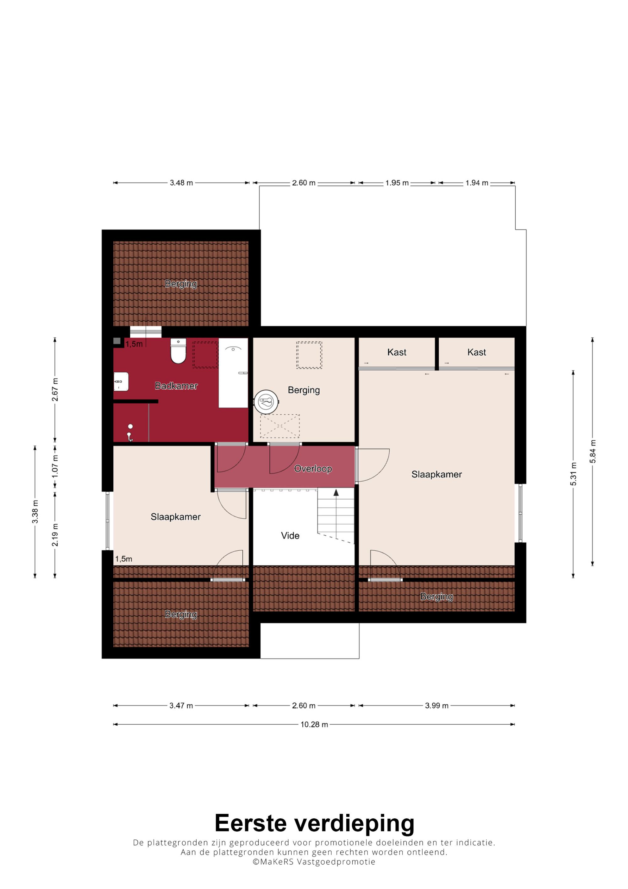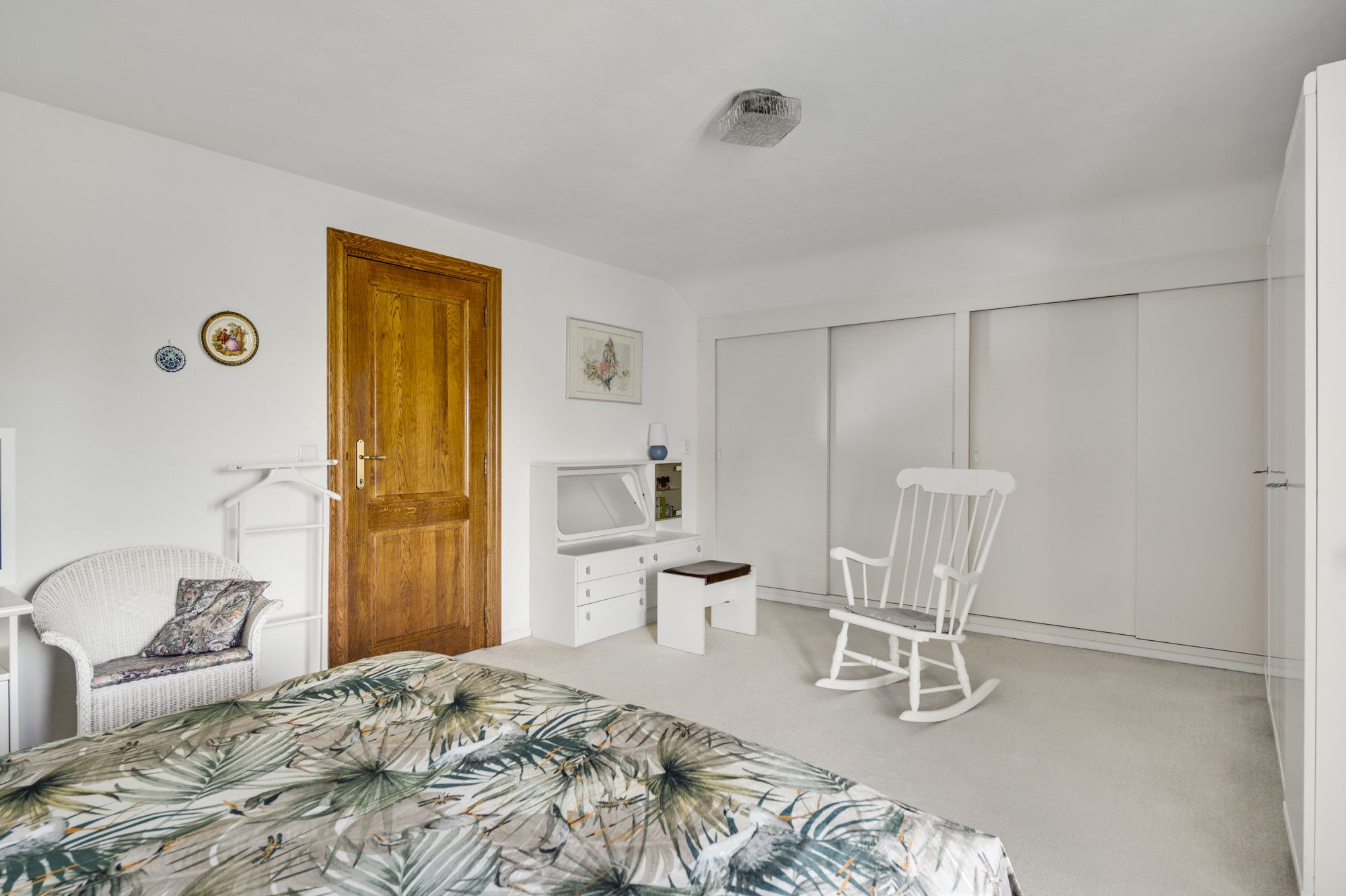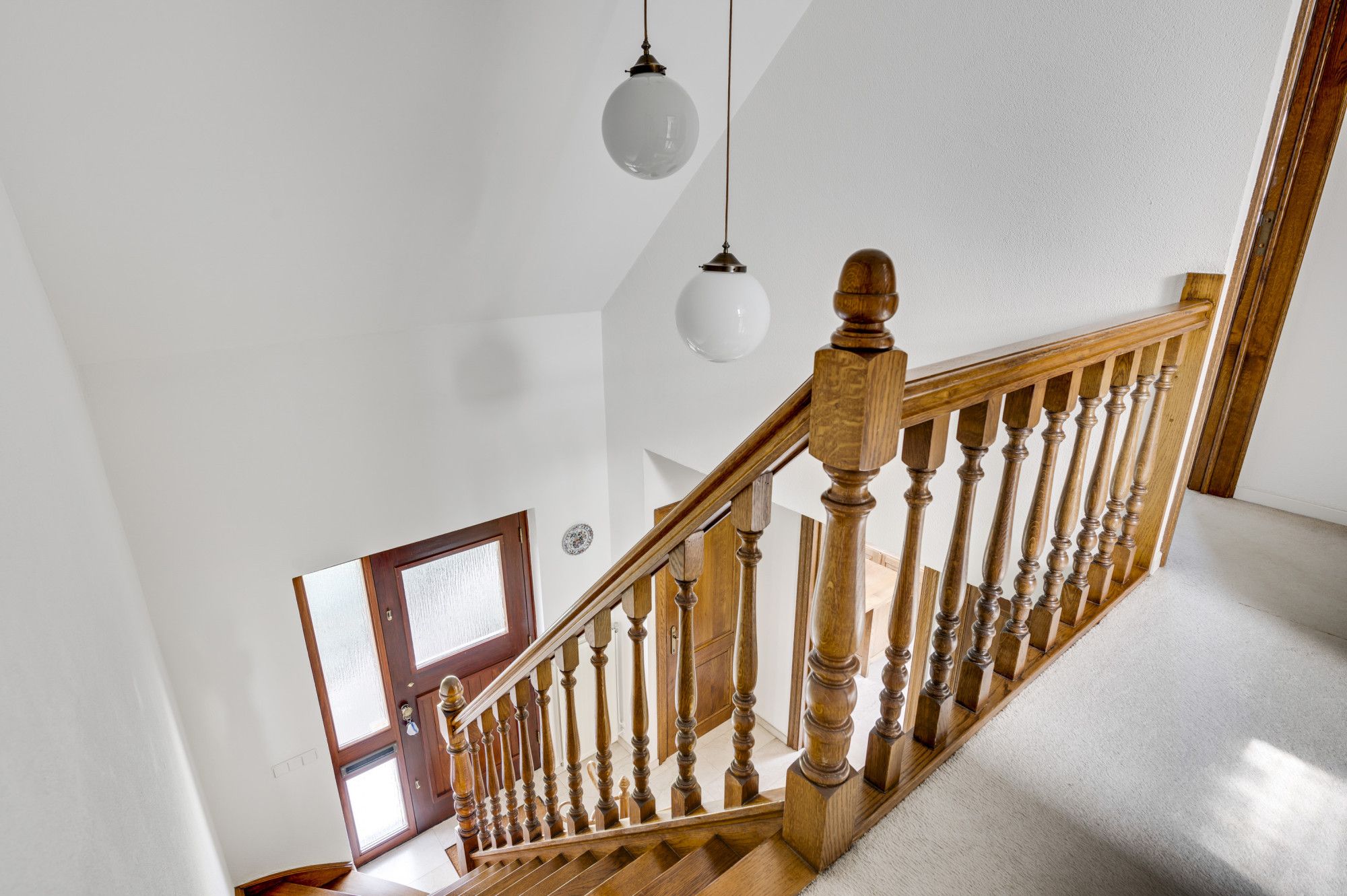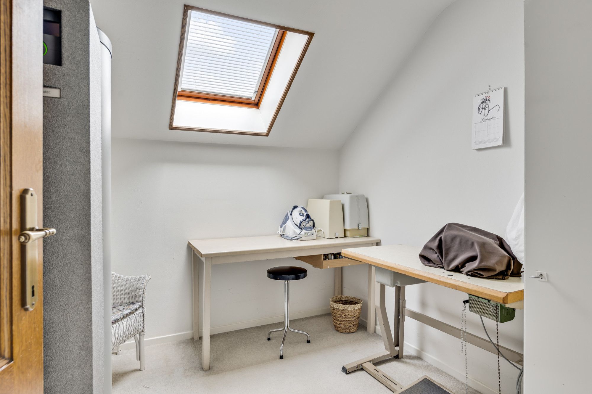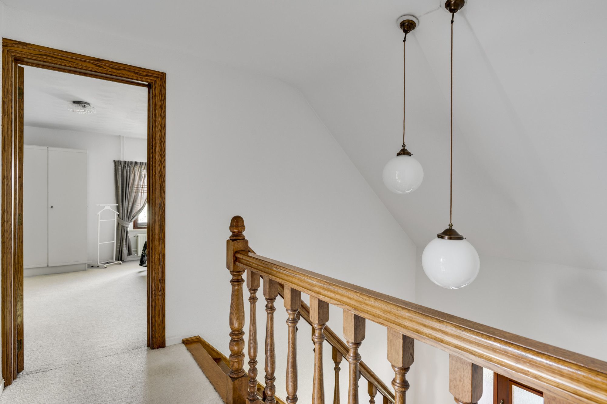 De overloop met vide komt uit op nog 3 (slaap)kamers met op iedere kamer een praktische bergruimte en de hoofdslaapkamer met muurkasten. De nette en ruime badkamer is uitgerust met een douche, ligbad, toilet, wastafel met meubel en een Velux dakraam. Ook de badkamer heeft ingebouwde kasten.