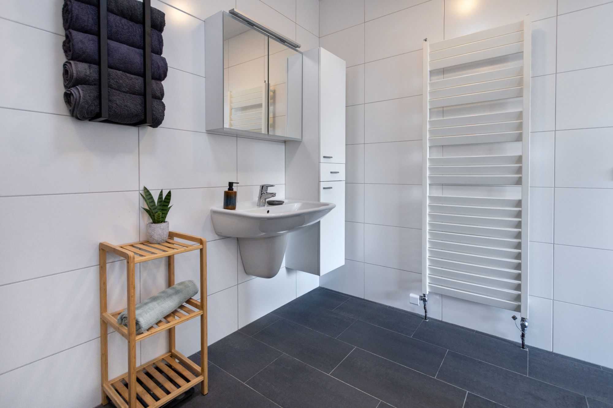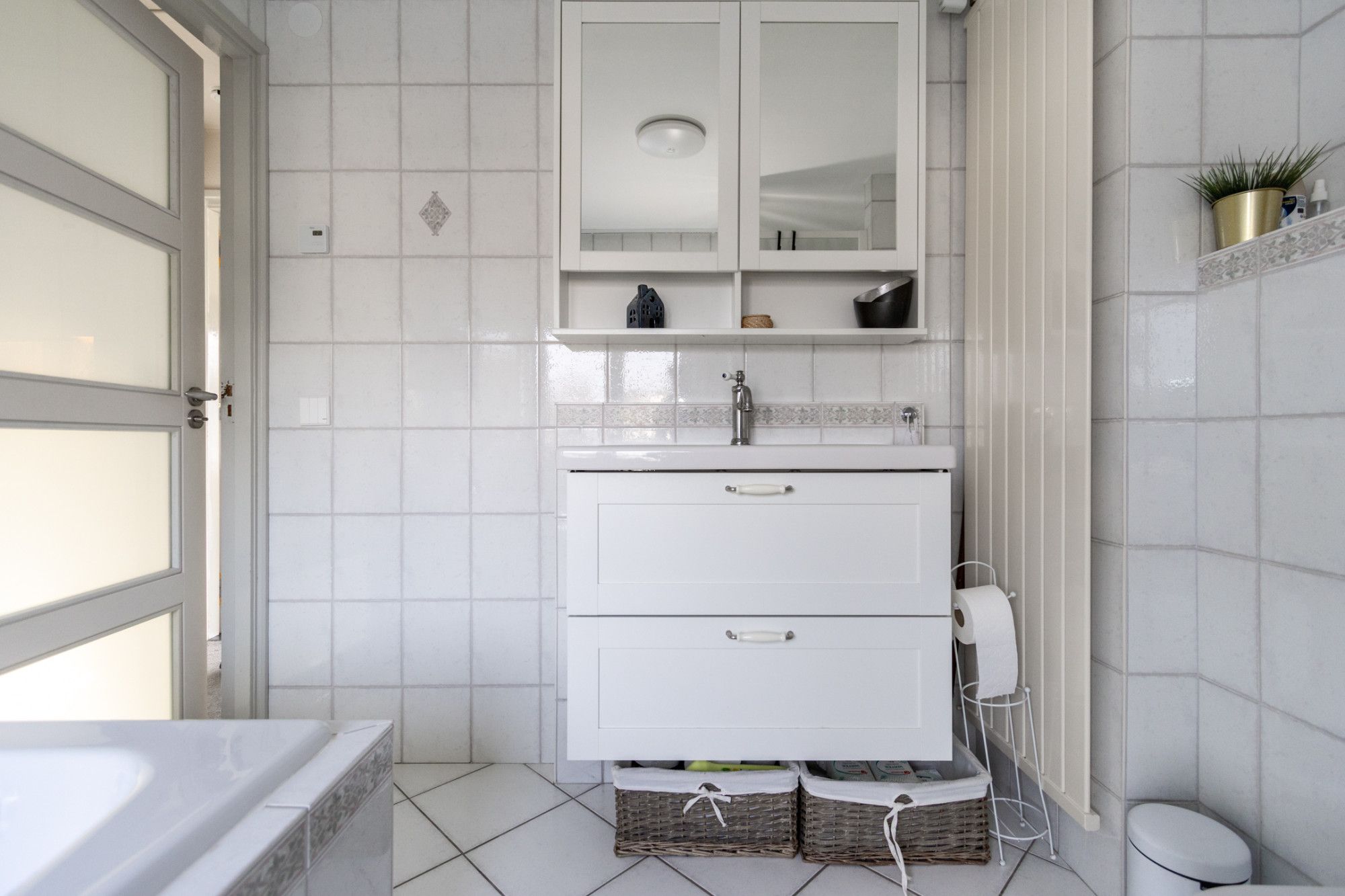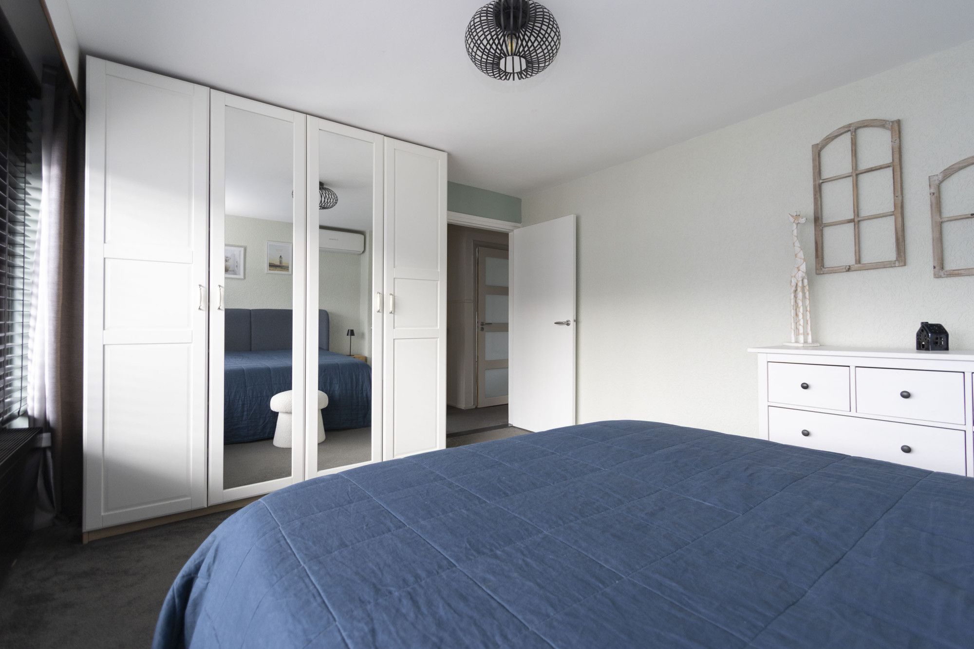 Op de eerste verdieping bevinden zich drie slaapkamers, alle voorzien van vloerbedekking, aluminium kozijnen met HR++ glas, airconditioning en rolluiken. De tweede badkamer is compleet uitgerust met een douche, brede wastafel met meubel en spiegelkast, ligbad en wandcloset. Via een vlizotrap bereik je de bergzolder, waarvan de vloer in 2023 geïsoleerd is. Een ruimte die zich uitstekend leent voor extra opslag.