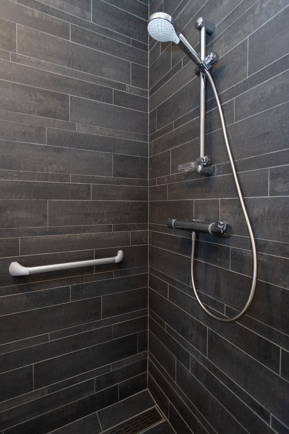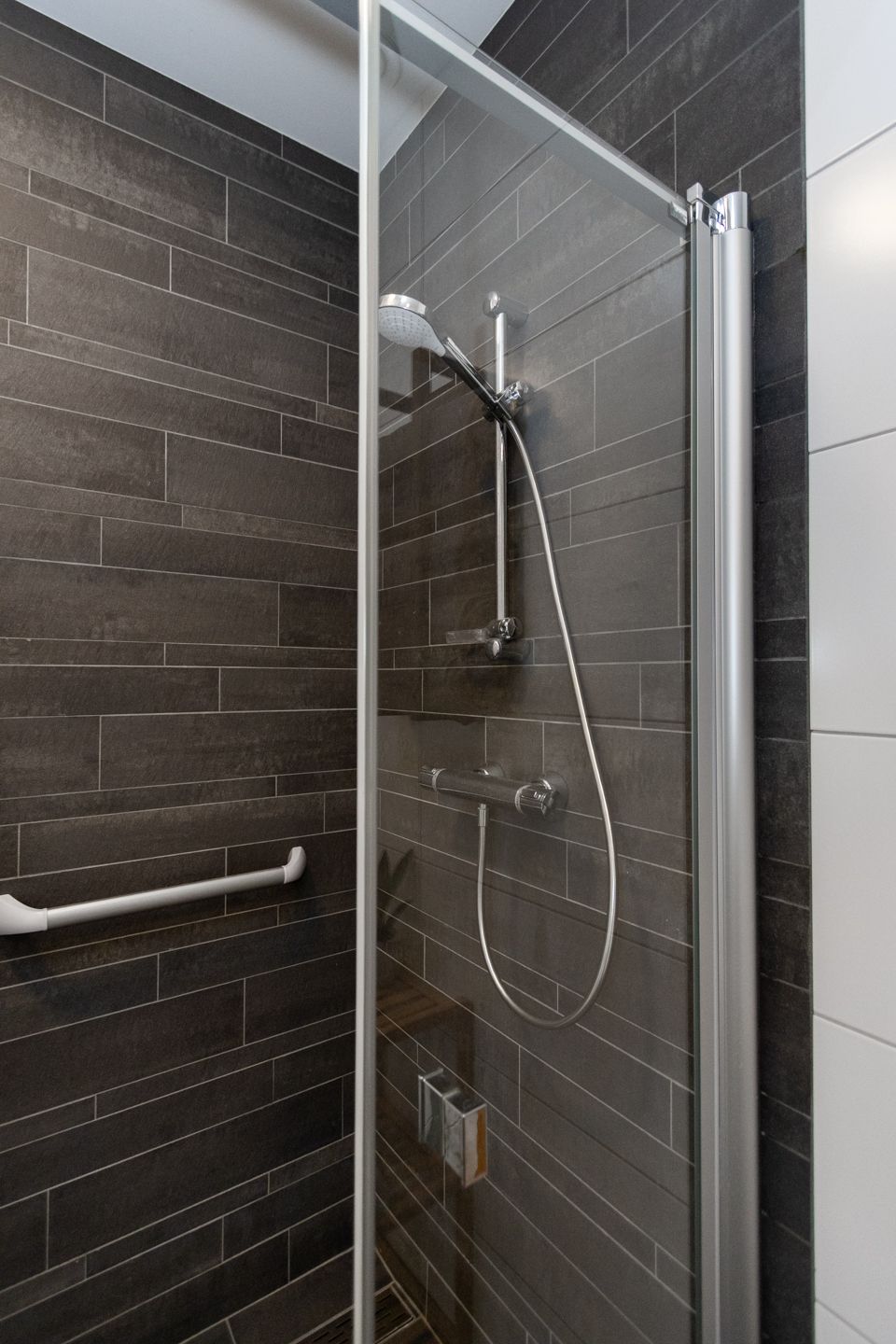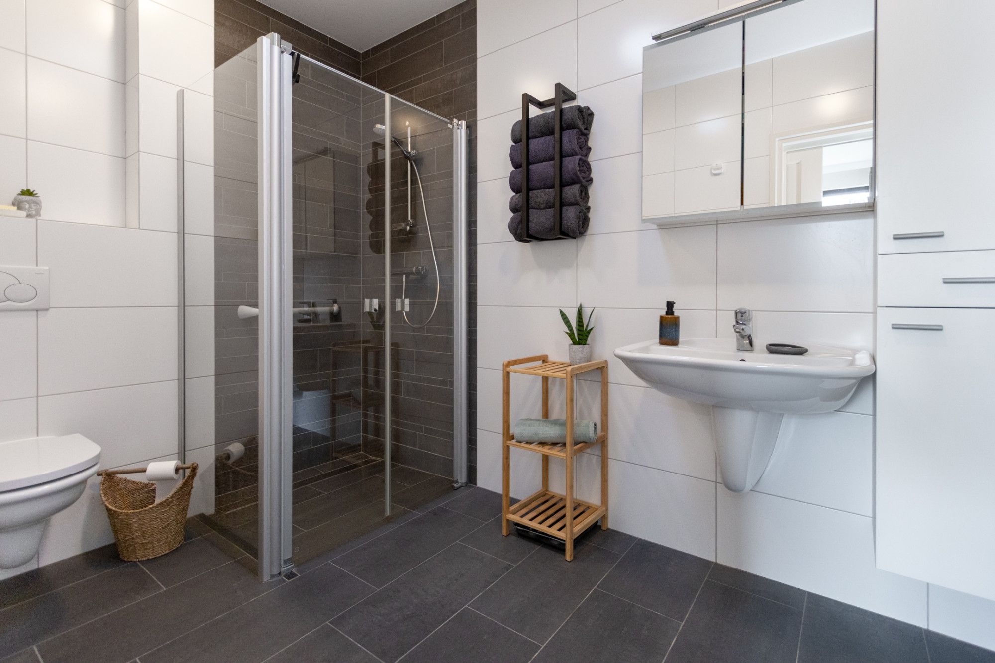 Via het tussenportaal bereik je de slaapkamer en badkamer op de begane grond. Ideaal voor gelijkvloers wonen of als gastenverblijf. Deze kamer beschikt over aluminium kozijnen met HR++ glas, airconditioning en een ruim opgezette en suite badkamer met inloopdouche, wandcloset, wastafel met meubel en spiegelkast, designradiator, vloerverwarming en mechanische ventilatie.