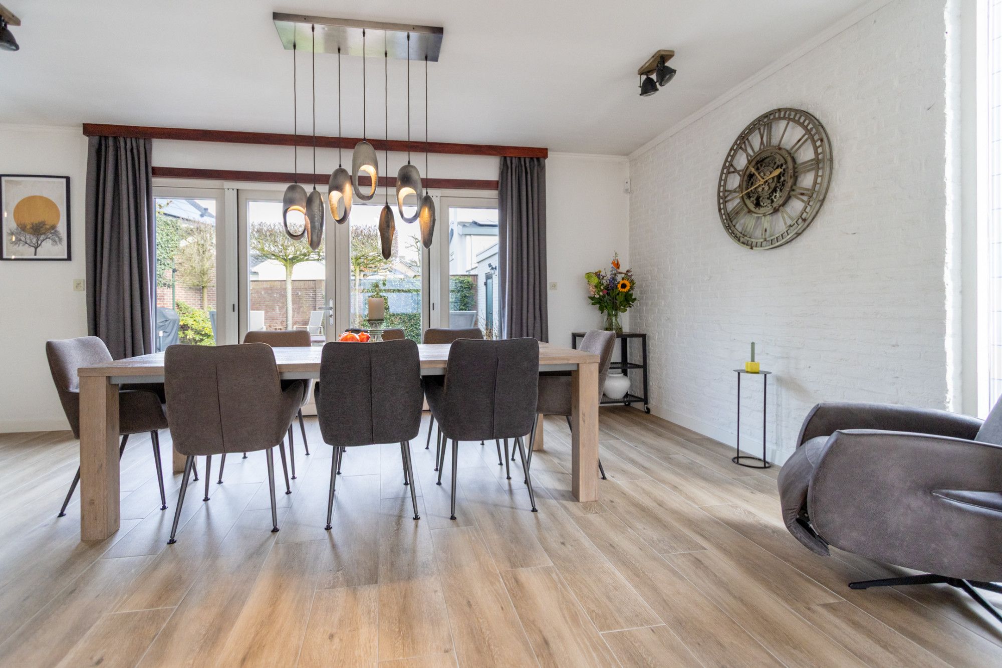 Naast een gezellige eetbar, is er ook een ruime eethoek naast de keuken gelegen. Hier valt veel licht binnen door de grote pui. Deze ruimte staat direct in verbinding met de woonkamer door de doorgang die later gerealiseerd is.