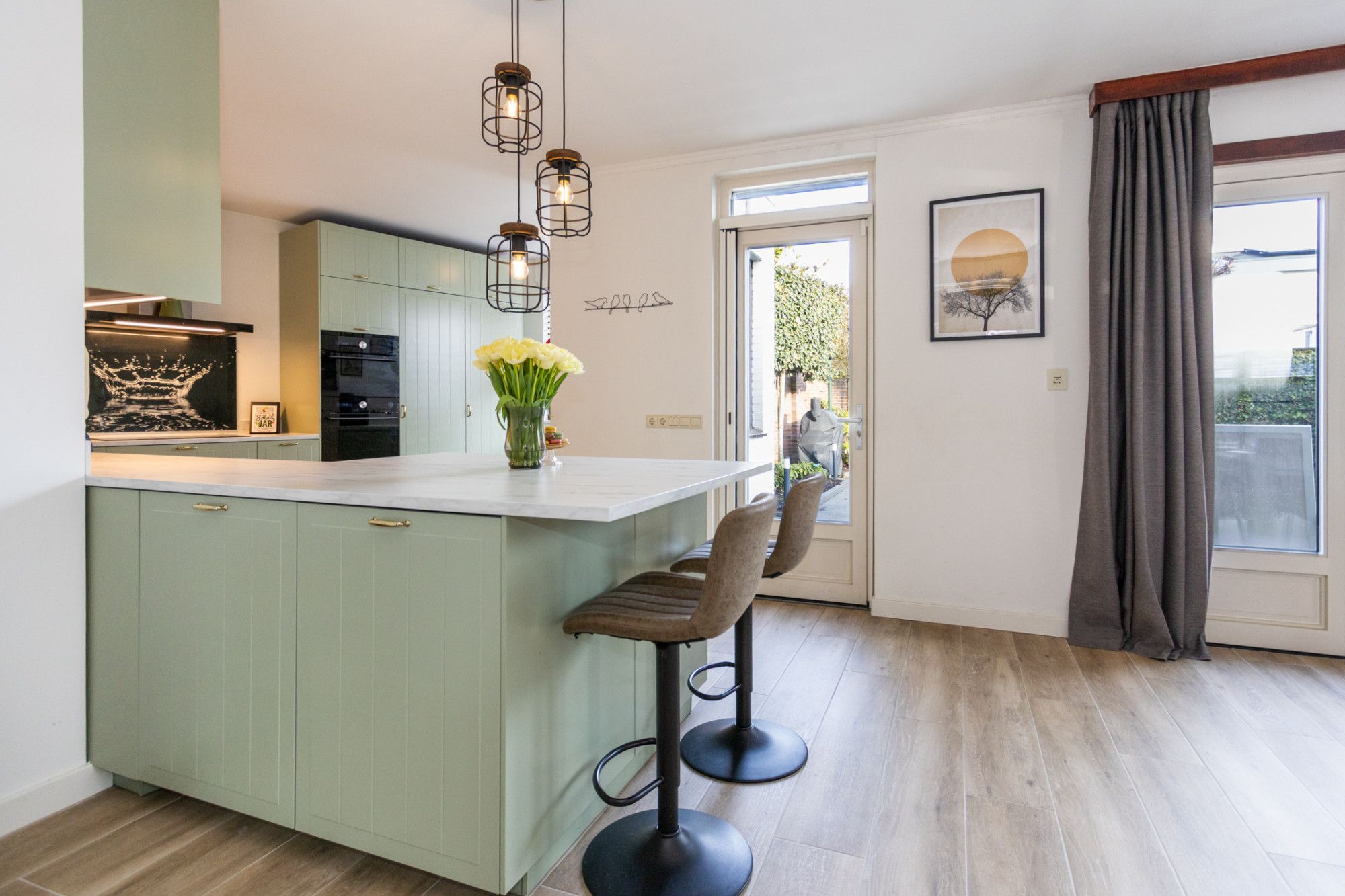 In de aanbouw bevindt zich de sfeervolle eetkamer, uitgevoerd met een brede houten pui en tuindeur voorzien van triple glas. Aansluitend ligt de idyllische keuken in landelijke stijl, voorzien van mintgroene kastjes en een marmerlook werkblad. De keuken is uitgerust met een inductiekookplaat, afzuigkap, vaatwasser, grote koelkast en vriezer, combi-oven, extra oven en Quooker-kraan. Ook is de wasmachine hier geplaatst en voorzien van dezelfde ombouw als de rest van de keuken.