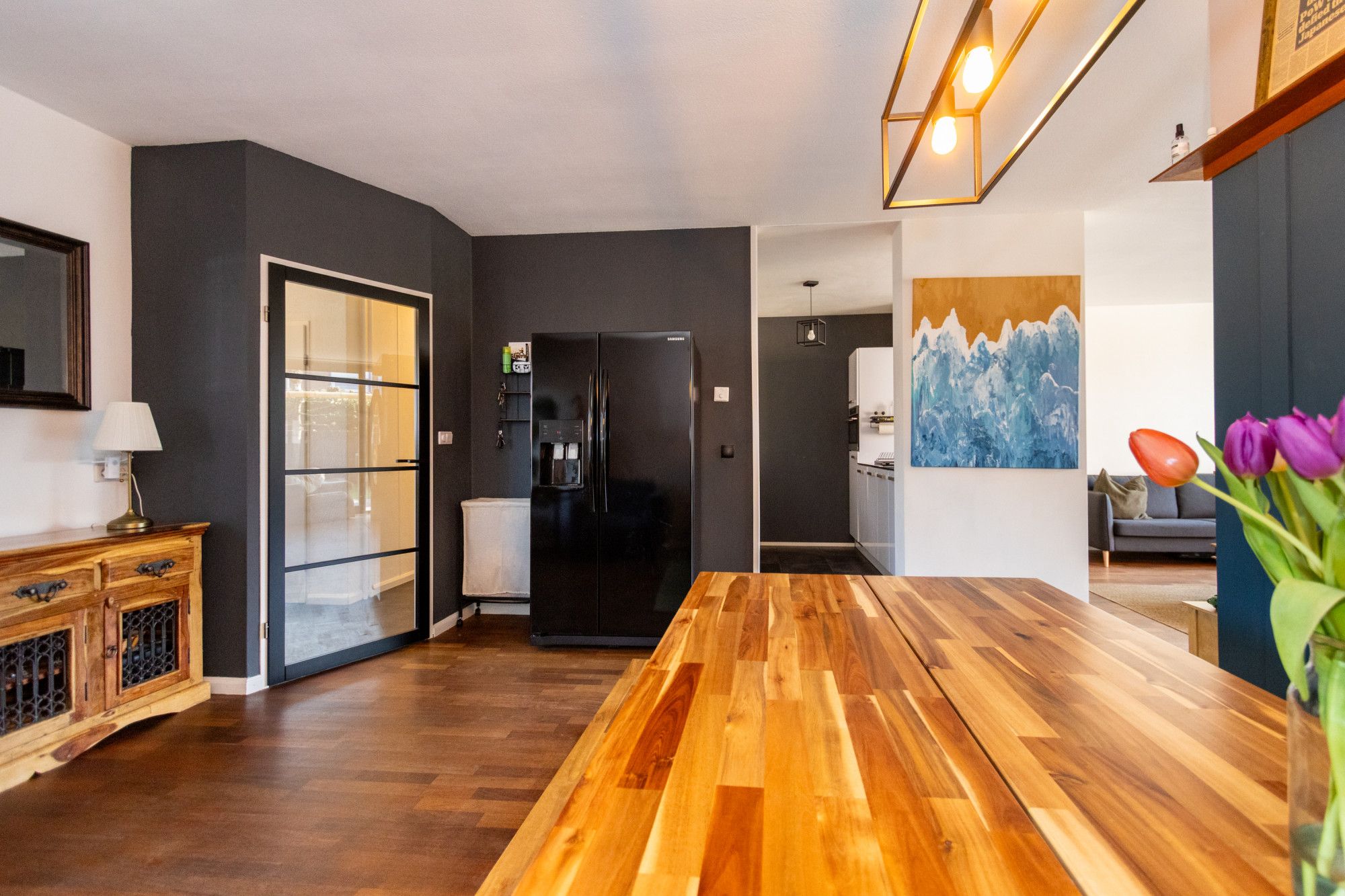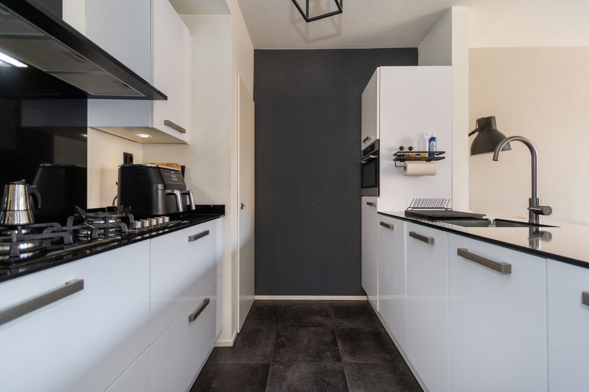 De halfopen keuken is uitgevoerd met een granieten werkblad en voorzien van diverse inbouwapparatuur, waaronder een 5-pits gasfornuis met wokbrander, afzuigkap, vaatwasser en combi-oven. Direct naast de keuken bevindt zich een praktische provisieruimte, ideaal voor extra opslag. Hier bevindt zich ook de toegang tot de droge kruipruimte.