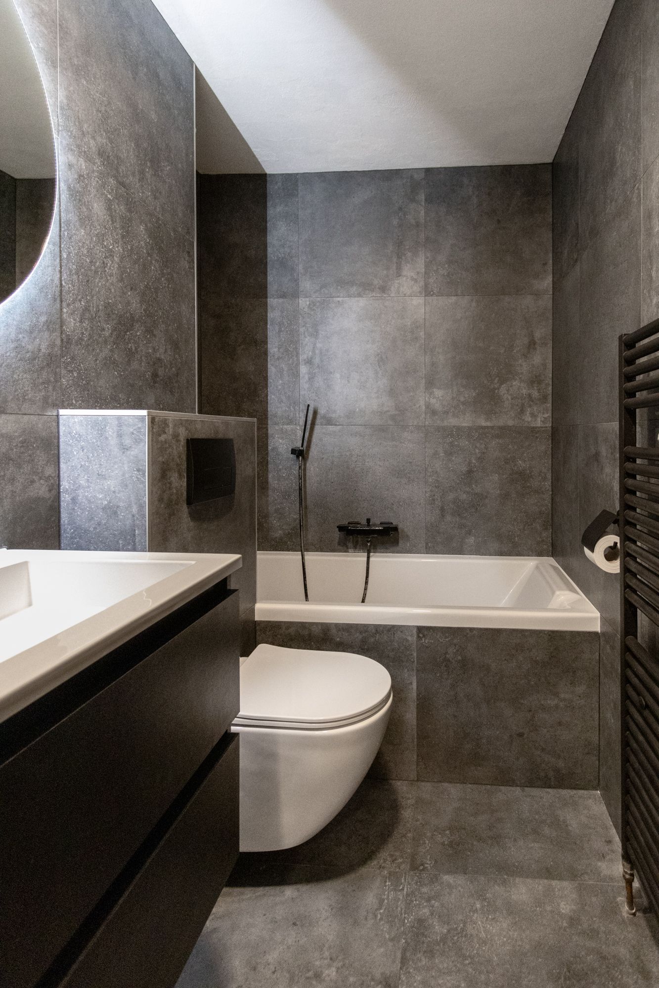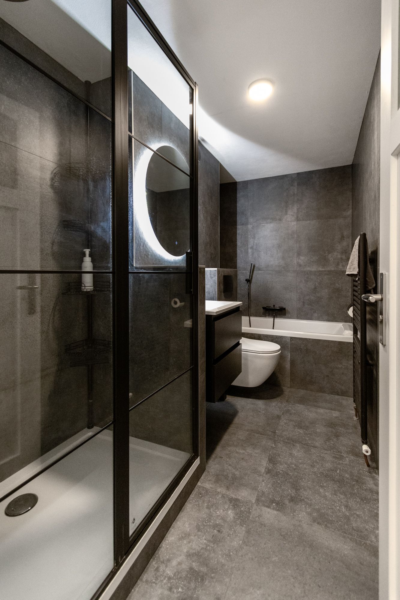 - Vernieuwde badkamer met ligbad, regendouche, wastafelmeubel, toilet en designradiator