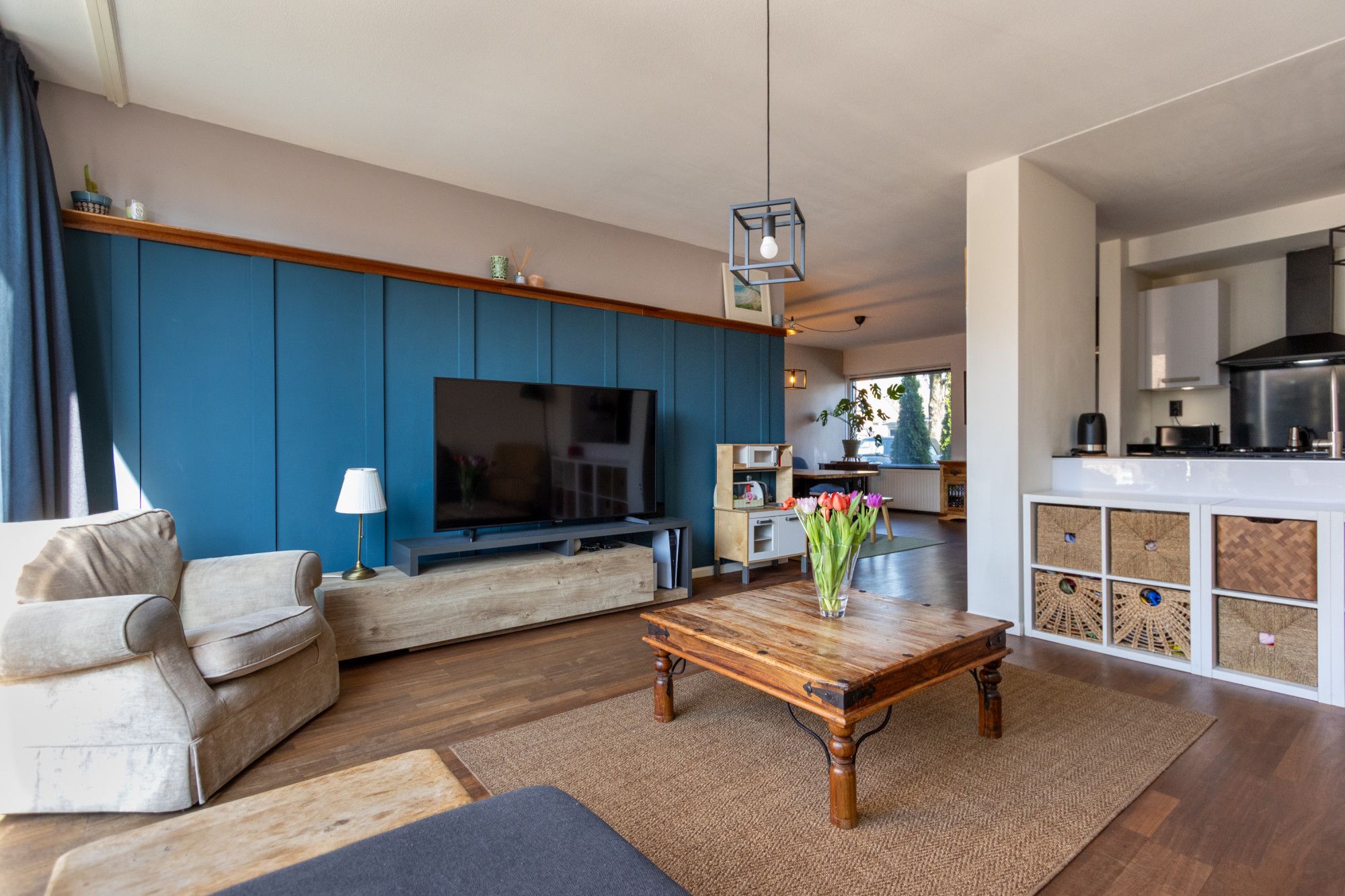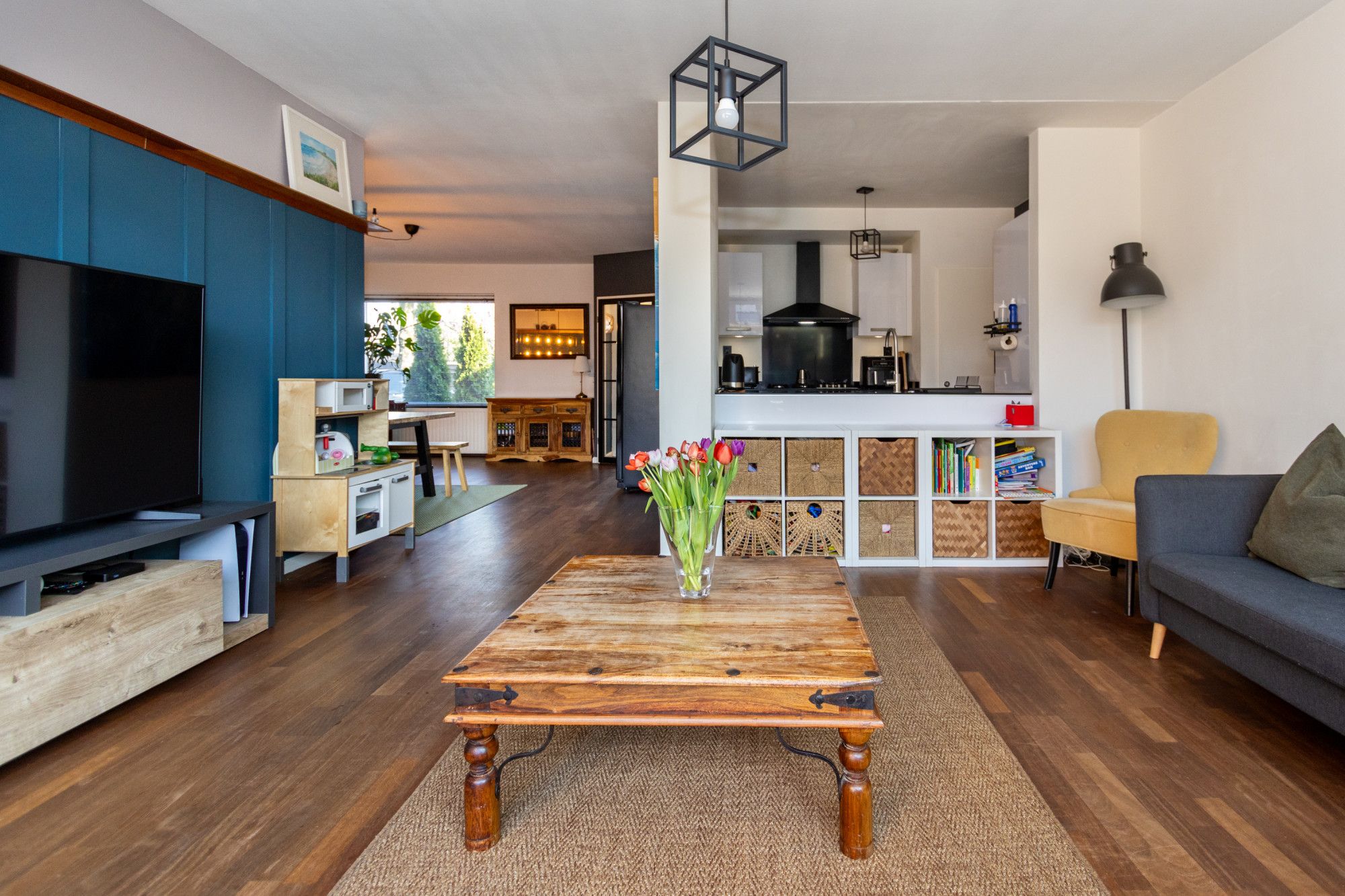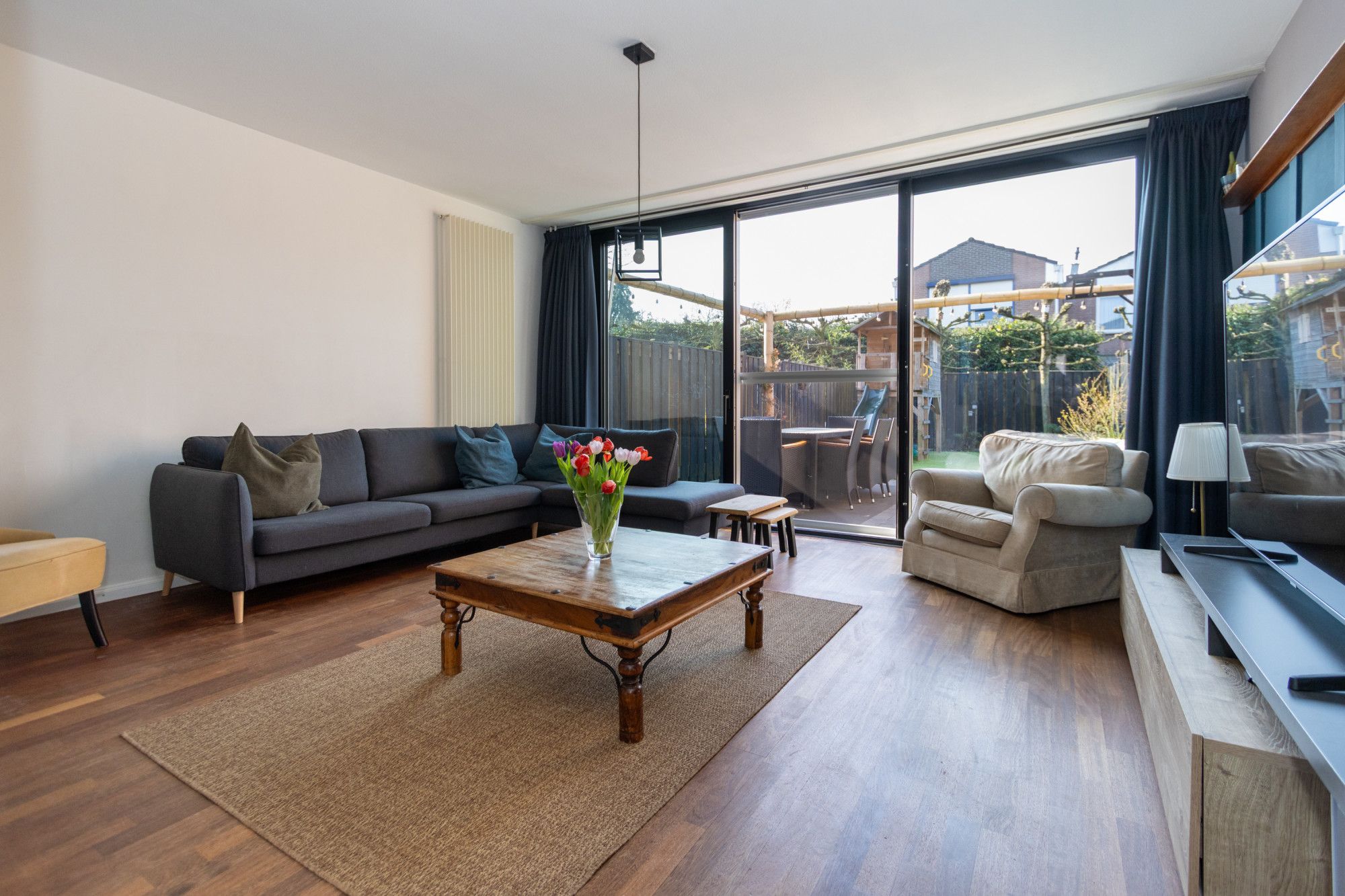 De sfeervolle woonkamer is licht en ruim dankzij de grote raampartijen aan zowel de voor- als achterzijde. De schuifpui met hordeur biedt directe toegang tot de zonnige achtertuin en zorgt voor een fijne verbinding tussen binnen en buiten.