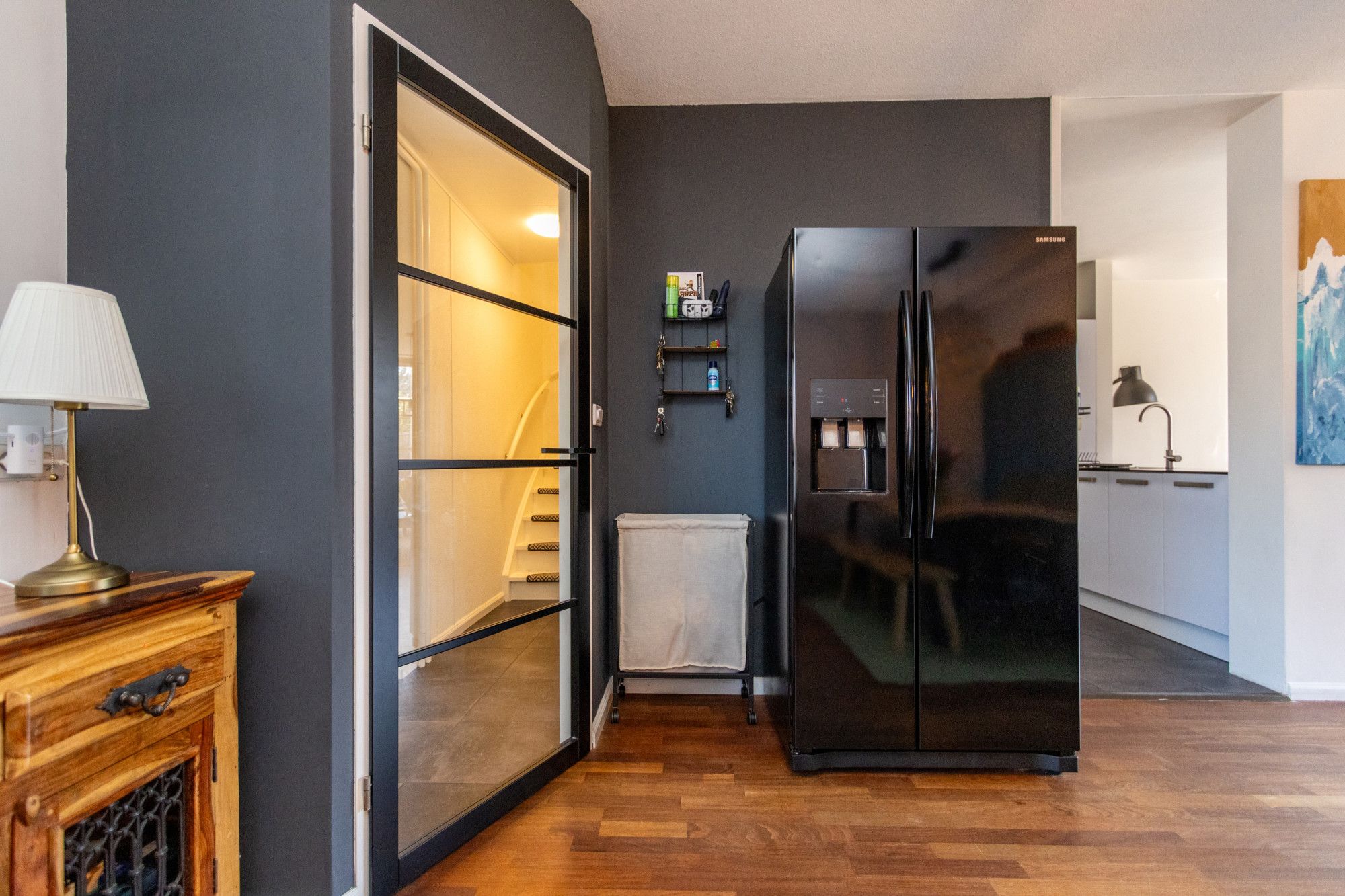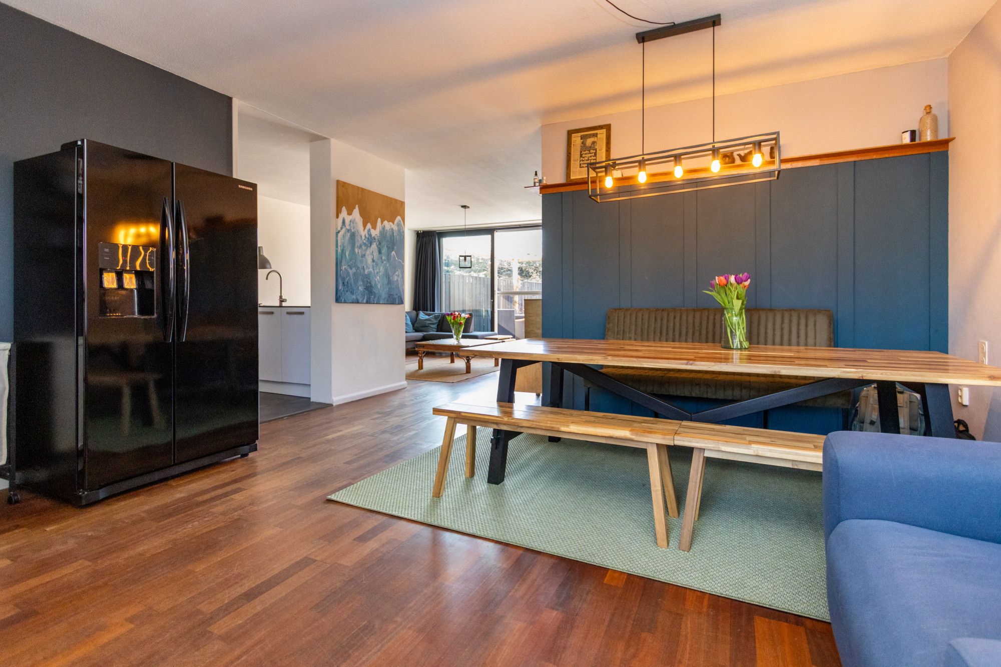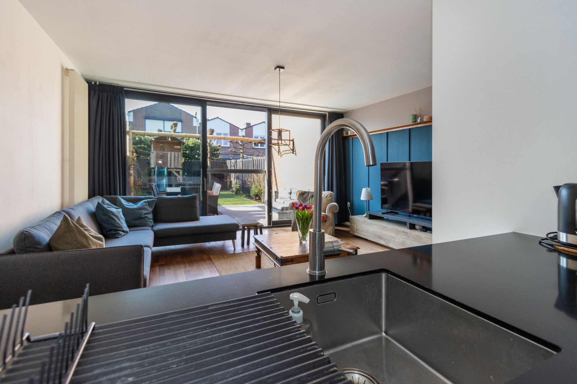 De sfeervolle woonkamer is licht en ruim dankzij de grote raampartijen aan zowel de voor- als achterzijde. De schuifpui met hordeur biedt directe toegang tot de zonnige achtertuin en zorgt voor een fijne verbinding tussen binnen en buiten.