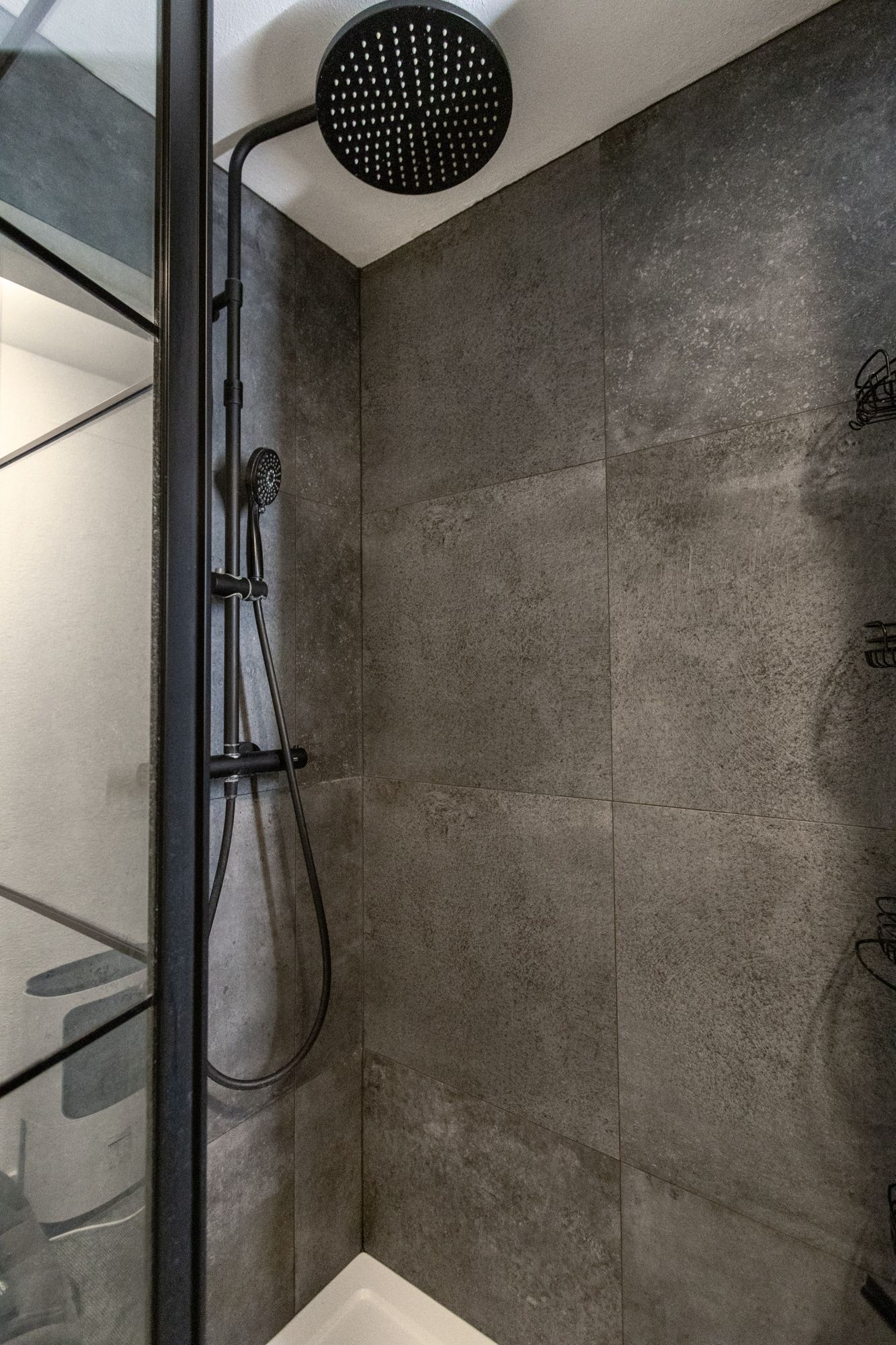 De vernieuwde badkamer (2022) is modern afgewerkt en voorzien van een ligbad, douche met regendouche, wastafel met meubel, designradiator en toilet. Een comfortabele en complete ruimte met een moderne uitstraling.