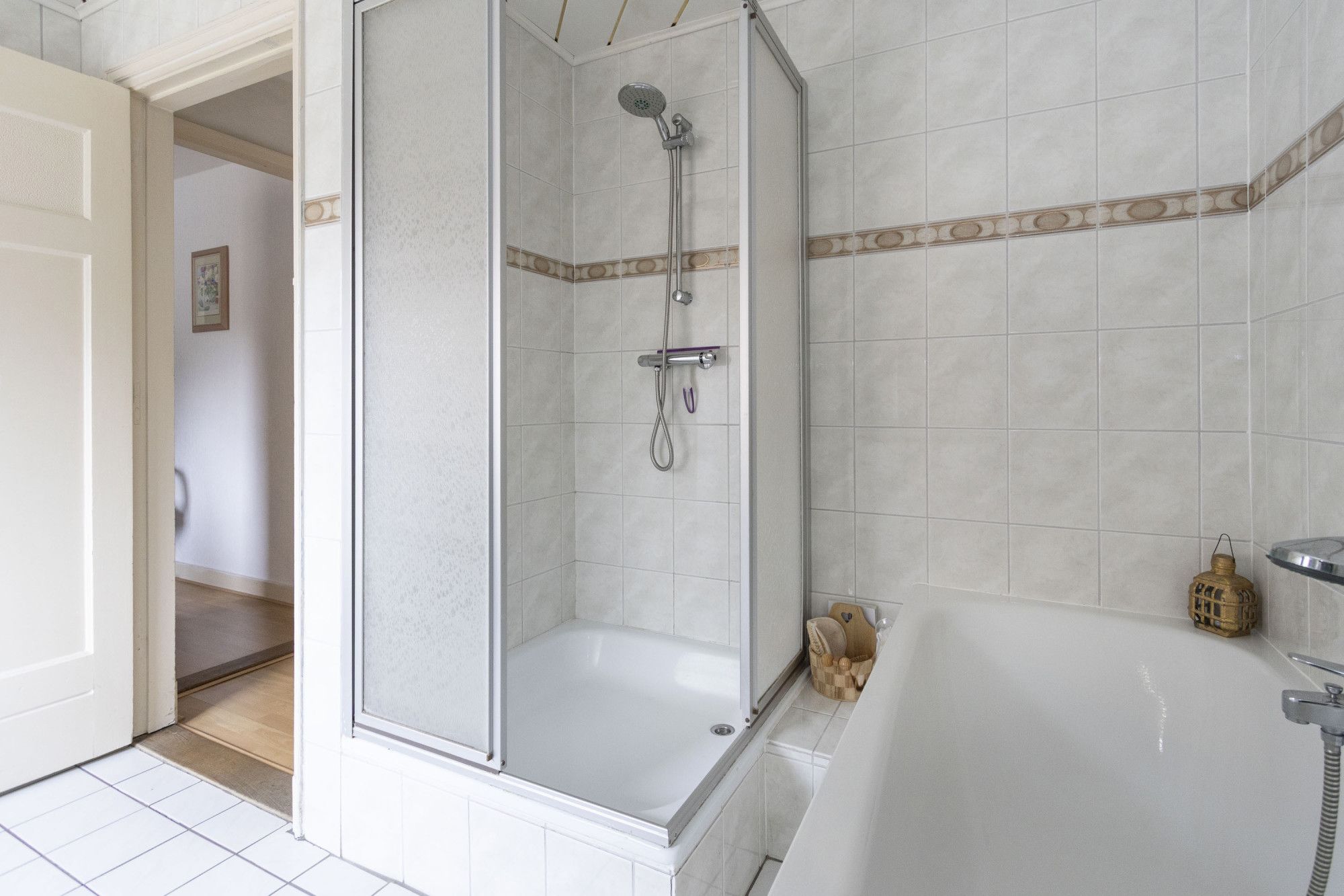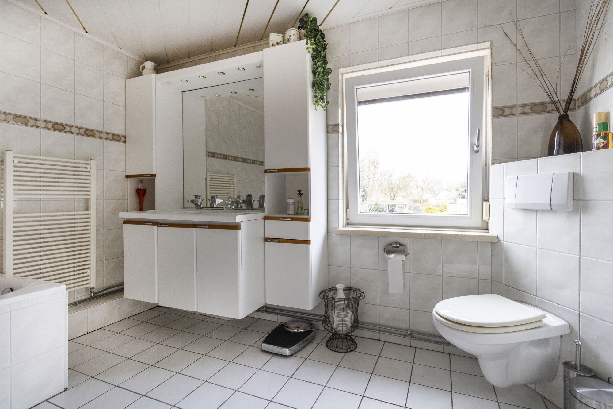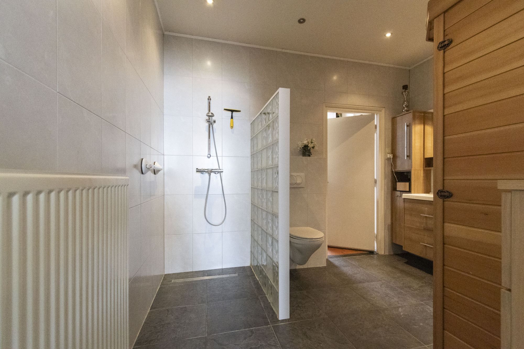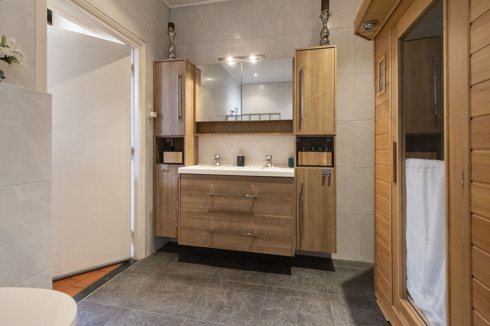 De badkamer op deze woonlaag is compleet met douche, ligbad, dubbele wastafel met meubel, wandcloset en inbouwspots.