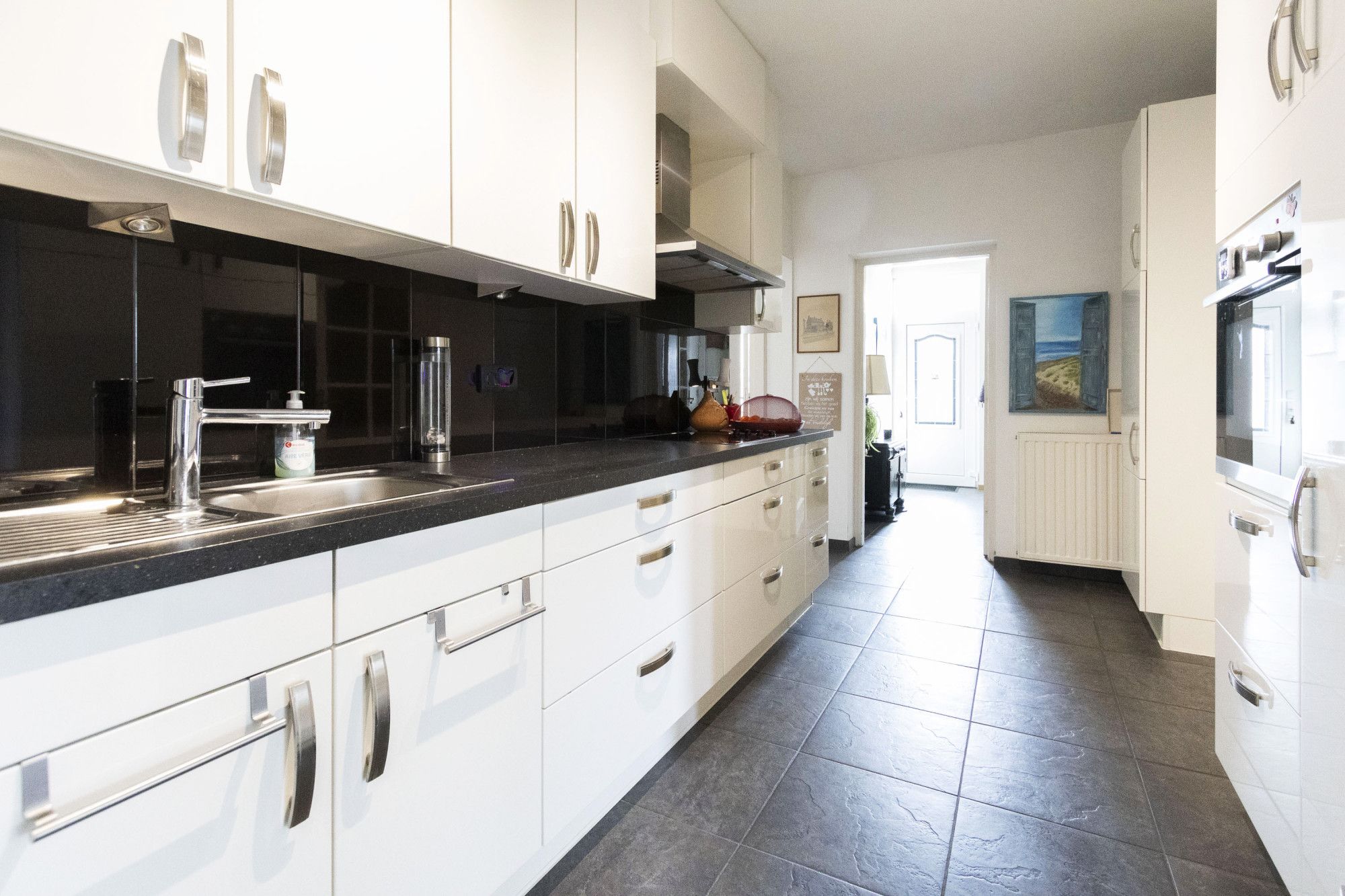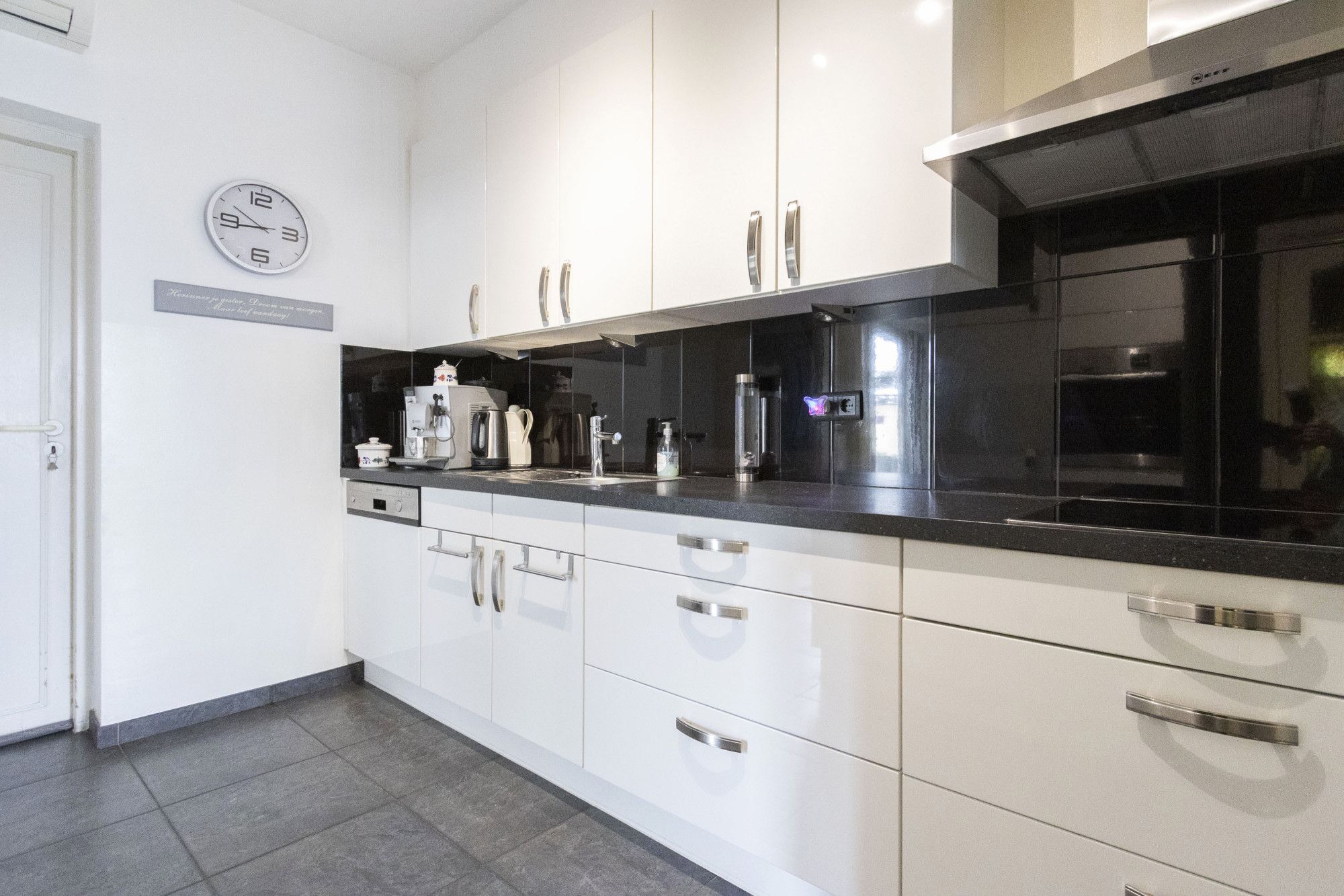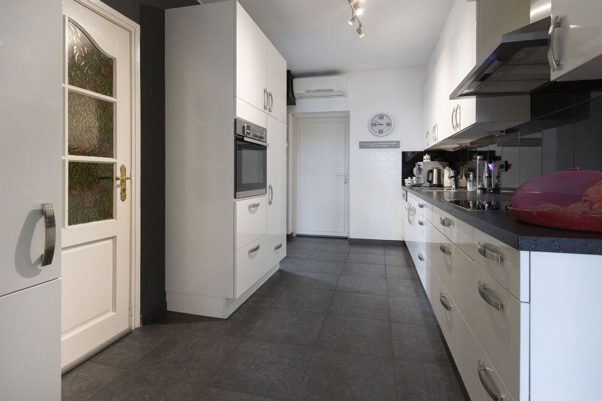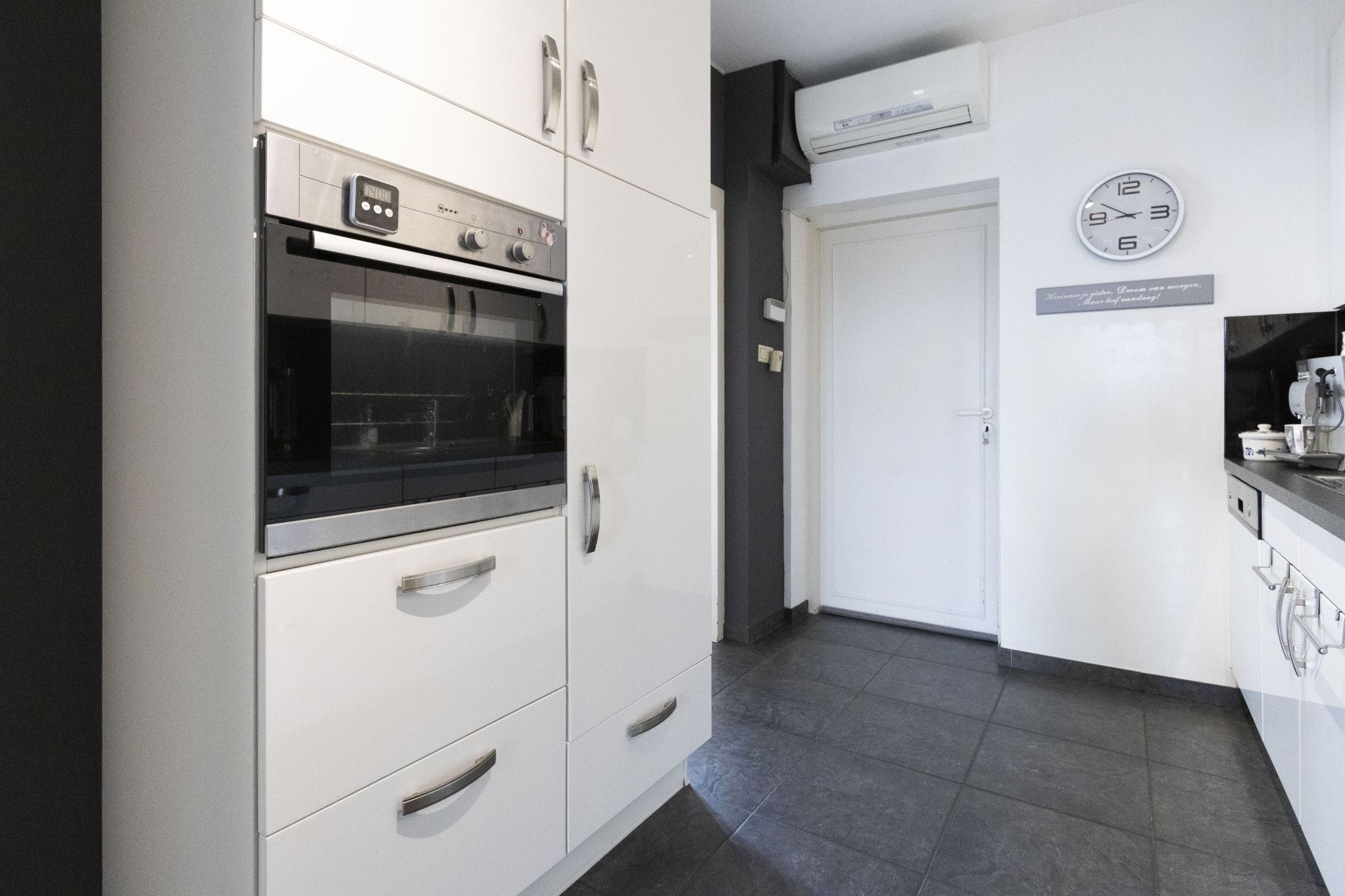 De keuken met witte hoogglans frontjes is uitgerust met diverse inbouwapparatuur zoals een inductie kookplaat, afzuigkap, vaatwasser, combi-oven en koelkast. Naast voldoende kastruimte, wordt deze ruimte ook aangevuld door een aparte airco-unit.