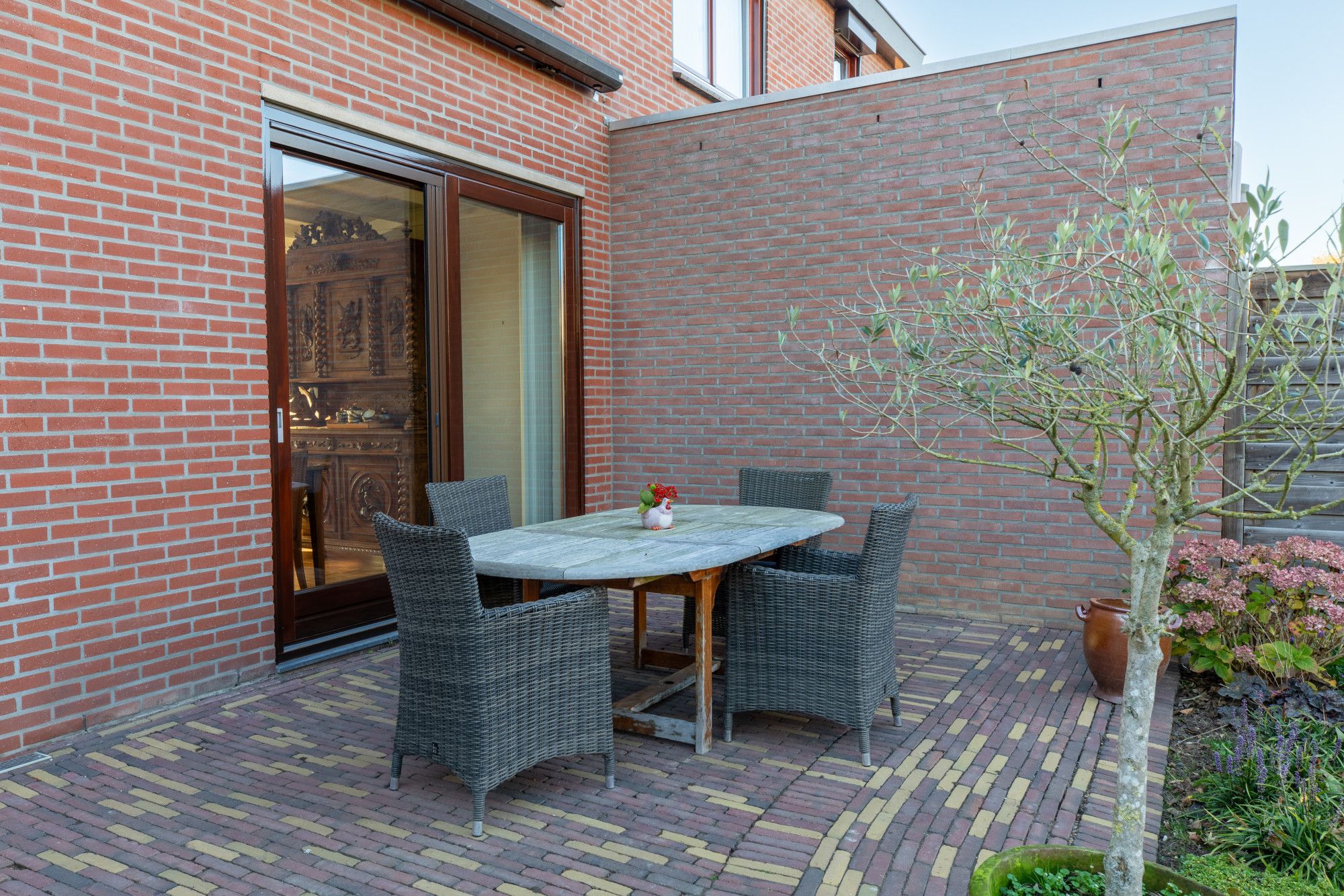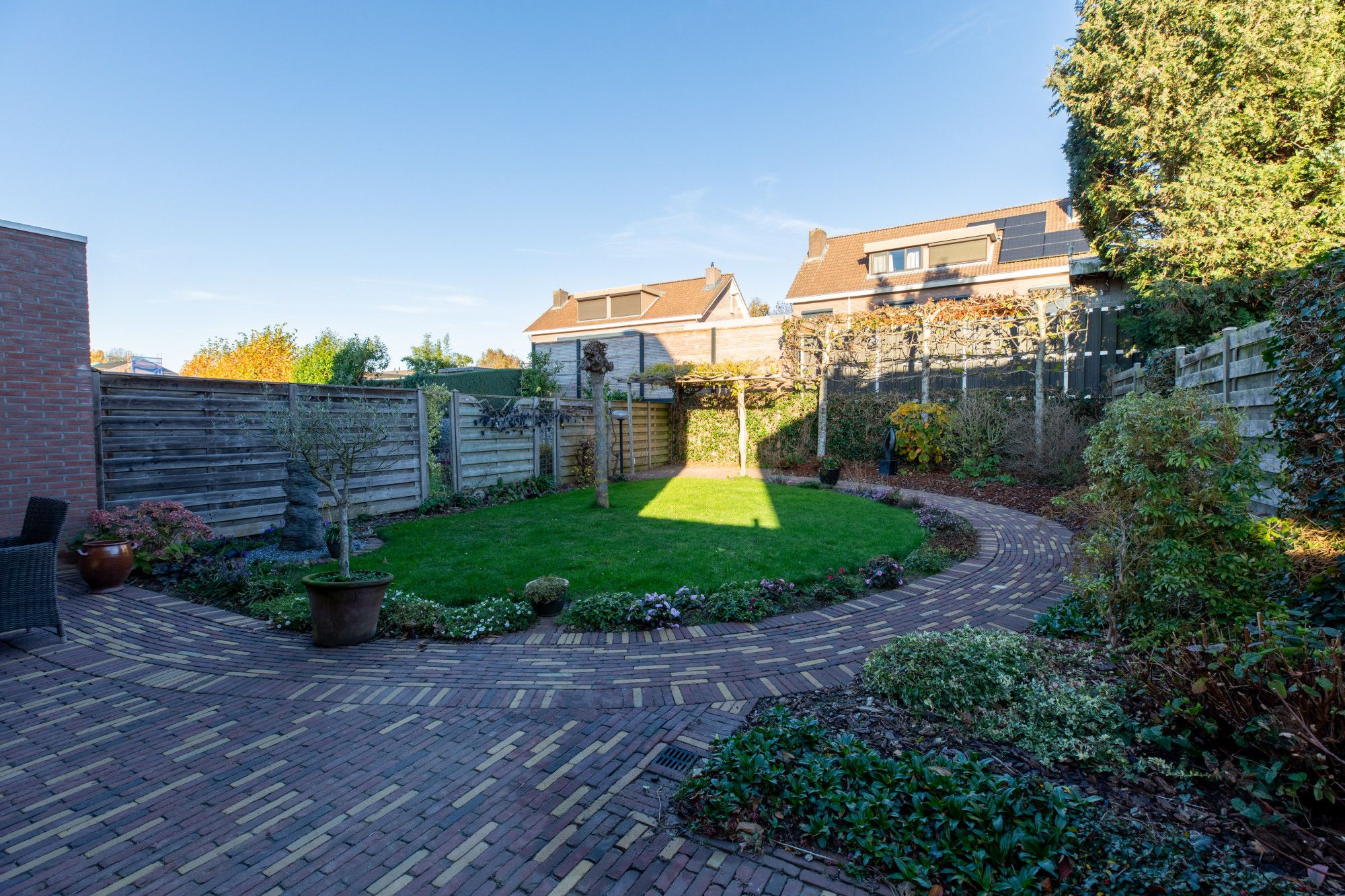 Achtertuin via een o.a. een schuifpui te bereiken vanuit de woonkamer of vanuit de keuken, met geheel omsloten achtertuin met zonne uitvalscherm, gazon, aanplanting en zijdeur. De tuin biedt veel privacy.