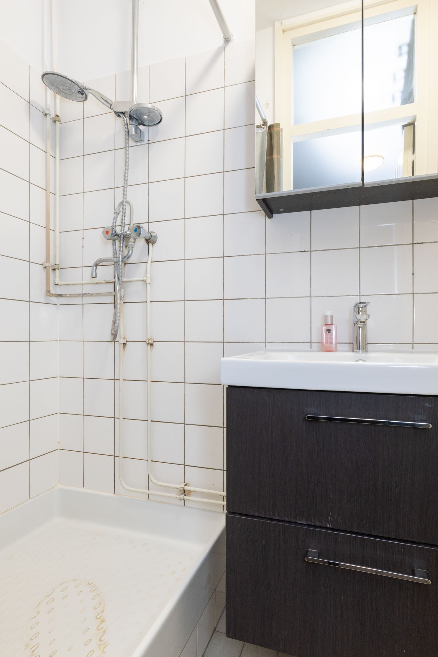 Geheel betegelde badkamer (2,45m x 1,09m) met bad, wastafelmeubel met wastafel en 2e staand toilet.